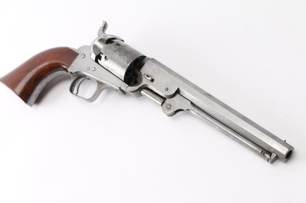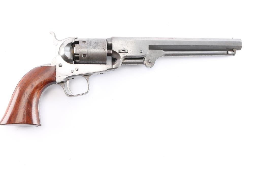 Early Colt single action percussion revolver manufactured 1854. Features one piece walnut grip, 7.5" octagon barrel, brass cone front sight, "V" notch rear sight on hammer nose, 6 shot unfluted cylinder with naval battle scene and "Engaged 16 May 1843". (Second Battle of Campeche). Top barrel flat marked "Address. Col. Colt. London". Left frame marked "Colts Patent" . The serial number is matched on the frame, triggerguard, grip strap, wedge, cylinder, loading lever and the cylinder spindle (also called the arbor pin). There is a small "P" stamped on the rear of the cylinder, "7" on the butt, "W' and "R" on the face of the recoil shield and "J" and "*" on the cylinder face. ( Sub-Inspection Letters ?) The revolver lacks any British proofs. A London Address Colt 1851 Navy revolver without British proofs is extremely rare, as the proofs were a legal requirement in London. Such a firearm would likely be a New York-produced revolver imported for the UK market without the necessary final inspection or simply a gun that never saw final inspection before export to another territory, such as Canada. Another explanation is Around 25,540 were contracted by the British Board of Ordnance for the Crimean war (1853-56) and some were rushed to to the war without proof testing. The bore is fair to good, bright, strong rifling with some areas of scattered light pitting, the revolver is the white, has been cleaned at some point, all the marking are crisp/clear, the grips id very good, has been varnished, the action works well. The two rear grip frame screws and one of the loading lever screws appear to be new replacements. An interesting revolver with a story to tell.