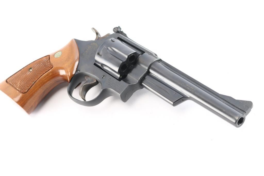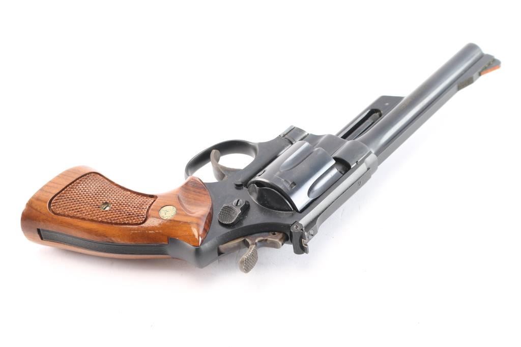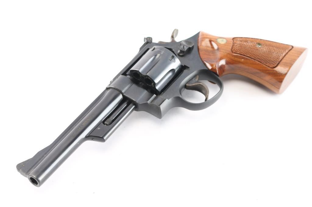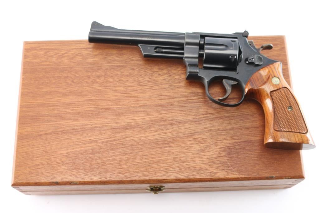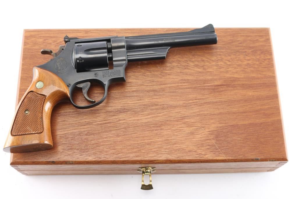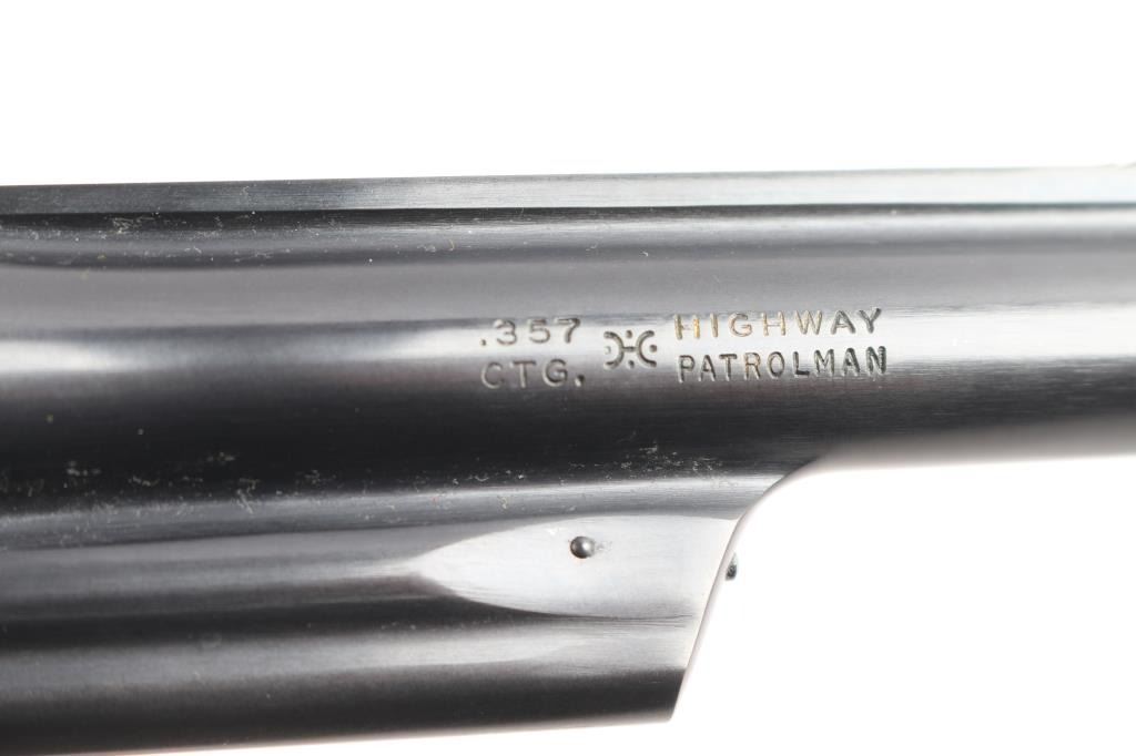 The Highway Patrolman" is a DA/SA revolver with pinned barrel & recessed cylinder for cartridge rims. Manufactured circa 1974-77. Built on the square butt N target frame with 5 screws. Features service grade blued finish, case colored hammer & trigger, checkered walnut Magna grips with S&W medallions, 6" pinned barrel, 3/4 length under lug, serrated raised ramp front sight, adjustable rear sight, serrated wide trigger, wide knurled hammer spur, and fluted cylinder. Bore is excellent/bright. Blue is about 98% with minor scratches, slight muzzle/edge wear, feint tracking on the cylinder. Grips are excellent. Action is smooth/tight. Comes in a wooden display case, form fitted. was lined with blue felt but most of the felt has deteriorated, needs to be relined.