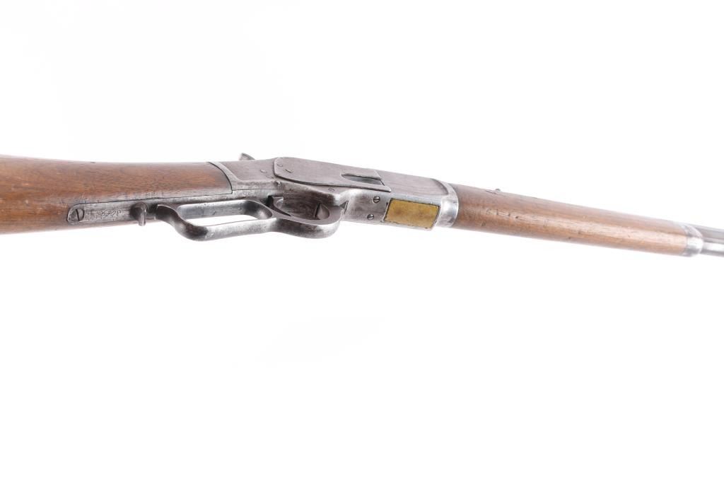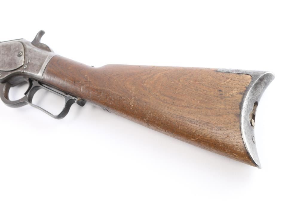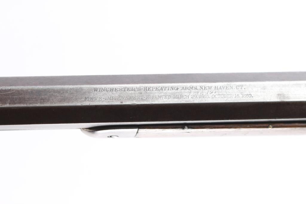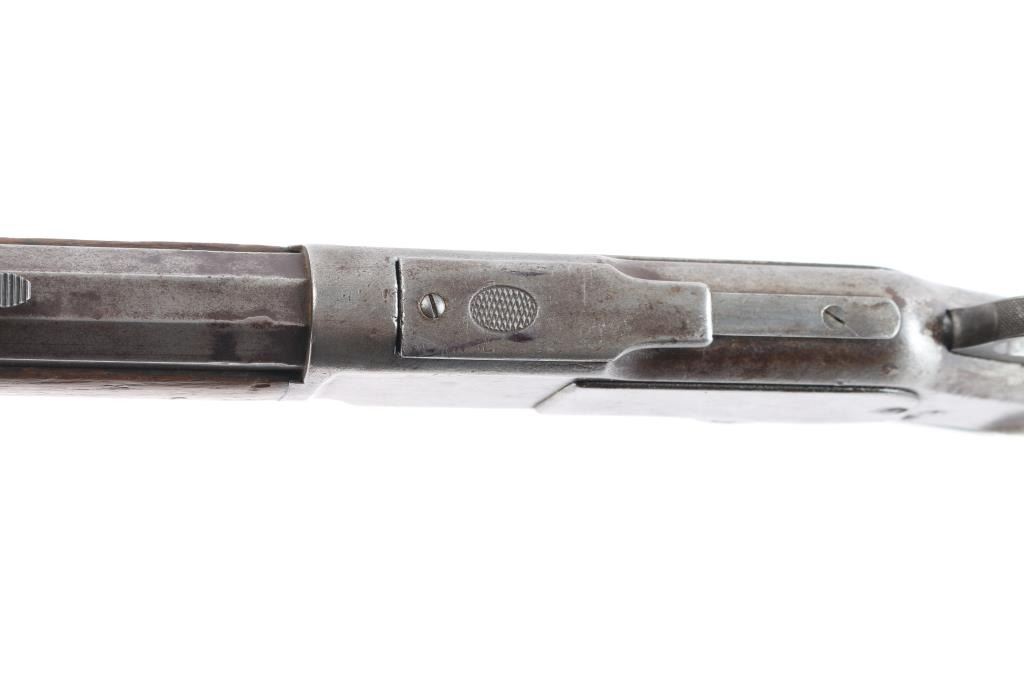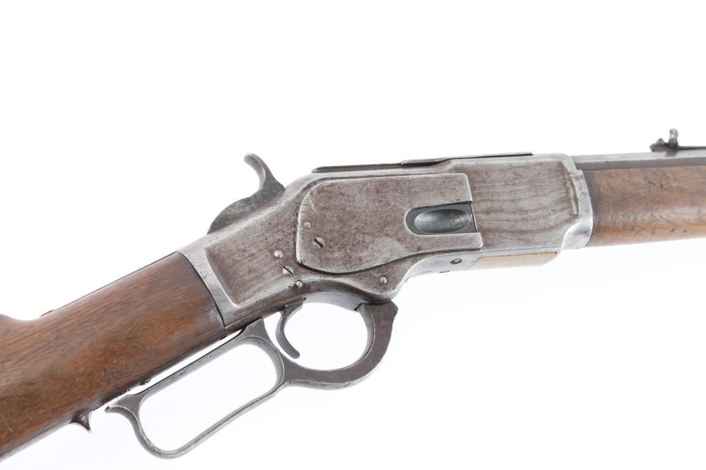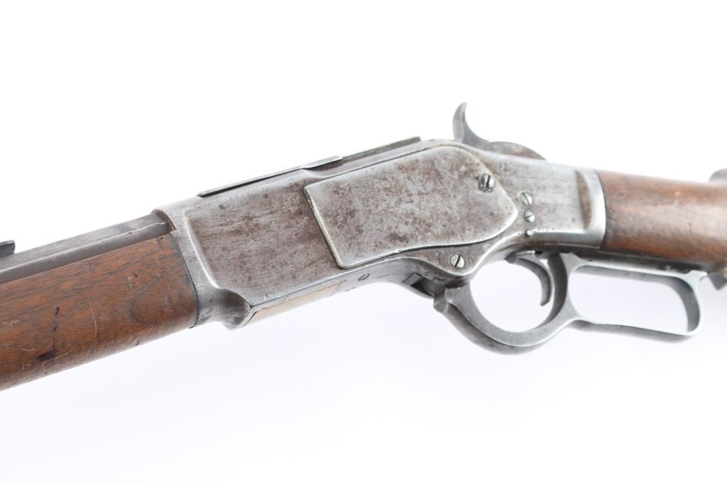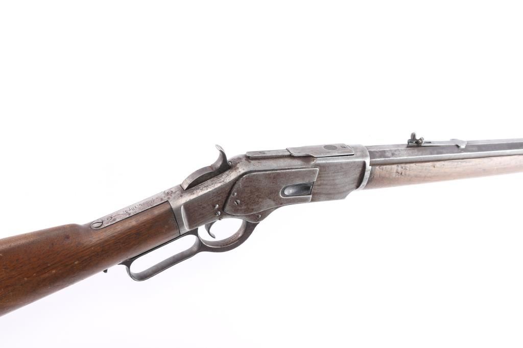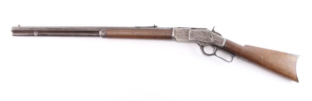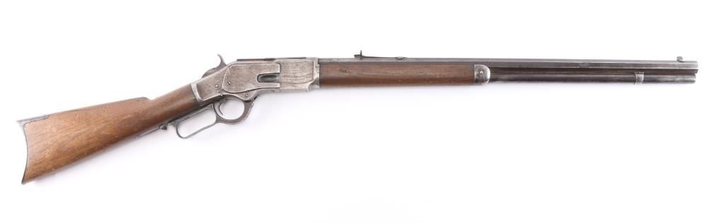 1873 Winchester, 2nd Model rifle in 44-40 caliber, 24" octagon barrel, full magazine, rifle butt. Good overall condition with patina finish and some hints of finish within the brown to gray patina. Good markings and clear address, sights changed but in correct dove tails. Original thumbprint dust cover. Action working but "sticky". Bore shows wear and use but still strong lands and grooves. Great wood to metal fit with honest wear and drying out light color to butt. A 7 on 1-10 grading scale for an early '73. Manufactured 1878.