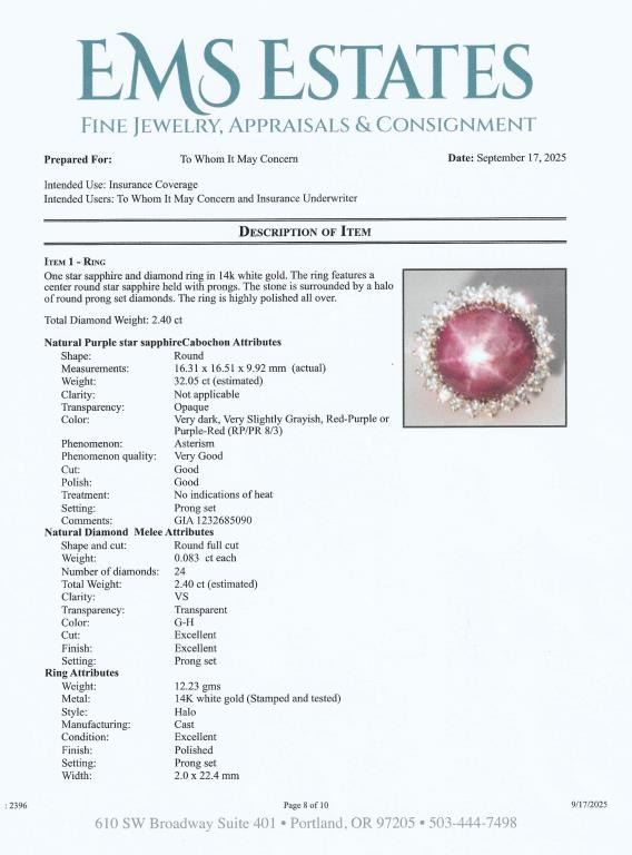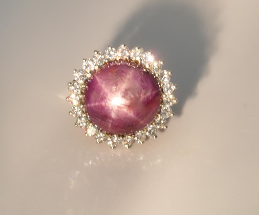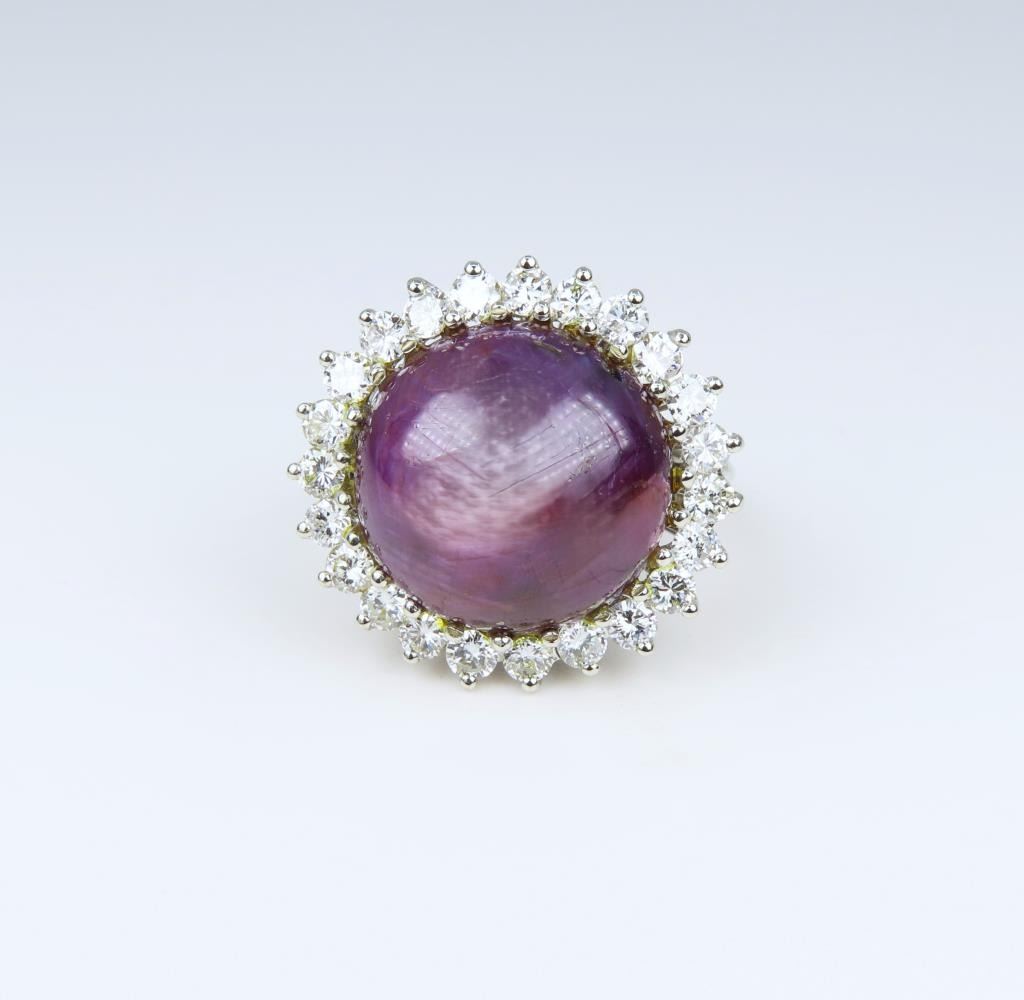 Star Sapphire and Diamond Ring featuring a 100% Natural, NO Treatment round cabochon Sapphire weighing approx. 32.00 carats and framed by 24 round “IDEAL cut” Diamonds weighing approx. 2.40 carats with G-H colors and VS clarity. Gems set in a glamorous 14 karat white gold custom setting, ring size 6. Star Sapphire is a rare variety of gemstone that exhibits a star-like visual effect (asterism) seen under a single light source. Star Sapphire historically is regarded as strong healing gem that reduces stress, creates inner peace and promotes health. Full Retail Appraisal - $32,000.00