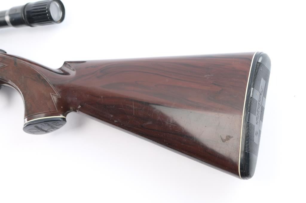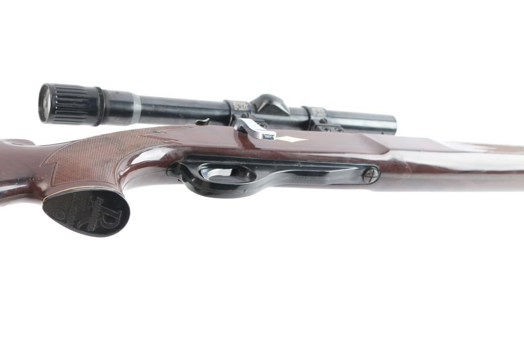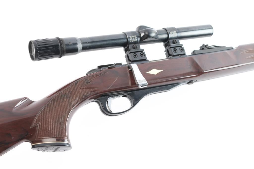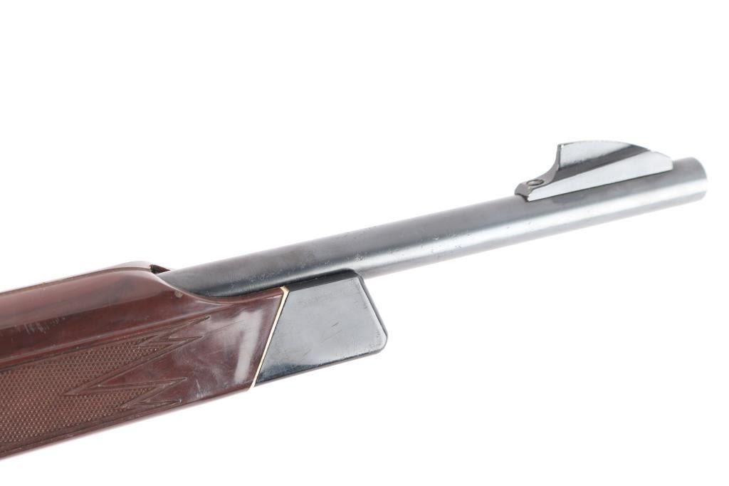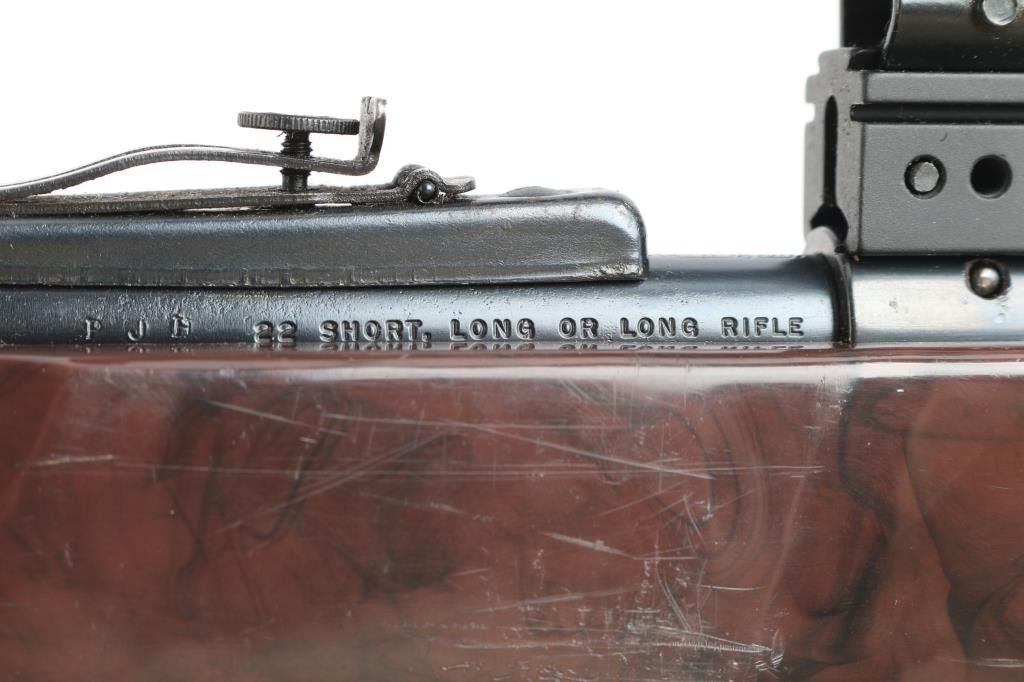 Very rare single-shot bolt action rifle chambered in .22 S, L, or LR cal., automatic safety, 19 5/8" rifled barrel with large front blade, adjustable rear sights. barrel, Mohawk Brown nylon stock,with white diamond, factory nylon triggerguard, forearm tip, grip cap and buttplate with white spacers. Manual thumb safety, cocking indicator, flat, serrated bolt handle, smooth trigger. Mounted with a vintage Weaver V22 scope with crosshair reticle, Weaver.875 tip-off rings, clear optics. Bore is very good/bright, action is smooth, blue is about 90% with minor scratches and a couple of small rubs on the receiver, stock is good/sound with many small scratches/scuffs. Produced from 1962 to 1964. Over 22,400 made. (PJ date code-June, 1962)