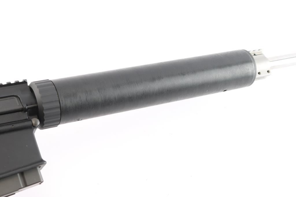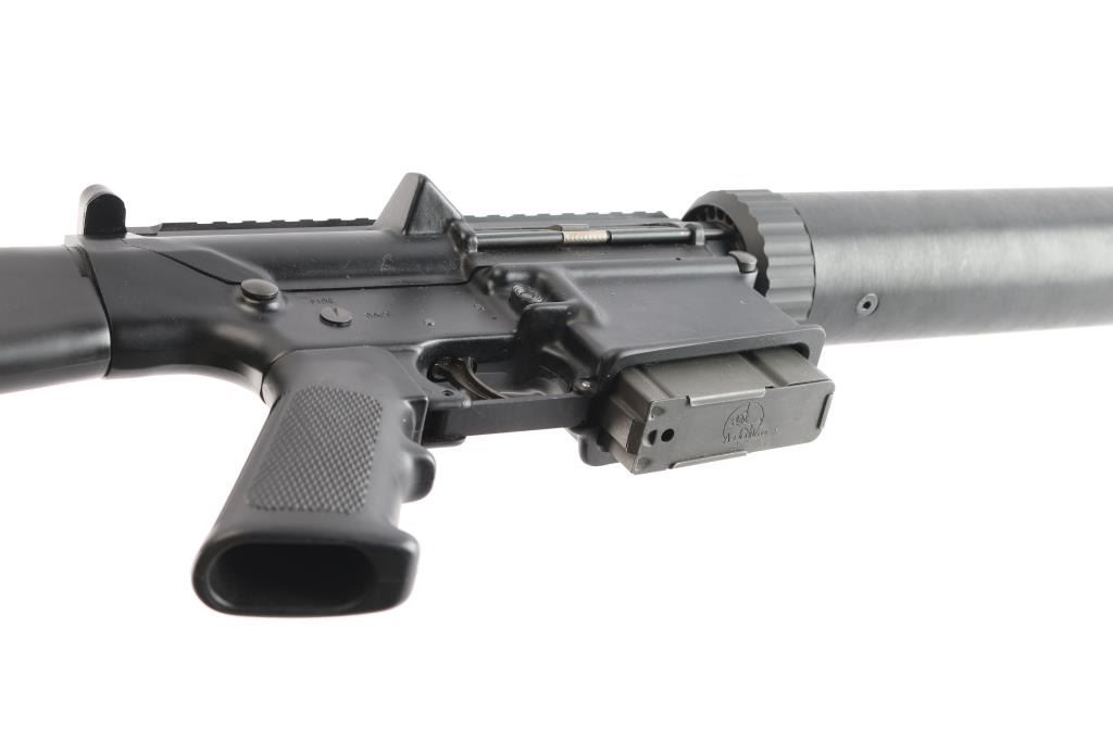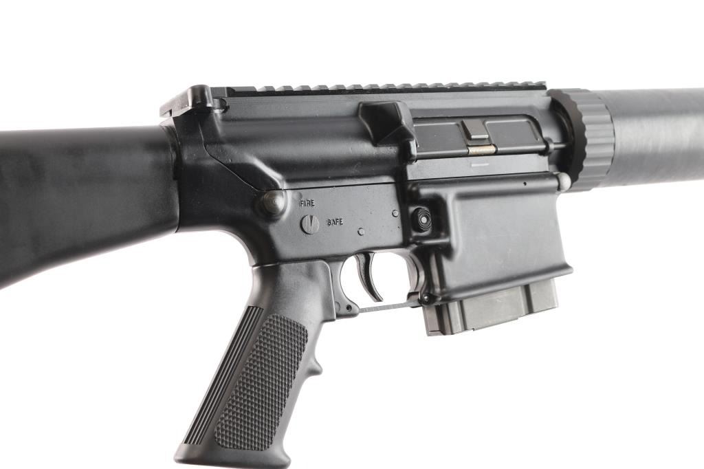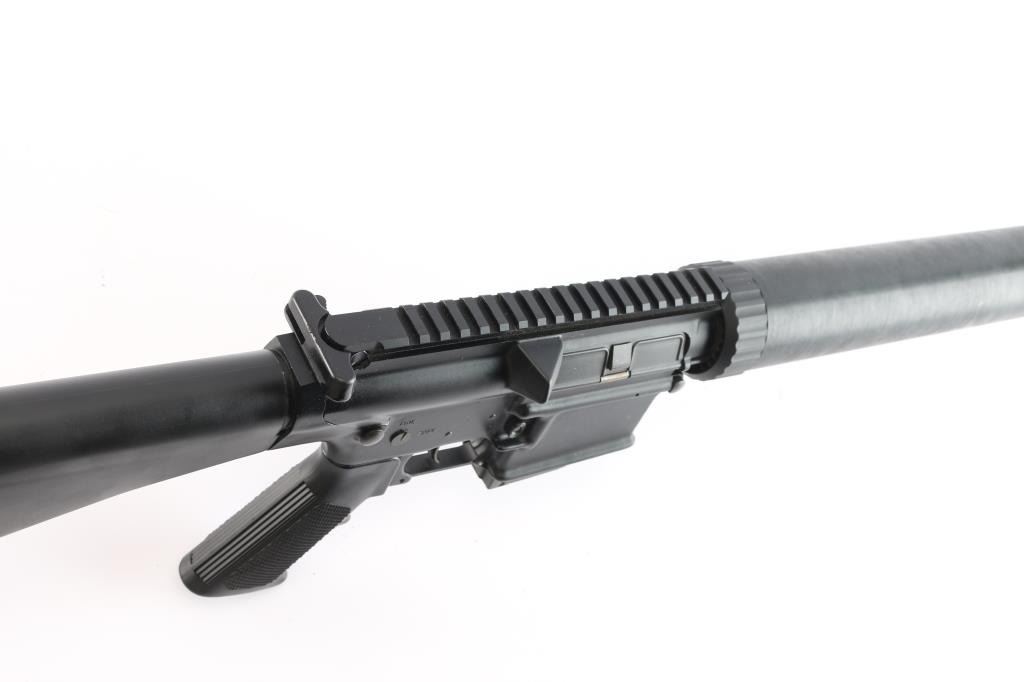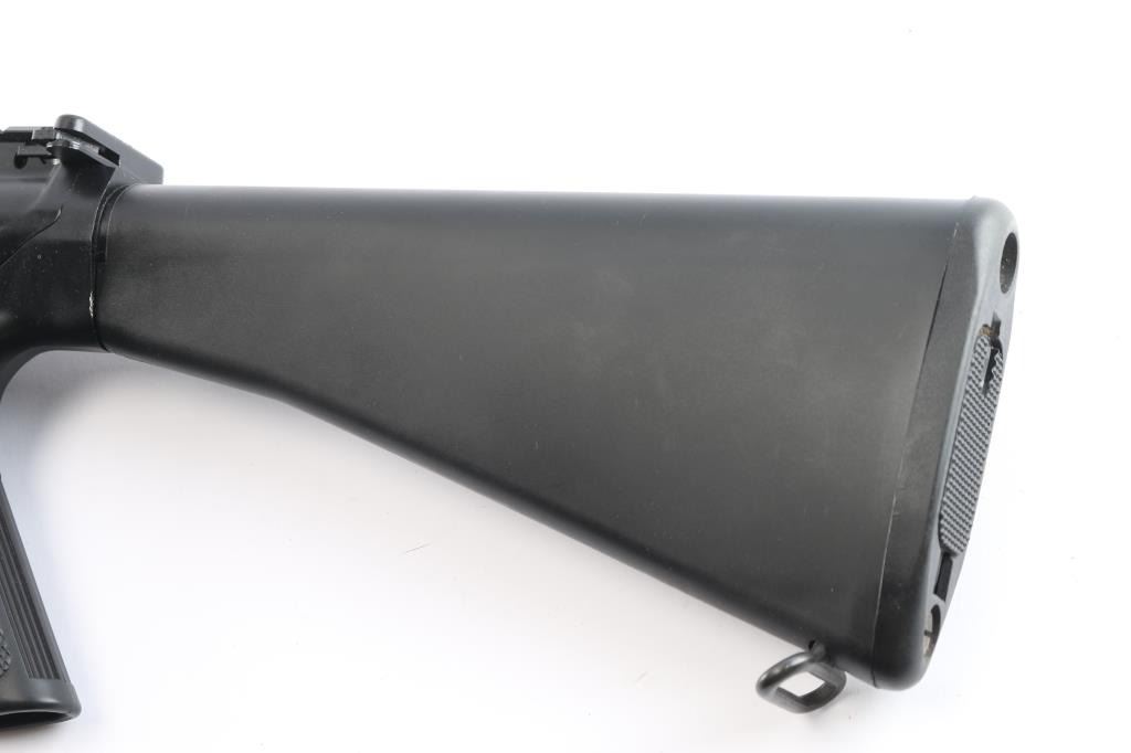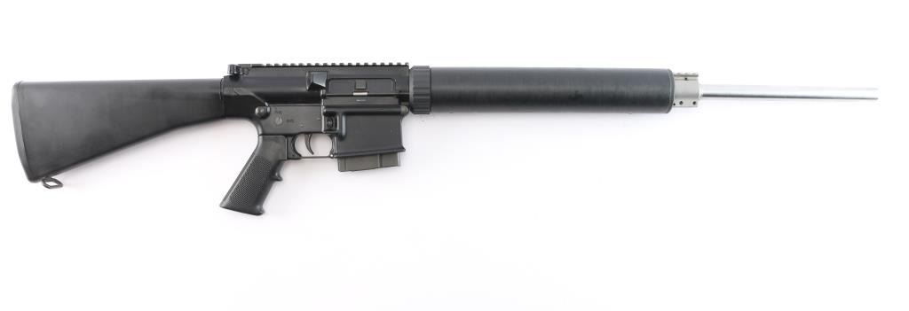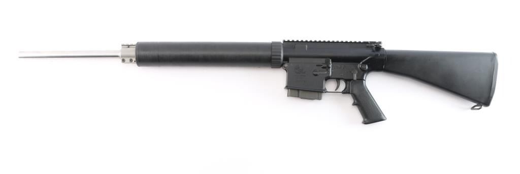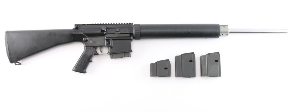 "Target" semiautomatic rifle features factory 24" heavy stainless barrel with recessed crown, Picatinny rail on top of gas block, optics ready flat top Pic rail upper receiver with ejection port cover and shell deflector (no forward assist), manual safety, cylindrical carbon fiber handguard, A2 style grip and fixed rifle stock with butt trap, factory 2-stage national match trigger. Rifle appears like new with little evidence of handling. Includes a total of 4 Armalite marked magazines, three are approx 10 rd, one appears to hold 5 rounds.