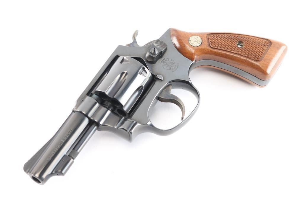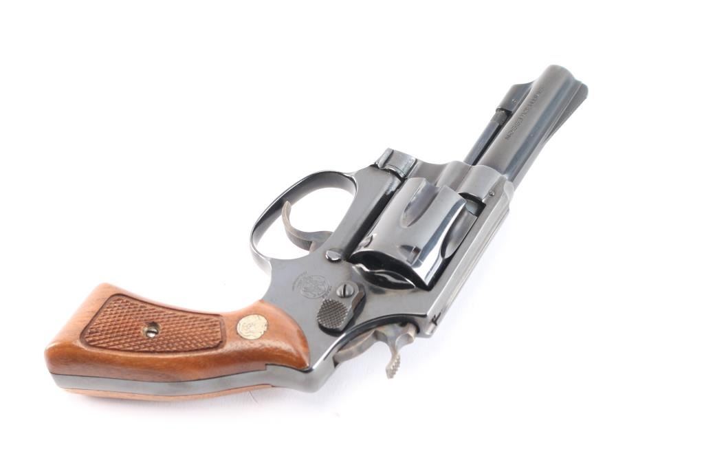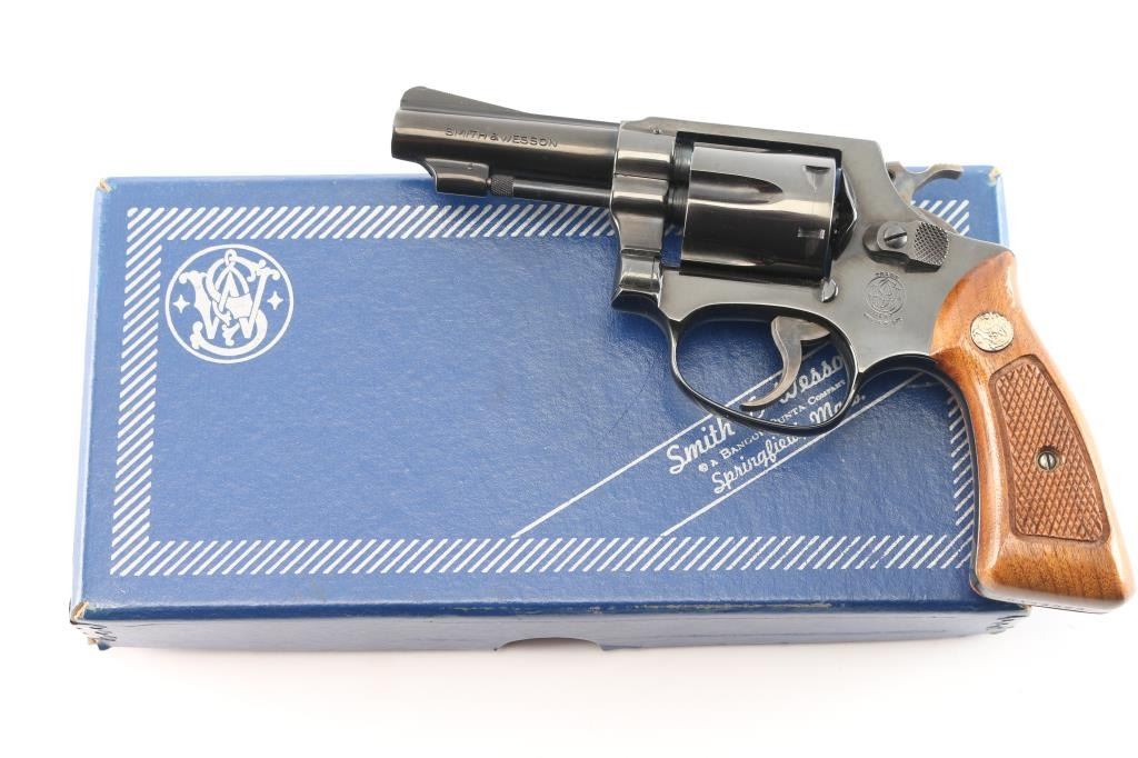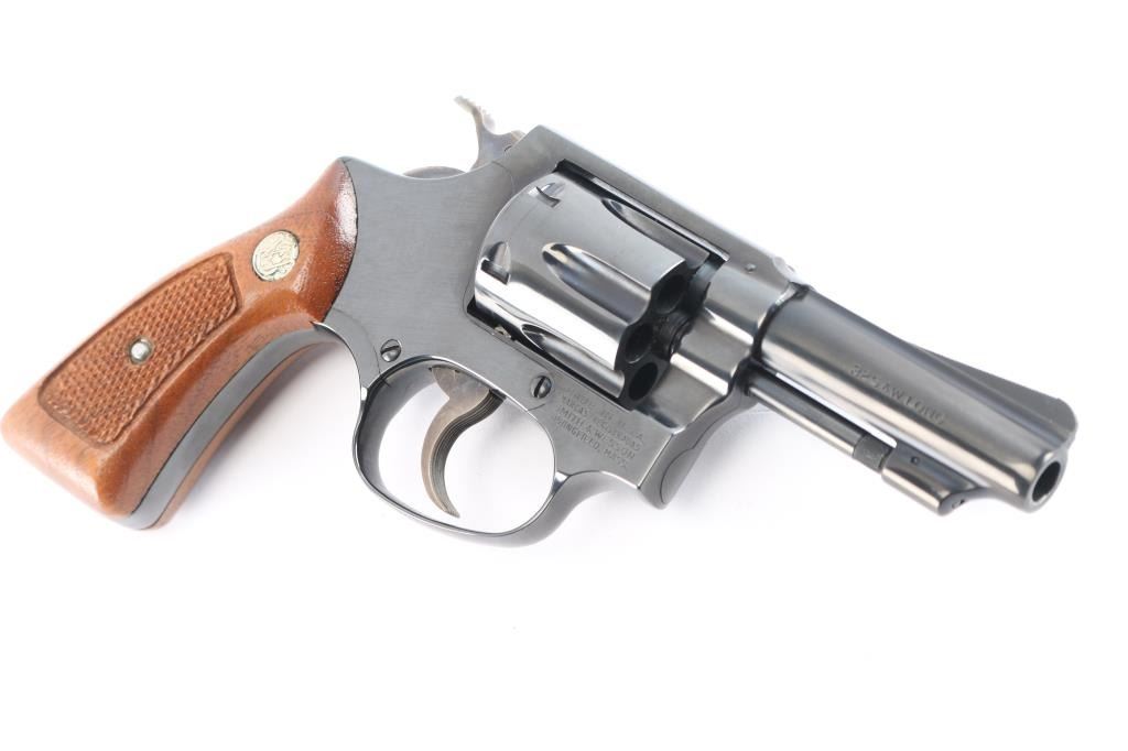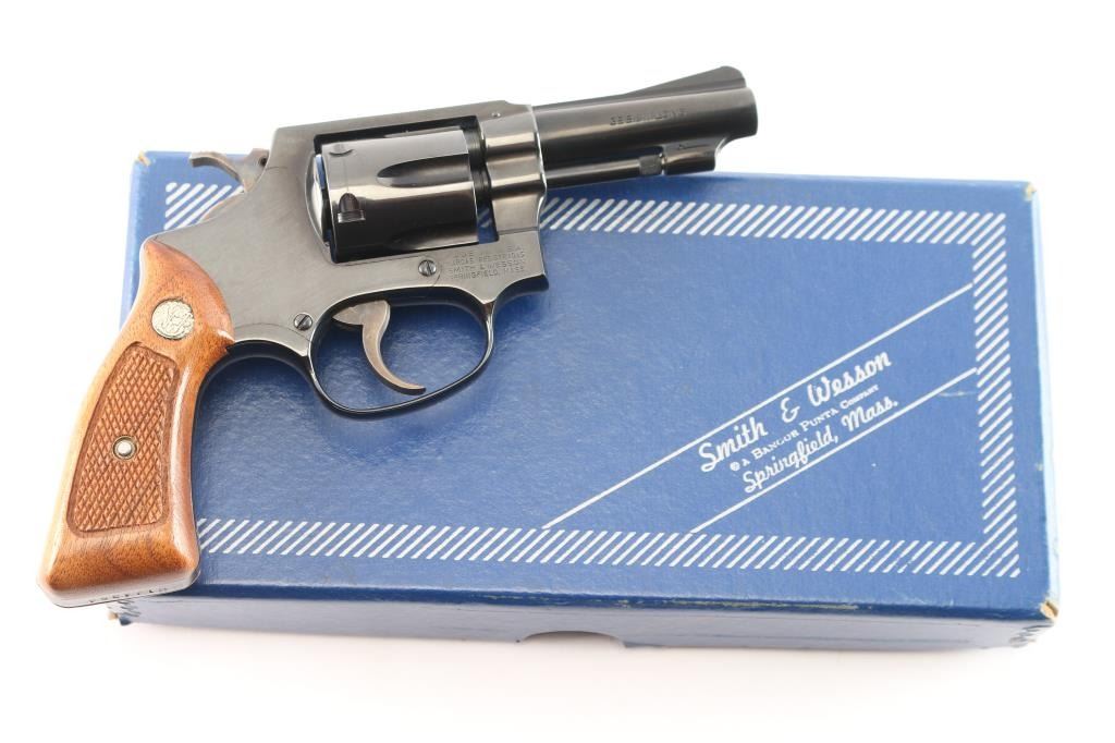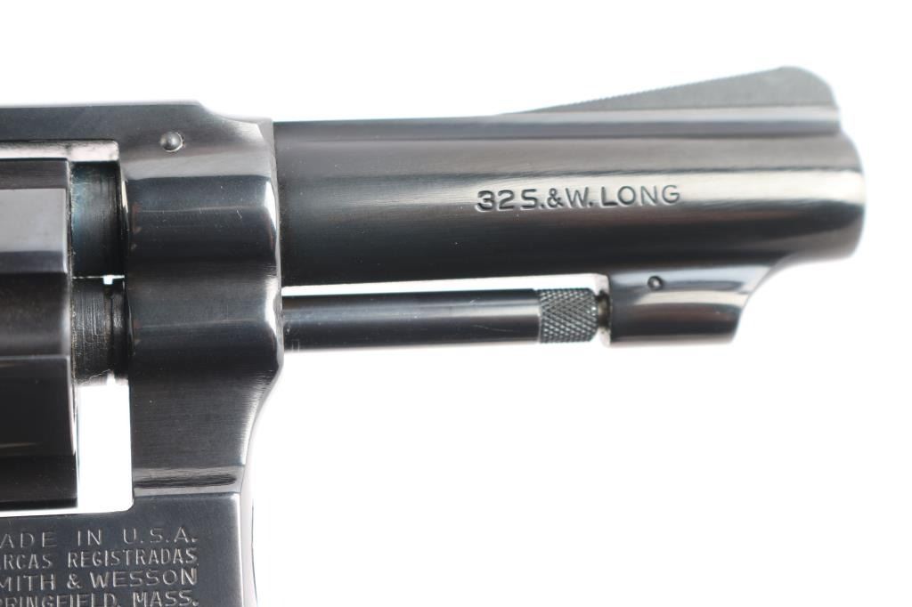 'The .32 Regulation Police' Small frame double action revolver chambered in 32 Smith & Wesson Long. Manufactured in Springfield, MA circa 1981. Features a blued finish, pinned 3" barrel with sighting rib, serrated ramp front sight, square notched rear sight, non-shrouded ejector rod, fluted six-shot cylinder, case hardened serrated .240" trigger, case hardened .240" service hammer, three screw square butt J frame, and checkered walnut Magna grips with silver S&W medallions. Includes the original factory two-piece blue cardboard box with matching end label, documents, screwdriver, and cleaning tools. Revolver retains approximately 99% of its original finish showing a light drag line on the cylinder and a couple mild scratches. The action is mechanically sound with tight lock-up, the bore is excellent, and the matching walnut grips are excellent.