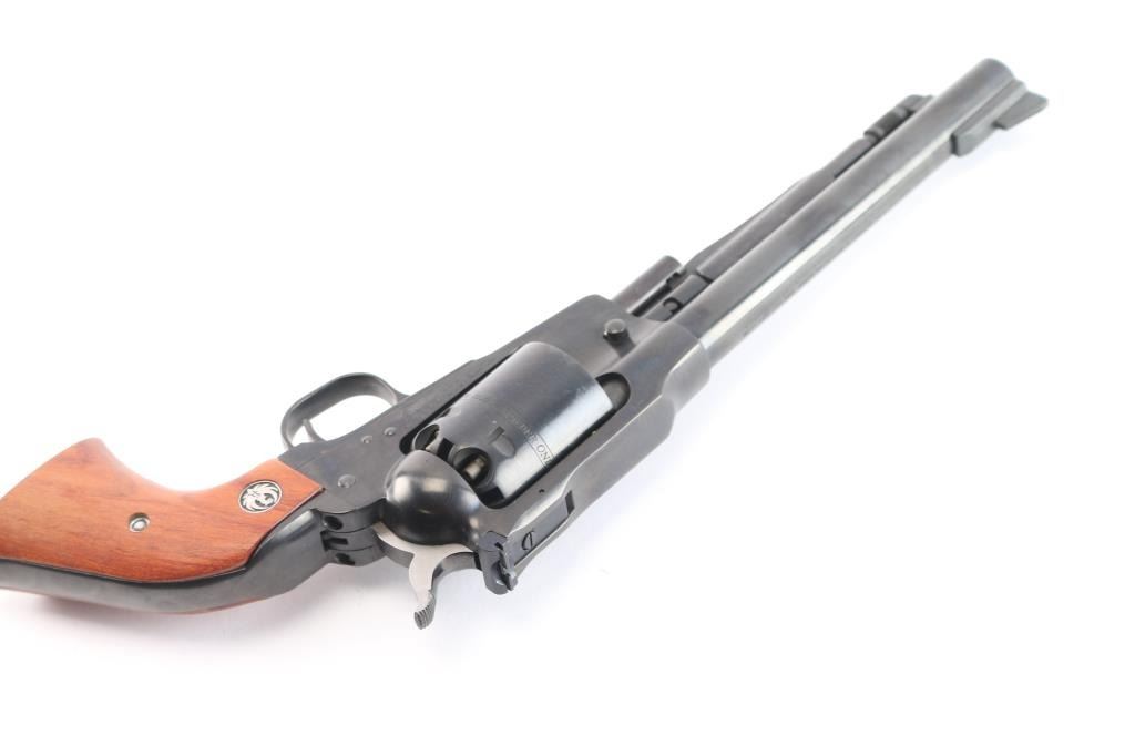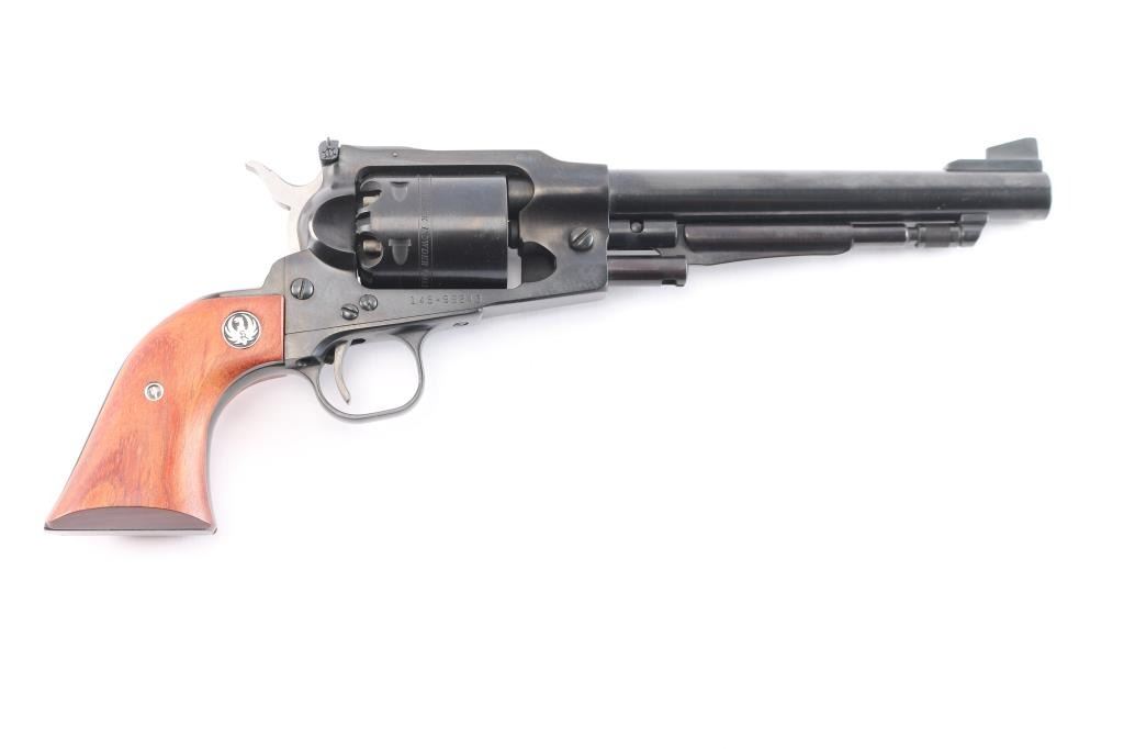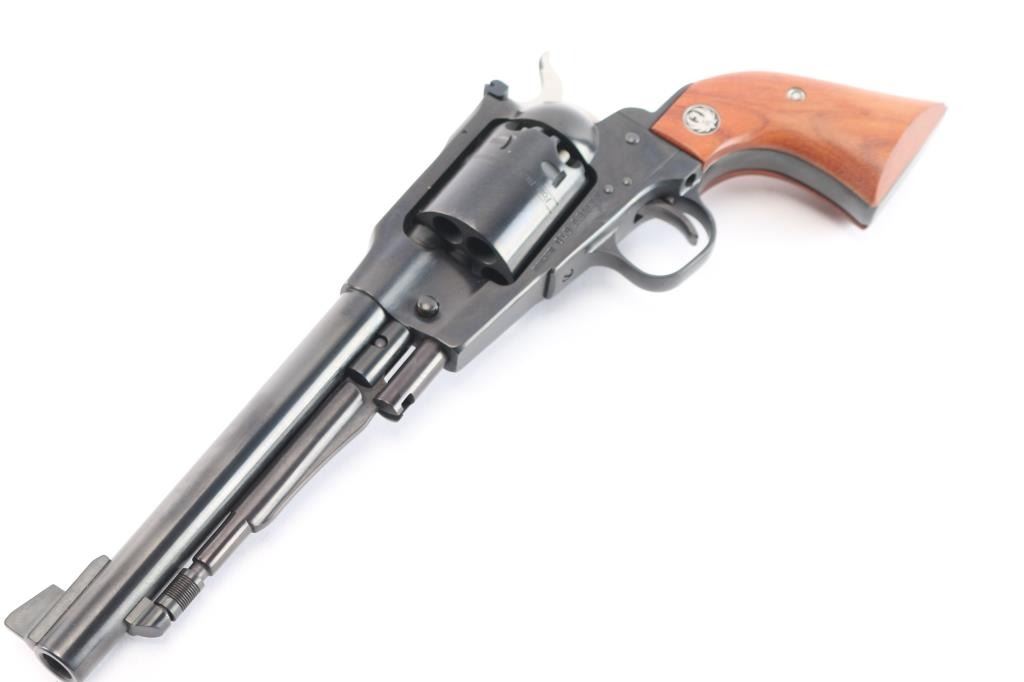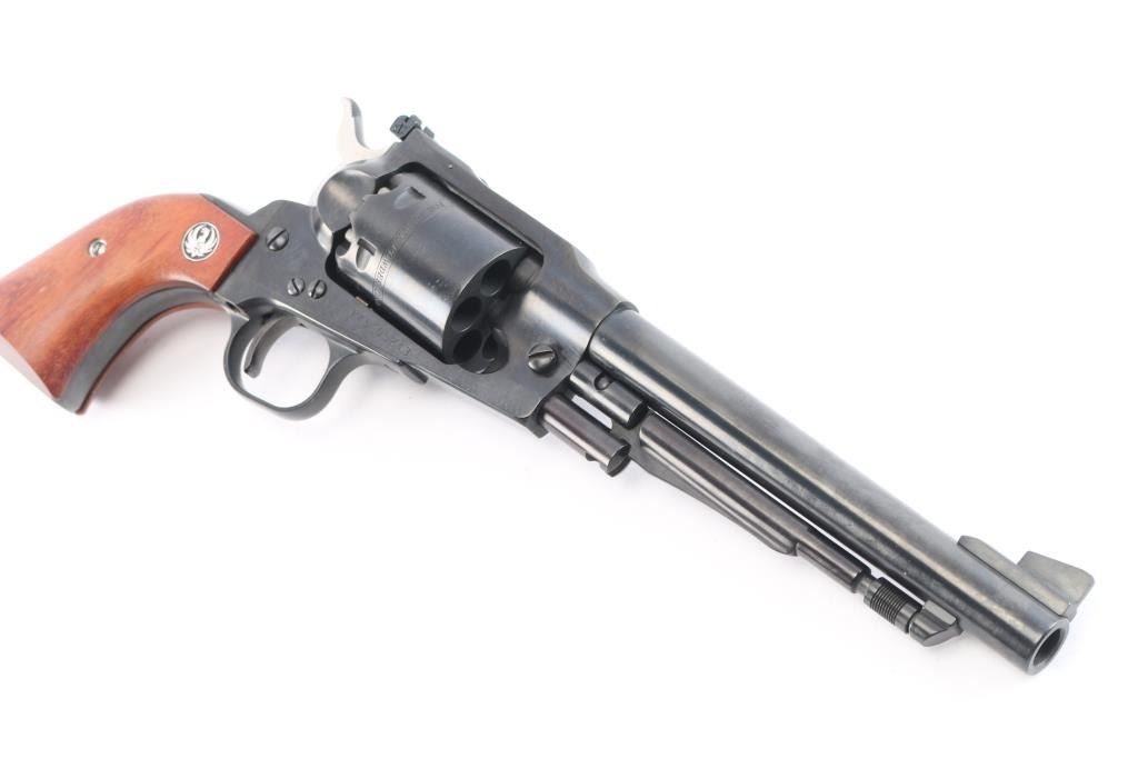 Note* This revolver has a Consecutive numbered gun in this auction. Manufactured 1997. Single action black powder percussion revolver. Features blued finish, 7.5" barrel, loading lever, raised serrated ramp front sight, adjustable rear sight, smooth trigger, serrated hammer spur, non-fluted cylinder with safety stops, three-screw steel frame, two-piece smooth walnut grips with Ruger medallions. Bore and charge holes are excellent, appear unfired. External appearance is like new with few handling marks. Action is smooth with tight lock-up. Grips are excellent. Includes gray plastic Ruger box with manual, paperwork, lock and nipple wrench.