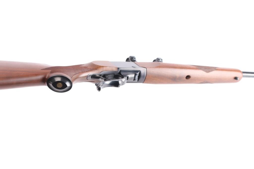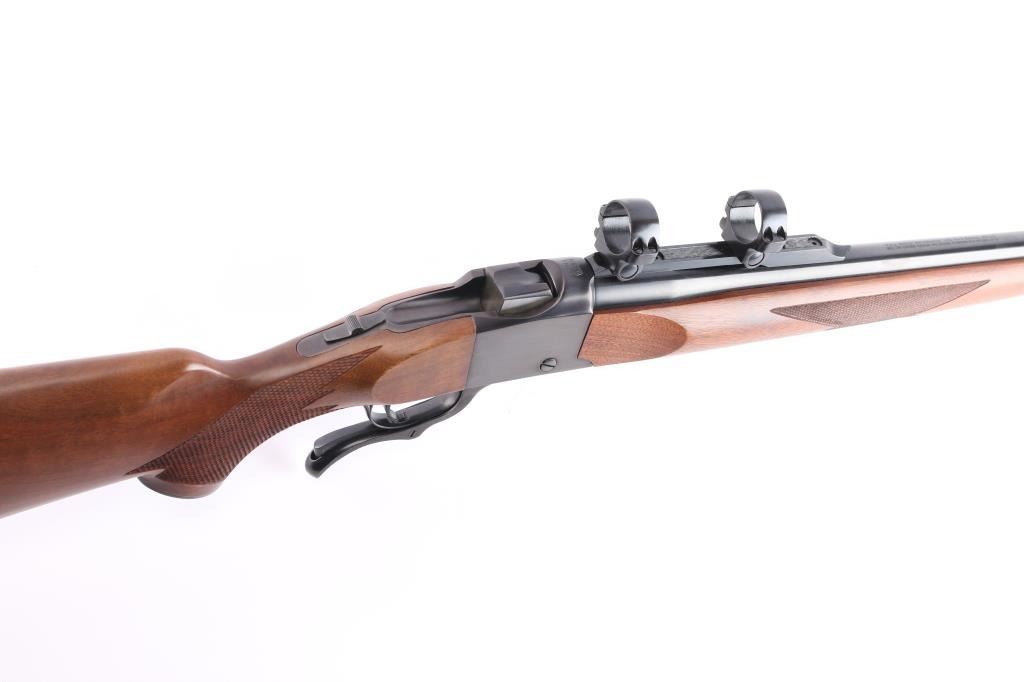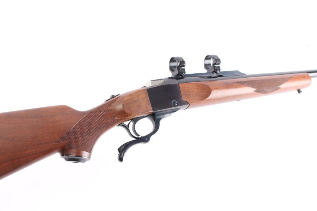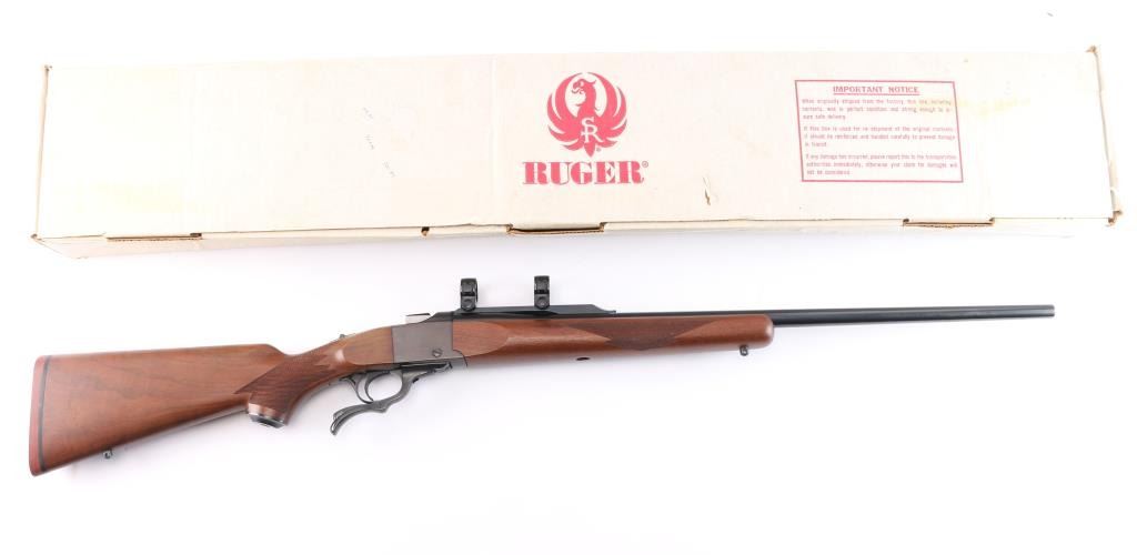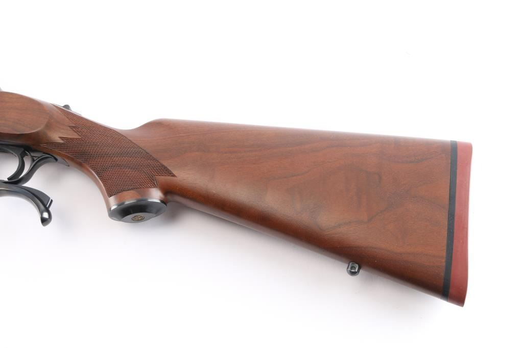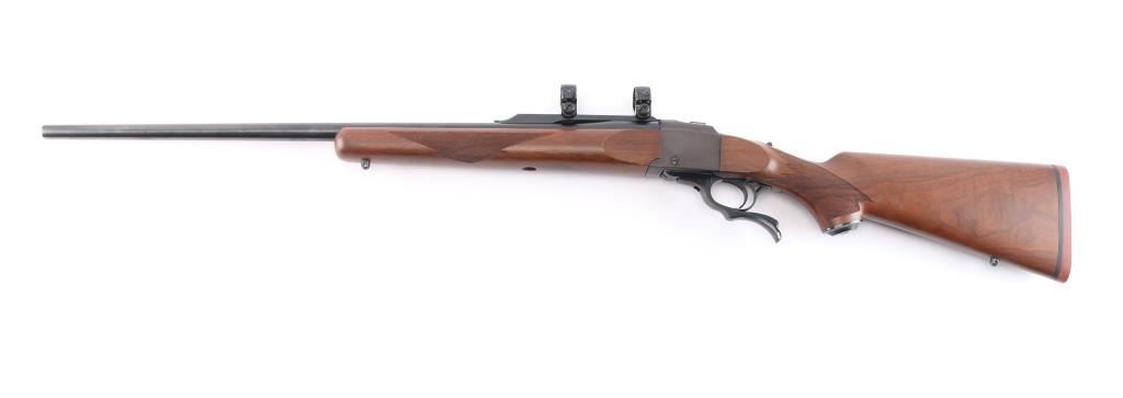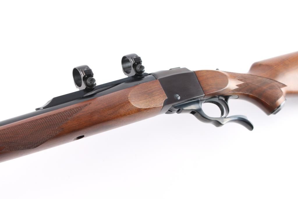 Single shot falling block 1-B rifle chambered in .257 Roberts. Optics ready. Features blued finish, walnut butt stock & forend, 26" tapered barrel with quarter rib for scope mounting, no provisions for sights, checkering on sides of forend & wrist, beavertail forearm, sliding tang safety, sling studs, thin rubber factory butt pad, wide serrated adjustable trigger. Mounts factory 1" scope rings. Bore is excellent/bright. Retains 99% finish. Wood is excellent, fancy figure & fiddle grain. falling block action is smooth. Rifle is in like new condition. Comes with original factory box with matching label and owners manual. Manufactured 1990.