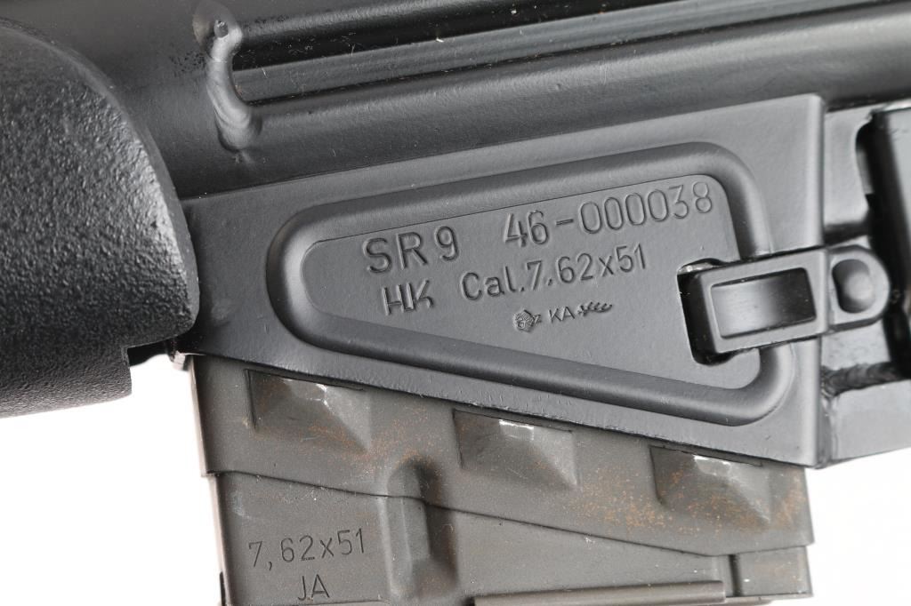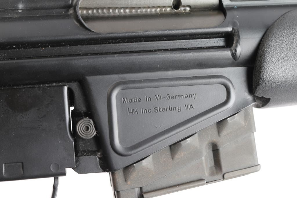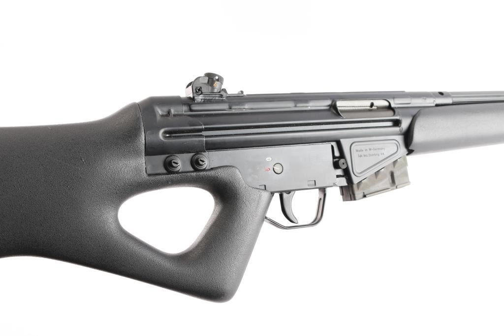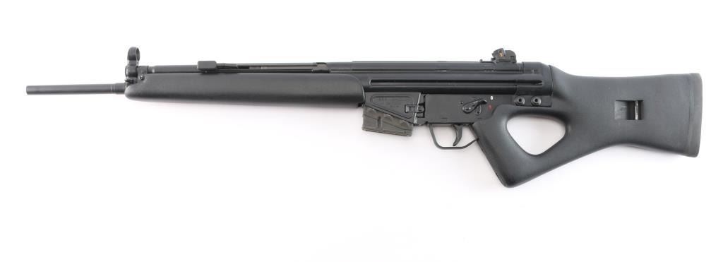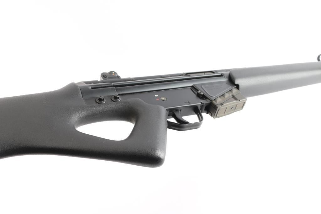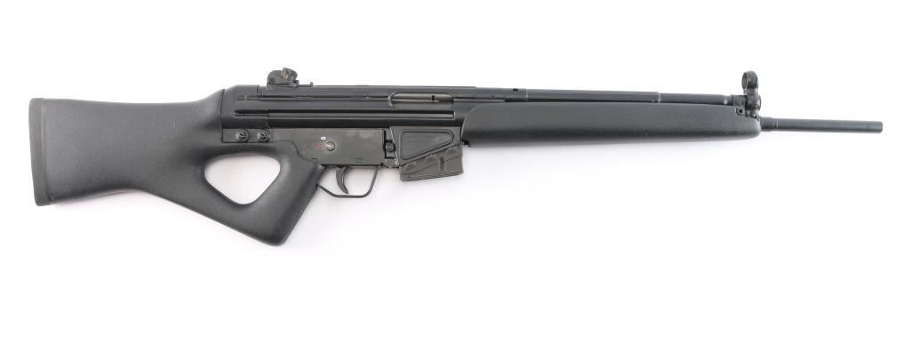 German made semiautomatic sporting target rifle, based on the HK-91 or G-3 design. Features matte black finish, textured black handguard and thumbhole stock, solid rubber recoil pad, 20" barrel with plain muzzle, protected post front sight, adjustable turret rear sight, push button mag release, thumb safety. Bore is excellent. Overall like new condition with handling marks. Includes one 5 round magazine, manual, factory box.