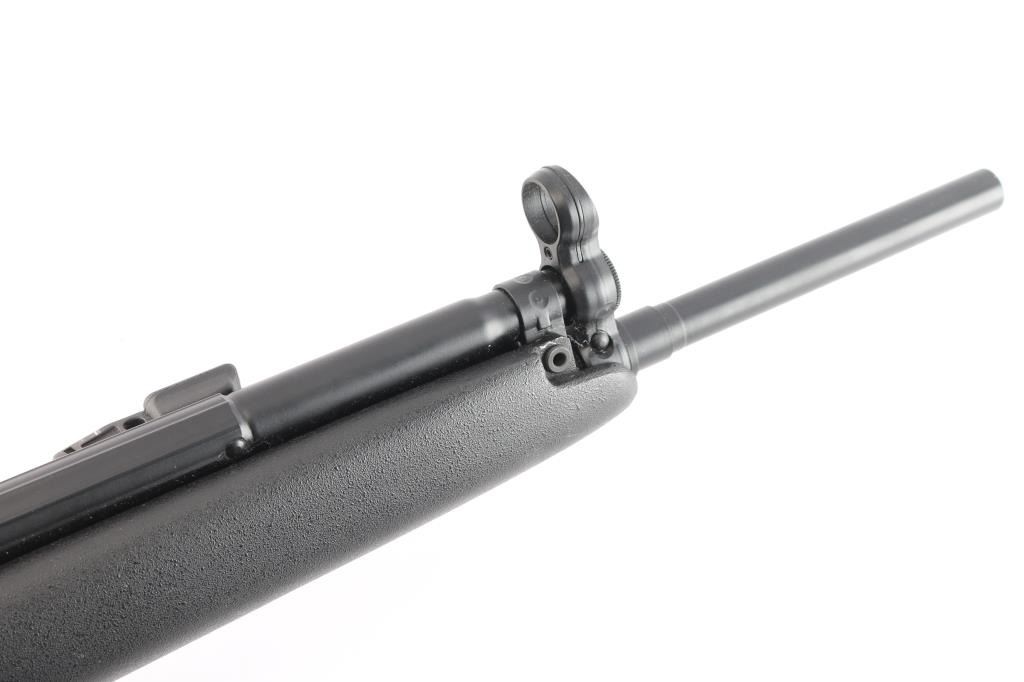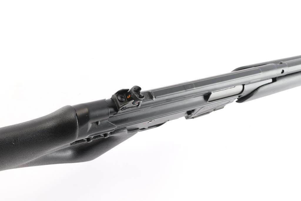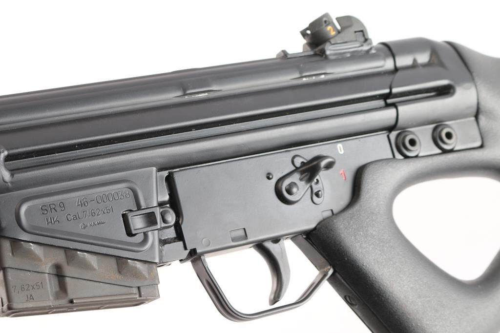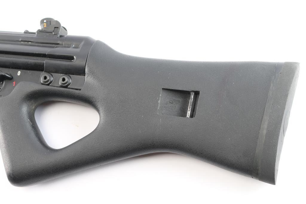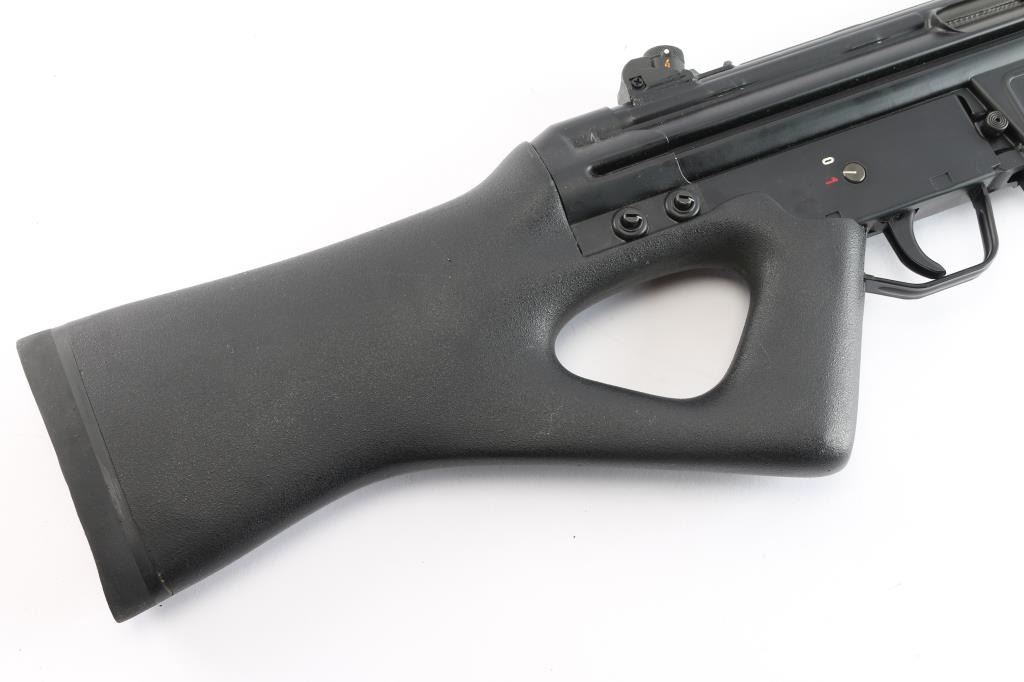 German made semiautomatic sporting target rifle, based on the HK-91 or G-3 design. Features matte black finish, textured black handguard and thumbhole stock, solid rubber recoil pad, 20" barrel with plain muzzle, protected post front sight, adjustable turret rear sight, push button mag release, thumb safety. Bore is excellent. Overall like new condition with handling marks. Includes one 5 round magazine, manual, factory box.