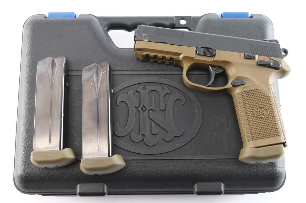 American made double-action semi-automatic full-size pistol chambered in .45 Auto. Features a matte black finished stainless steel slide with fore and aft cocking serrations, matte black finished stainless steel 4.5" cold hammer forged barrel, dovetail mounted three-dot sights with front dot painted yellow, full-length steel guide rod, smooth polymer trigger, serrated round hammer spur, ambidextrous fame mounted safety/decocker, loaded chamber indicator, ambidextrous slide stop, ambidextrous push button magazine release, factory 15 round magazine, and FDE polymer frame with integral accessory rail, checkered grip & interchangeable backstrap. Includes the original factory hard case with matching end label, lock, additional backstrap, and two spare magazines. Pistol retains approximately 95% of its original finish showing holster wear, light contact wear on the barrel hood, and some adhesive residue on the top of the slide. The action is mechanically sound, the bore is excellent, and the polymer is excellent.