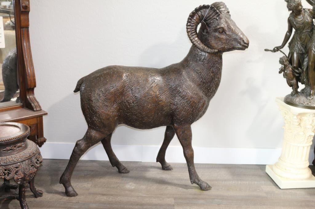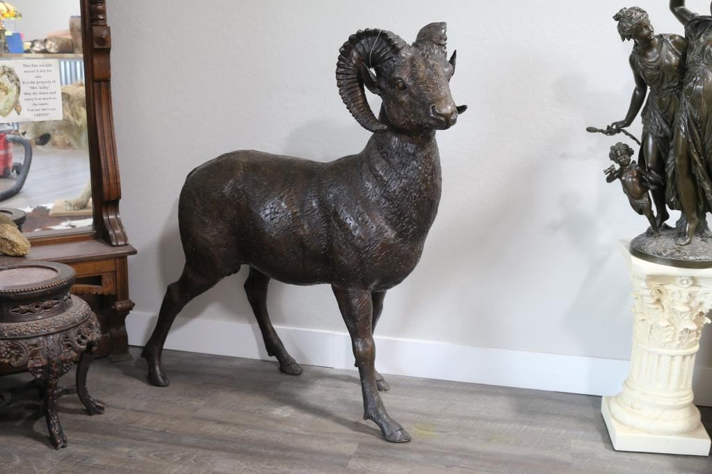 Unsigned, depicting a full size ram with brown mottled finish. Stands 49" tall by 44" long by 13" wide. Consignor stated that bronze was purchased from a Dodge Ram car dealership in the midwest. LOCAL PICKUP ONLY!