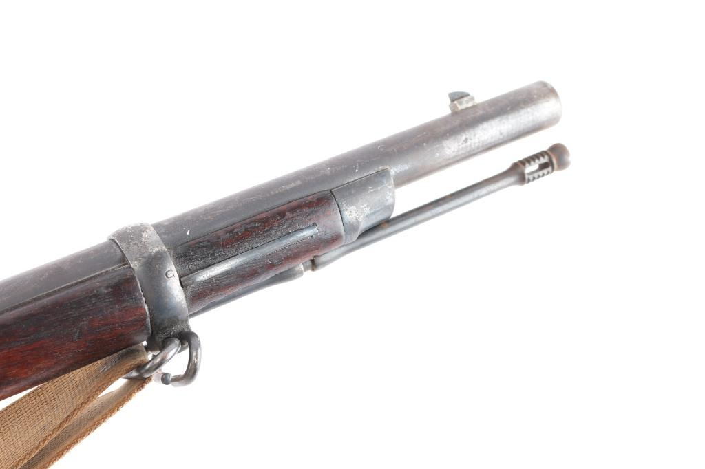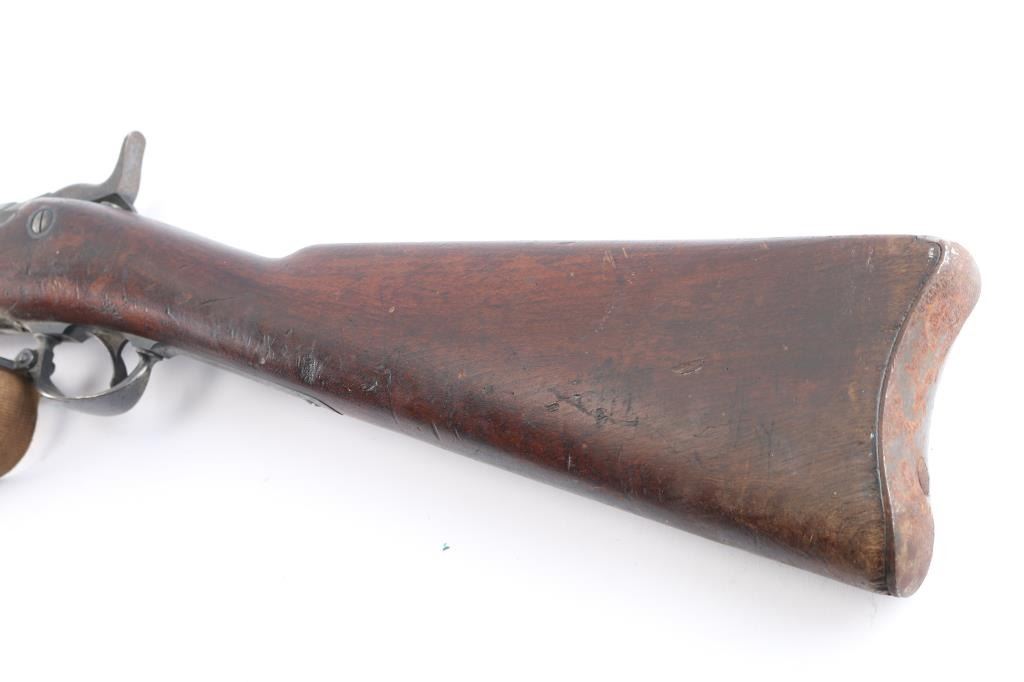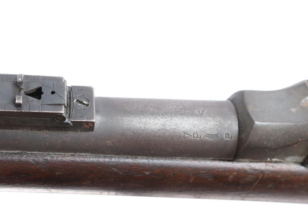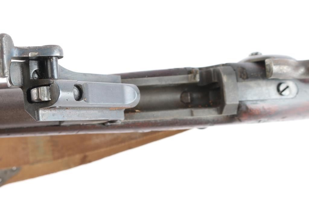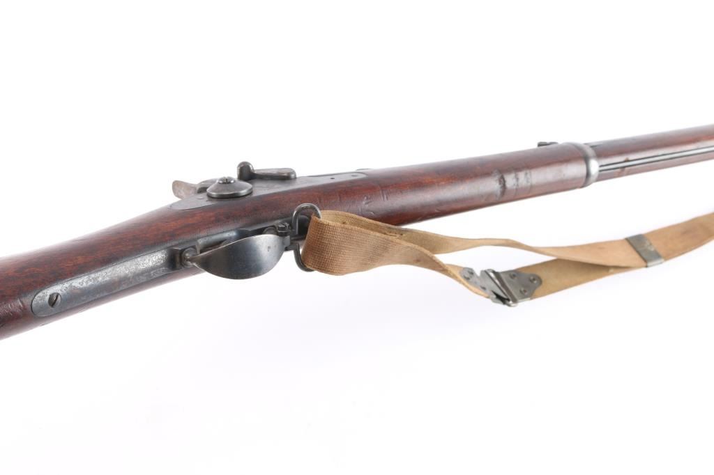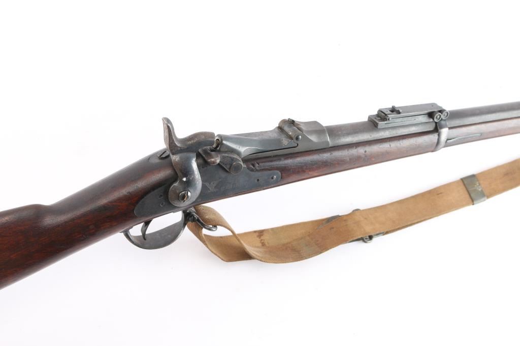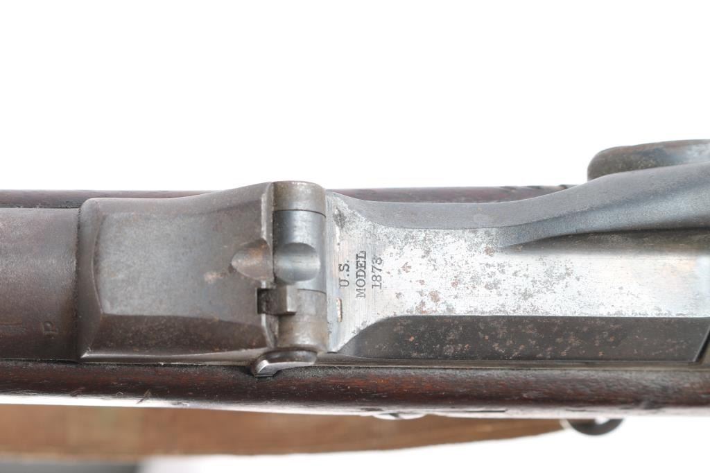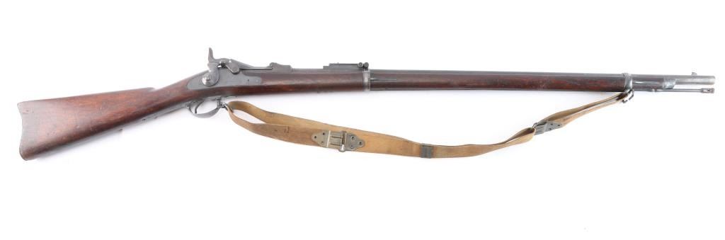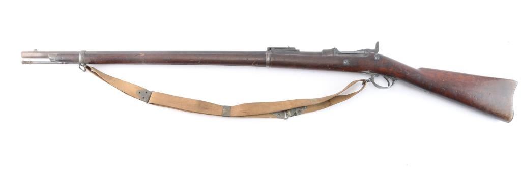 SN: 180698. '1873 / 1879' Model. This is a Model 1873 trapdoor with the 1879 improvements, including a ribbed trigger, thicker receiver, knurled hammer spur and improved rear sight. US military single shot rifle manufactured circa 1880. Features 32 5/8" barrel, blade front sight, Buffington rear sight marked "R", M73 cleaning rod, sling swivels, stacking swivel, external hammer, straight gripped walnut stock, curved steel buttplate marked "U.S.". Bore is dark/rough, metal finish has turned a dull blue/gray with scattered light patches of pitting on the breech block and lower tang. Buttplate is scaly with heavy rust. Wood is very good with many small dents. Breech block is dated 1873. Barrel marked over chamber "V / P / (eagle head)", "P". Observed markings are generally sharp edged. Left stock wrist has a feint "SWP' cartouche with what appears to be "1882". Serial number dates the rifle to 1882. Three cock hammer action works well. Comes with a Spanish-American War era Kerr 'Nobuckl" tropical tan web sling attached.