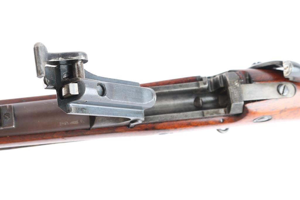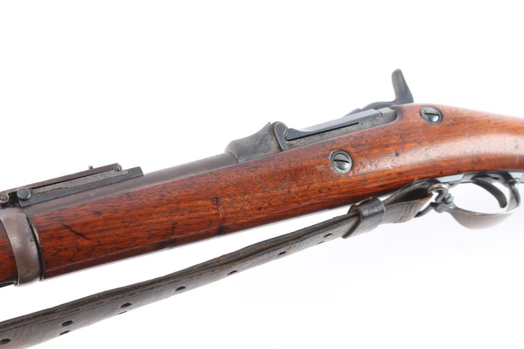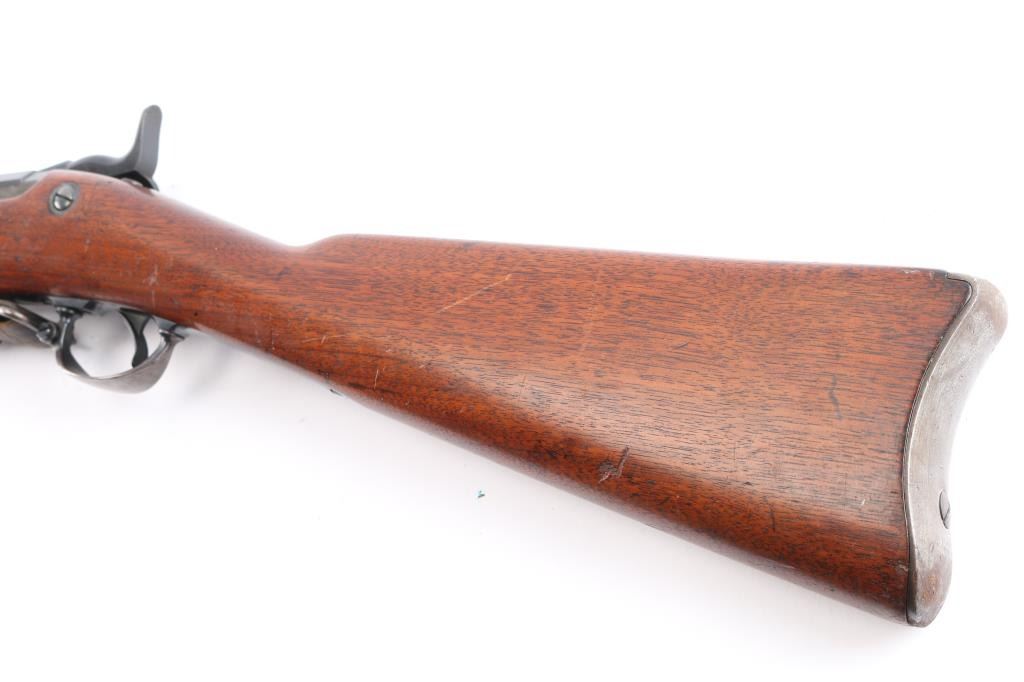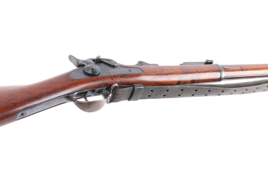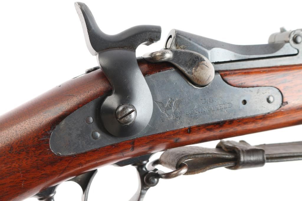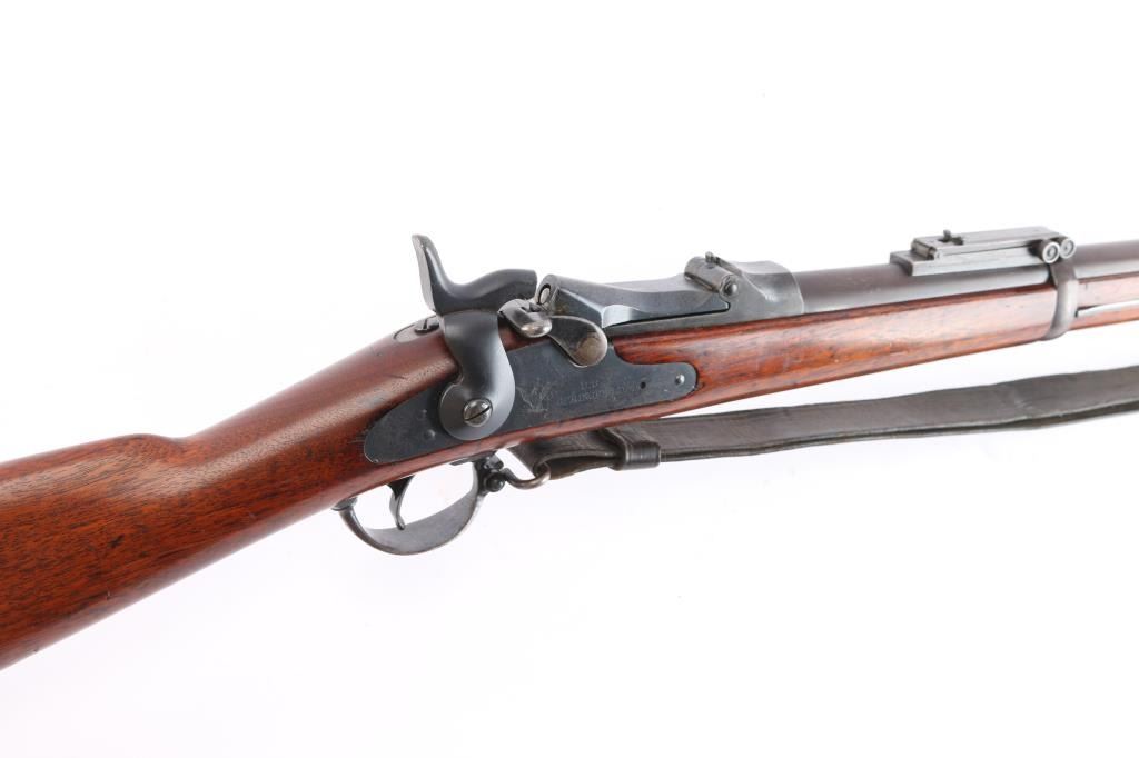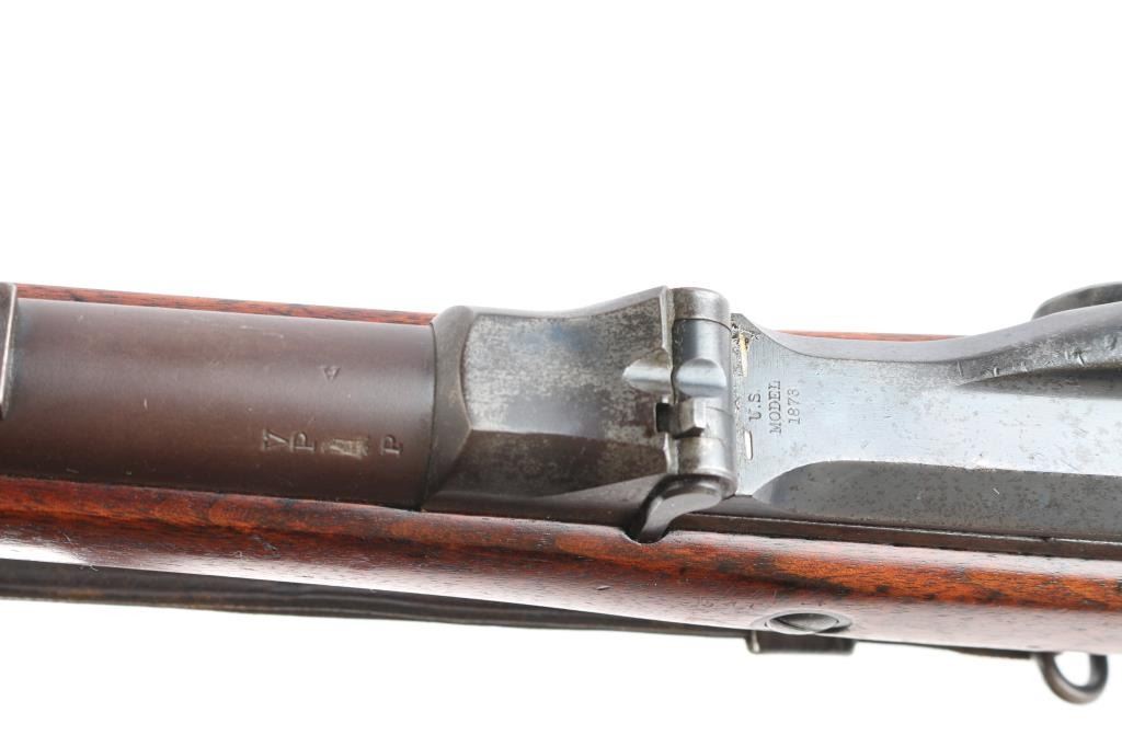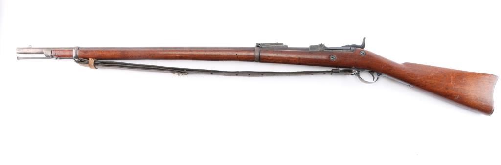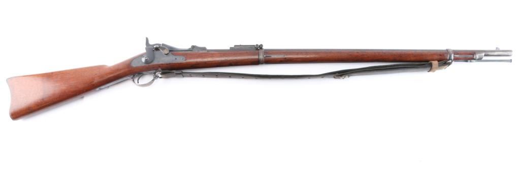 SN: 391851. This is a Model 1884 trapdoor rifle manufactured 1888 with the 1873 breech block. (Older parts were used during manufacture of these rifles) US military single shot rifle. Features 32 5/8" barrel, blade front sight, Buffington rear sight marked "R", M79 cleaning rod, sling swivels, stacking swivel, ribbed trigger, knurled hammer spur, external hammer, straight gripped walnut stock, curved steel buttplate marked "U.S.". Bore is very good/bright, good rifling. Blue finish is about 40% mostly on the breech block, lock plate, hammer and lower tang, barrel, bands, fore cap, buttplate and triggerguard have turned a light brown patina with age. Wood is very good with many small dents. Barrel marked over chamber "V / P / (eagle head)", "P". Observed markings are generally sharp edged. No cartouche observed. "%&" stamped behind the triggerguard. Three cock hammer action works well. Comes with a correct, original M1887 leather sling with one brass claw, the upper keeper is a newer replacement.
