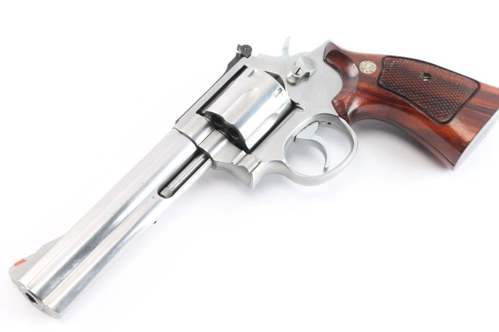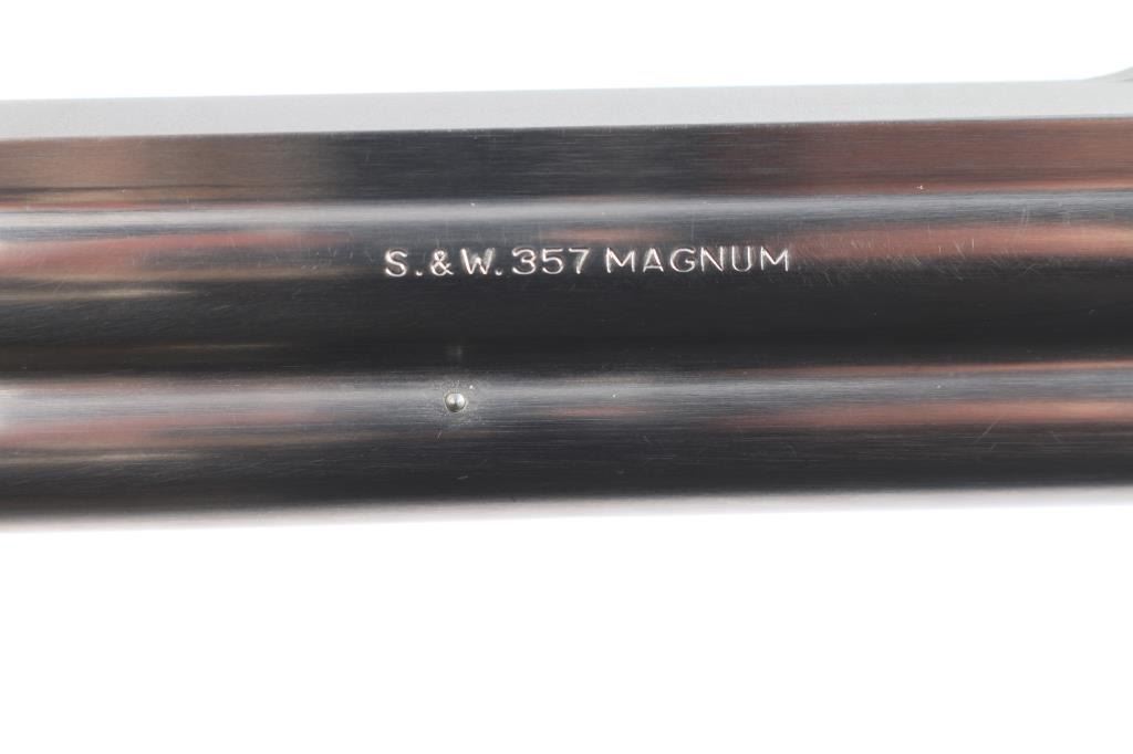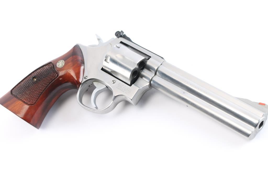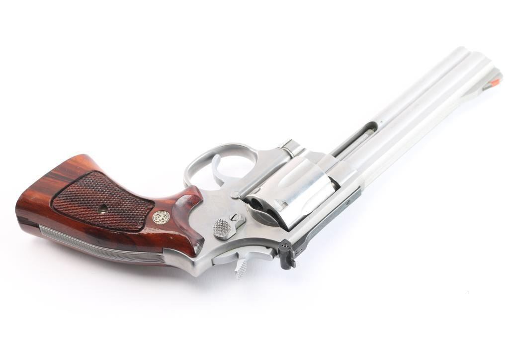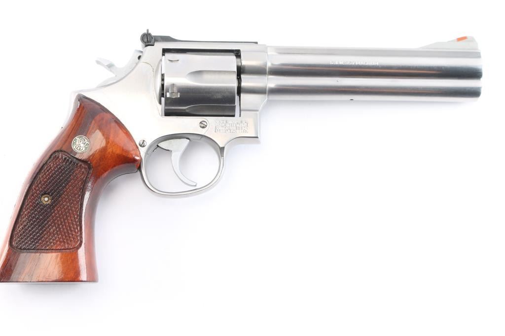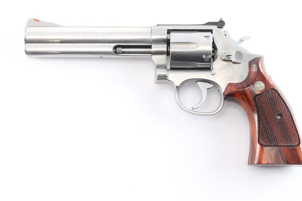 American made six shot revolver chambered for .357 Magnum ammunition. Built on the L target frame. It features stainless steel construction with a 6" barrel, fluted cylinder, full underlug, smooth trigger, serrated blade front sight with orange insert, adjustable rear sight on serrated sighting rib, knurled hammer spur and cylinder release, smooth trigger. Magna checkered walnut grips with S&W medallions. Metal finish looks good with minor scuffs/scratches, and a faint drag line on the cylinder. Bore is excellent/bright. Action is smooth with tight lock-up. Grips are excellent.