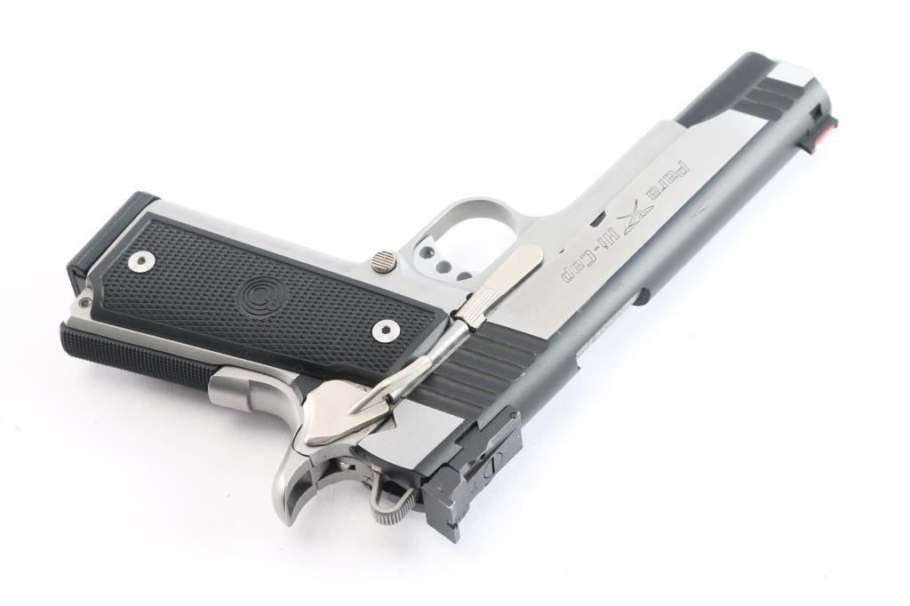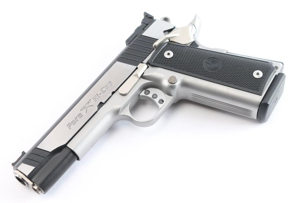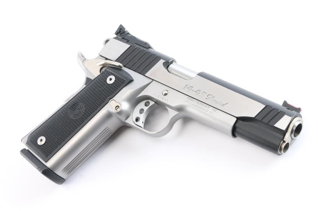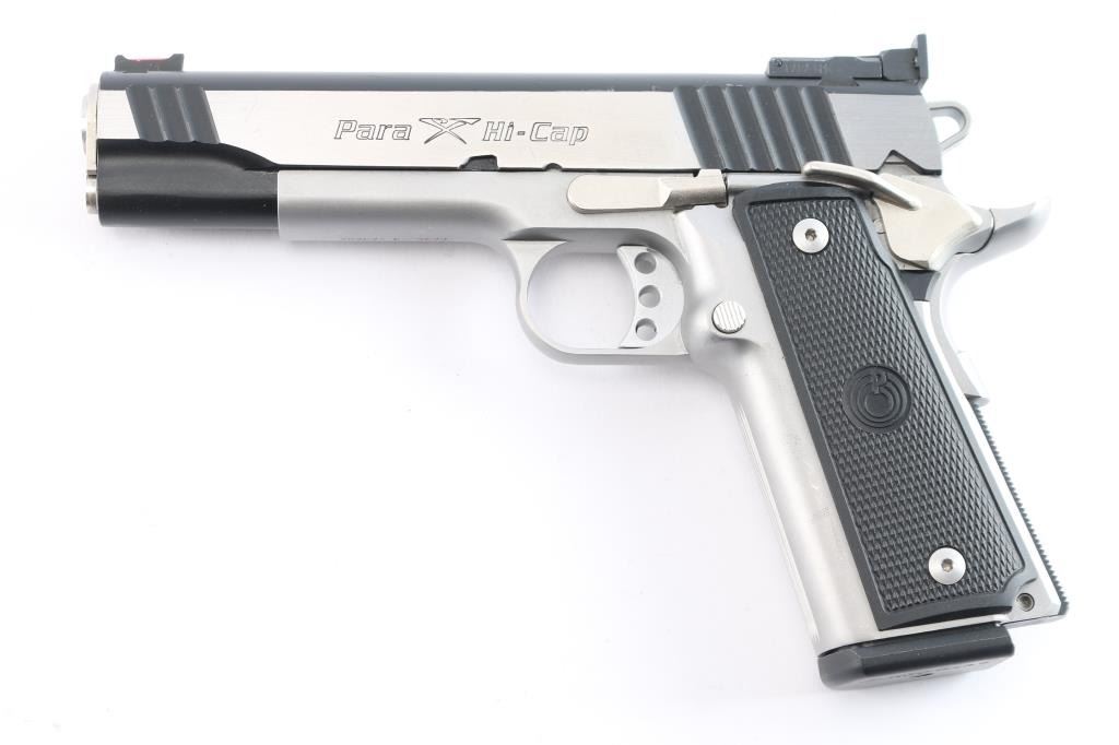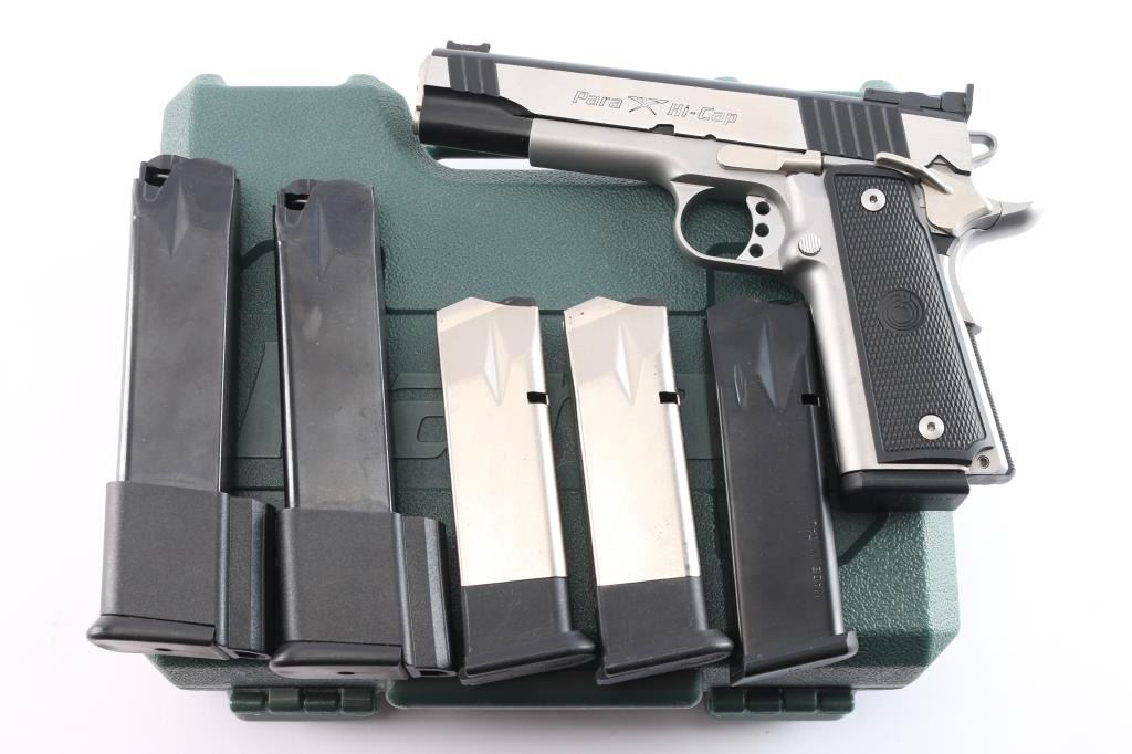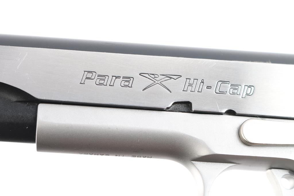 'Hi-Cap Limited' Canadian made double stack 1911-A1 style semi automatic pistol chambered in .45 Auto. Features a black coated slide with brushed stainless flats & dual serrations, 5" barrel, dovetailed red fiber optic front sight, adjustable rear window sight, serrated adjustable trigger, skeletonized hammer, ambidextrous thumb safety, large beavertail grip safety, knurled black mainspring housing, push button magazine release, 14 round factory magazine, satin finished frame and Para Ordnance two-piece checkered black plastic grips. Serrated grip straps. Includes the original green plastic hard case with documents and six spare magazines, four 14-rd and two 20-rd magazines. (7 Total). Pistol exhibits minimal handling marks and light wear with some minor scratches to the slide. Action is strong, bore is excellent and grips are fine.
