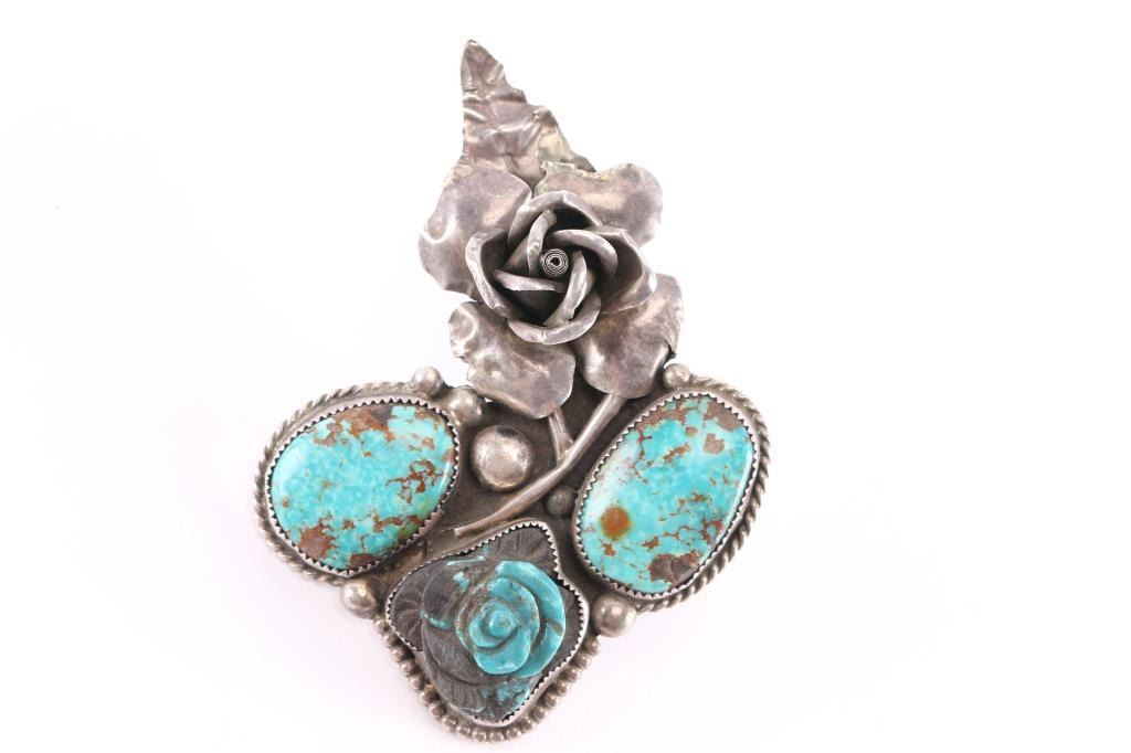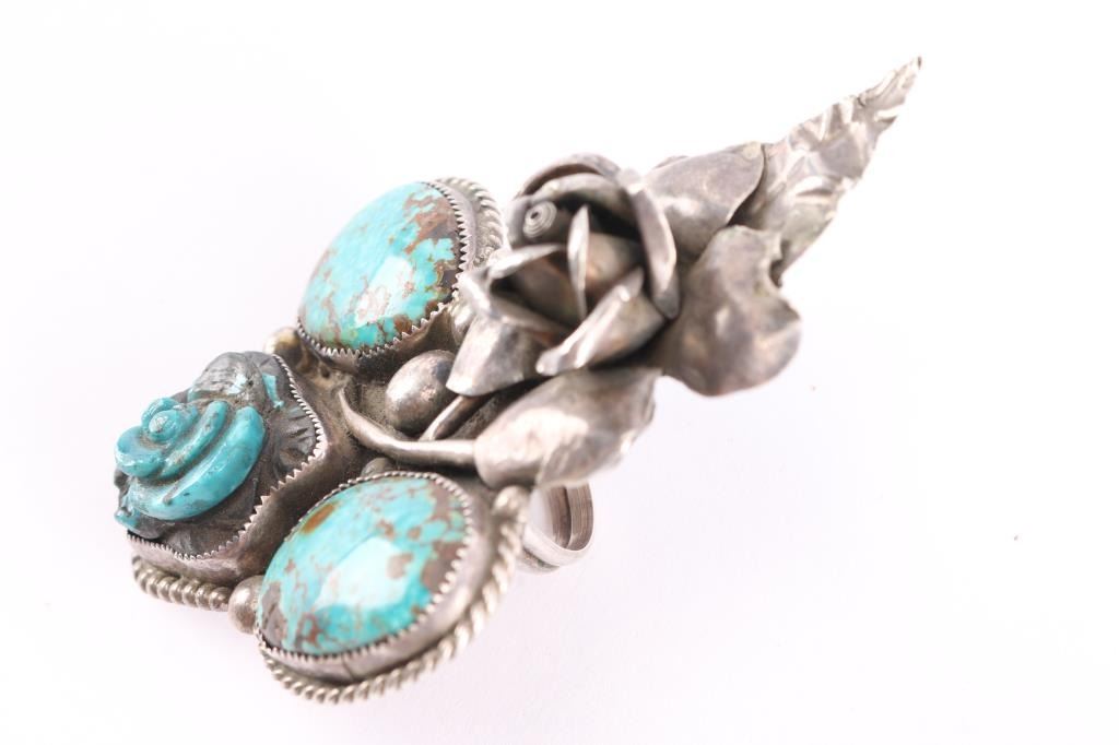 features a carved turquoise rose , two oval turquoise stone and a sterling rose. Beautifully made and intricate design makes a huge statement size 7.5. Measures 4.5" long by 3.5"wide.
