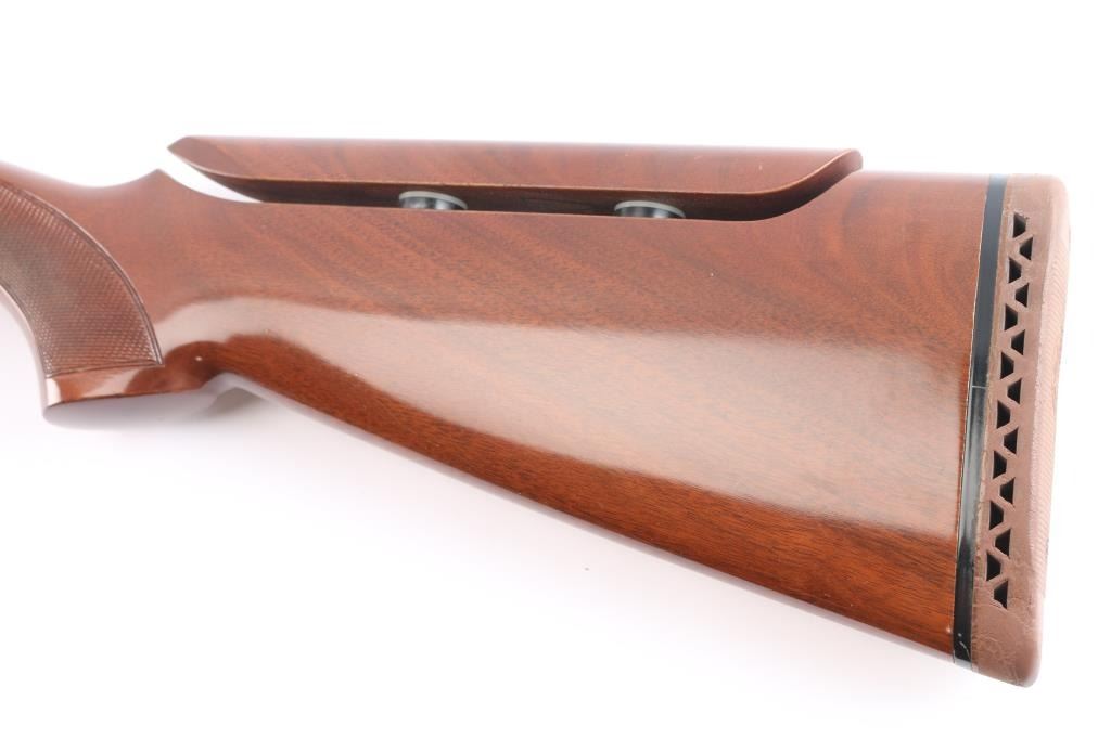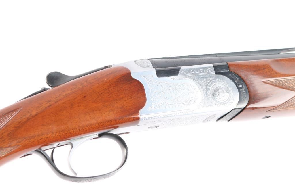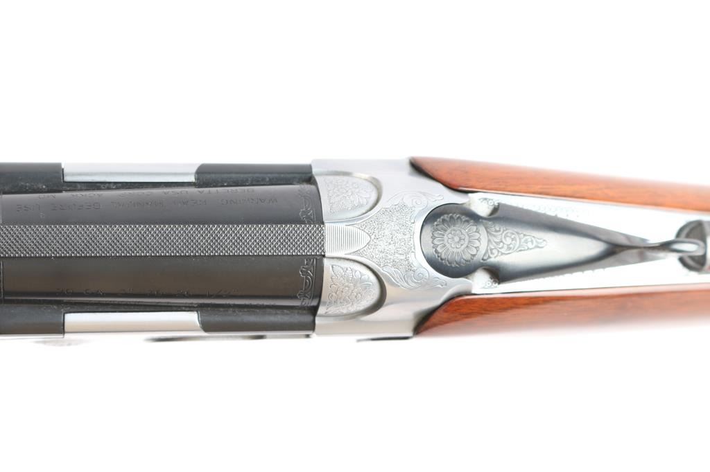 High quality engraved Italian made under/over double barrel shotgun chambered for 2 3/4" & 3" 20 gauge. Features blued 26 1/2" 20 gauge barrels with a ventilated sighting rib & Full over modified removable chokes, automatic ejectors, bead sight removed, fine floral scroll engraved receiver with electroless nickel finish, smooth single trigger, sliding tang safety with sliding barrel selector, high gloss checkered walnut forend and pistol grip shoulder stock with factory recoil pad, adjustable comb & 14 3/4" LOP. Shotgun exhibits approximately 99% of it's original finish with minimal wear observed. Action is crisp, bores are excellent and wood stocks are fine.