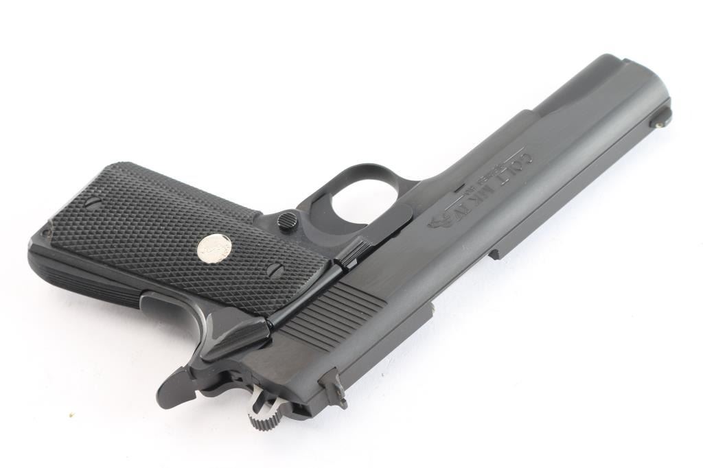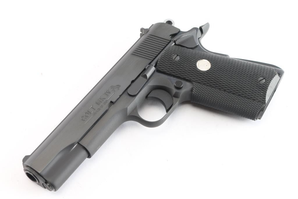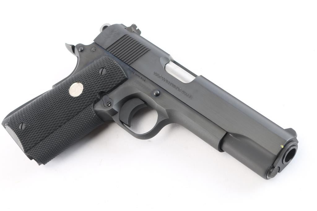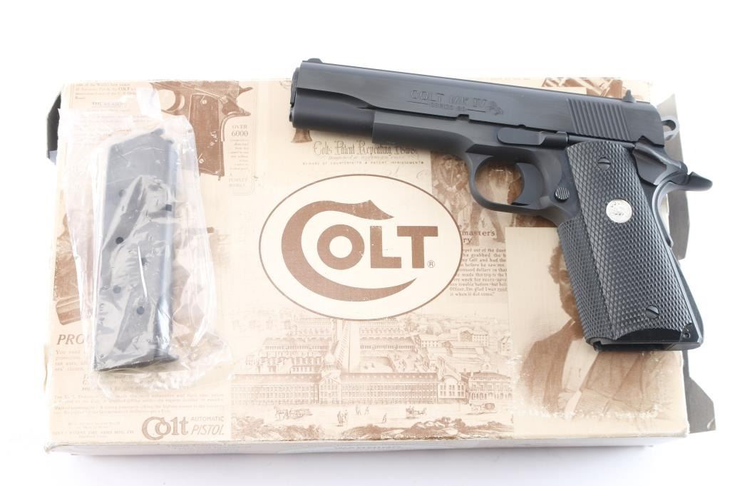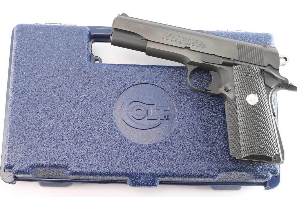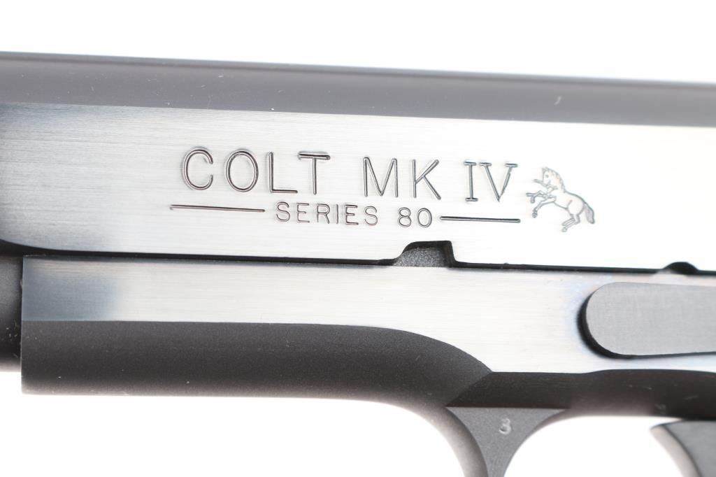 ‘MK IV Series 80’ Single-action semi-automatic 1911 pattern pistol chambered in .45 Auto. Mfg. circa 1995. Features a satin blued finish with polished flats, 5" barrel, 3-dot sights, lowered & flared ejection port, smooth curved trigger, skeletonized hammer, frame mounted thumb safety on the left side, grip safety, serrated & arched mainspring housing, factory 8 round magazine and checkered black rubber wrap-around grip with silver Colt medallions. Includes the original factory cardboard sleeve and blue hard case with hang tag & documents. The cardboard sleeve is dilapidated with torn flaps, matching end label is present. Pistol retains approximately 99%+ original finish showing little to no visible wear. The action is mechanically sound, the bore is excellent and the rubber grips are excellent.