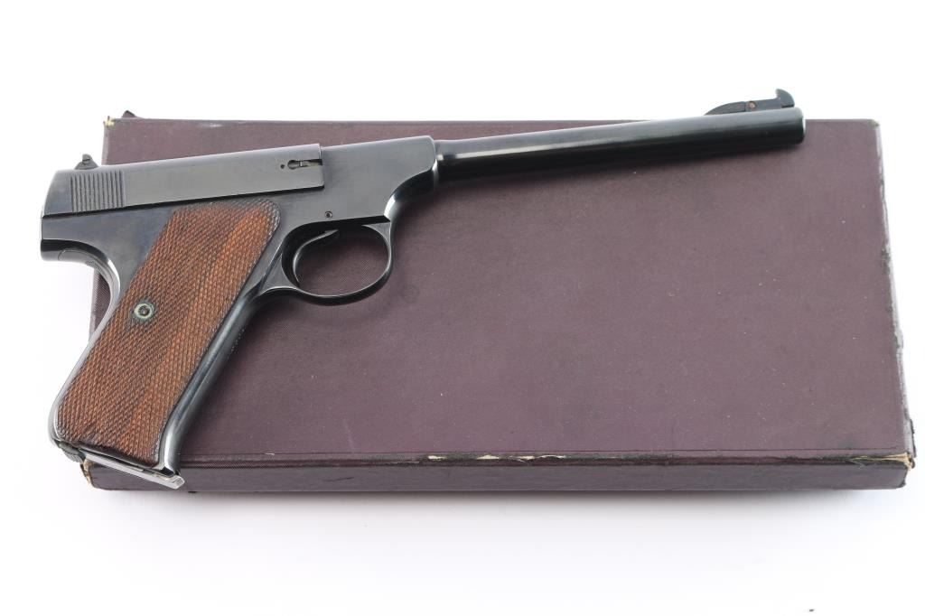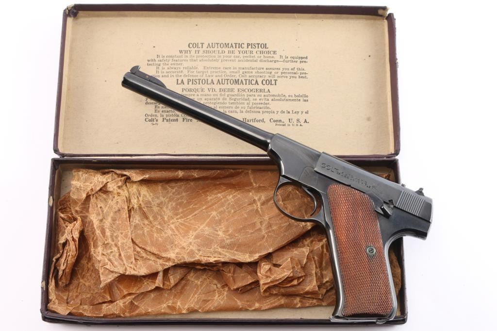 This Colt Target Pistol or "Pre-Woodsman" , first series that became the "Woodsman" in 1927. Vintage semiautomatic rimfire pistol, circa 1924. Features blued finish, 6-5/8" pencil barrel, pinned blade front & windage adjustable rear sights, manual safety acts as slide lock, heel mag release, early diamond pattern checkered walnut grips, correct two tone Colt magazine. Oval area of knurling on mainspring housing (fits against web of hand) indicates this pistol is for "low speed" ammo only.. Bore is excellent/bright. Retains about 99% original finish. Grips are excellent, Colt markings are crisp. Comes with original brown cardboard Colt factory box