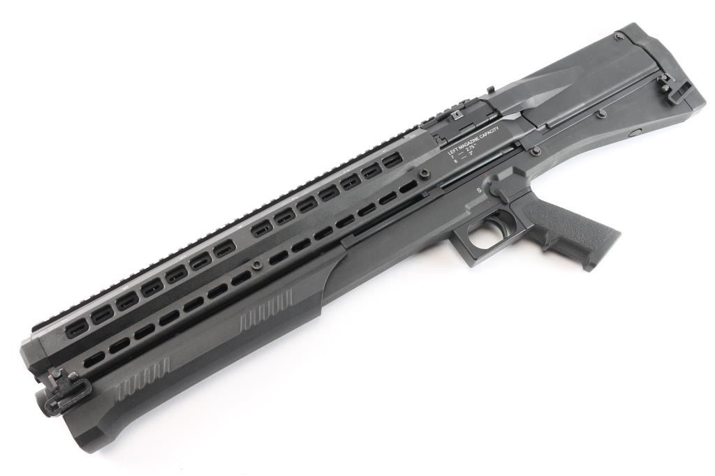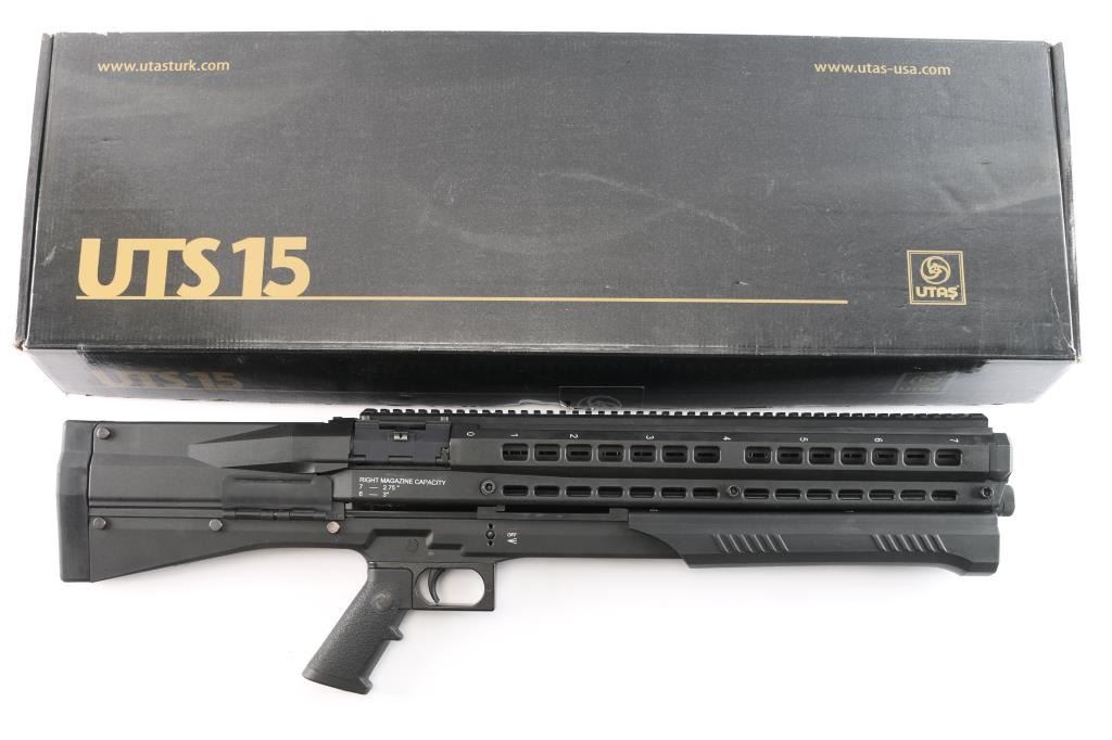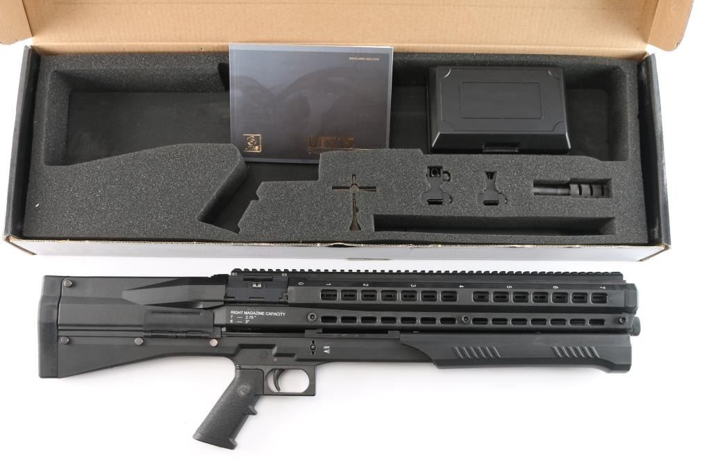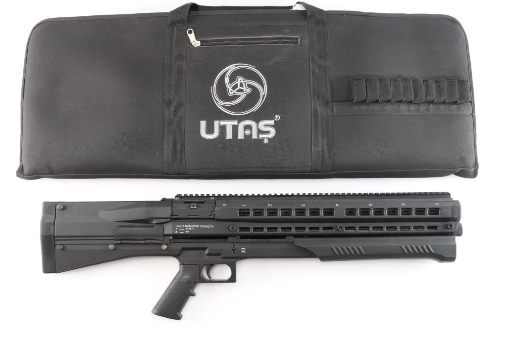 ‘Out-of-Production’ High capacity bullpup designed slide action shotgun chambered for 2 3/4" or 3" 12 gauge shells. Manufactured in Des Plaines, IL by UTAS-USA. Features a black fiber reinforced injection molded polymer body with 19” optics rail on the top, 18.5" barrel, extended screw-in cylinder choke tube, twin 7 round tube magazines with snap open loading ports, three-position magazine selector lever on the top, two-position safety selector on the left side, smooth curved steel trigger, magnetized ejection port cover on the right side, QD sling swivels and rubber recoil pad. Includes the original factory box with tool, set of aluminum sights adjustable for elevation & windage, breacher choke tube, 7.5” barrel extension and light/laser combo unit that mounts in the gun below the barrel & is activated by a three-position selector lever that mount on the right side forward of the trigger. Also includes a factory carry case. Shotgun exhibits little to no visible wear. The action is smooth/sound, the bore is excellent, and polymer is excellent.