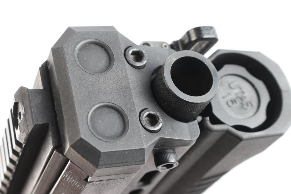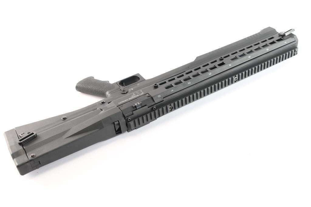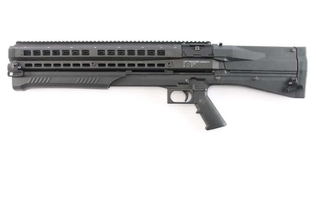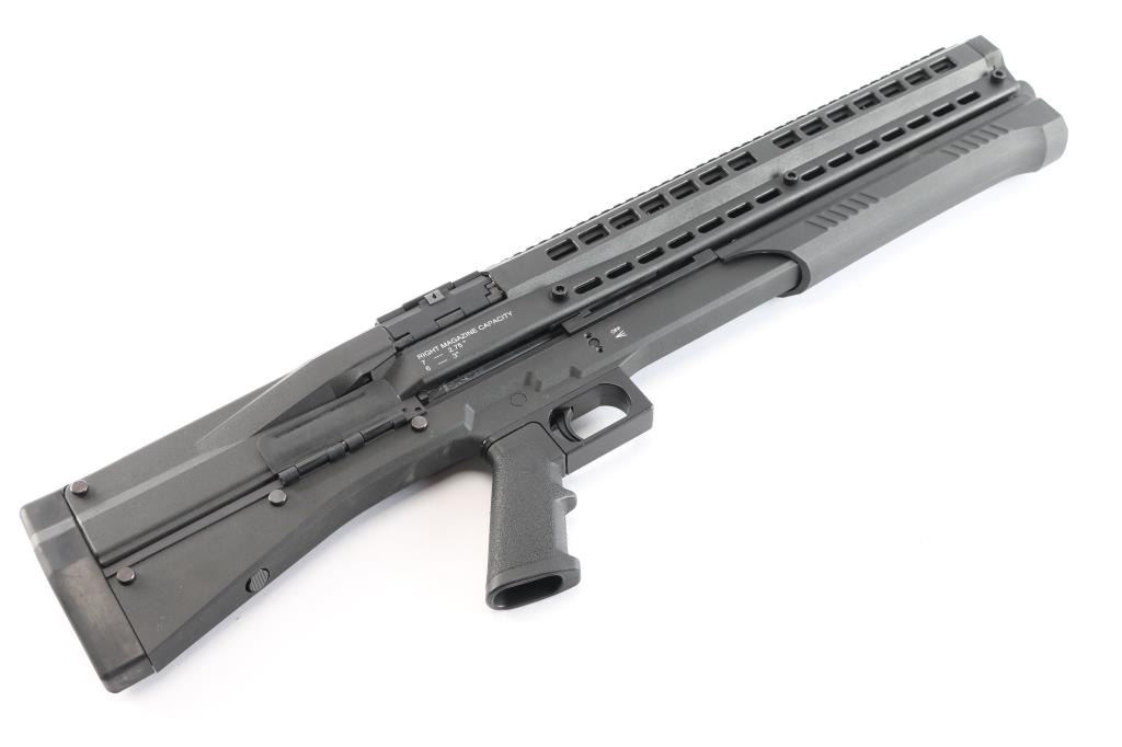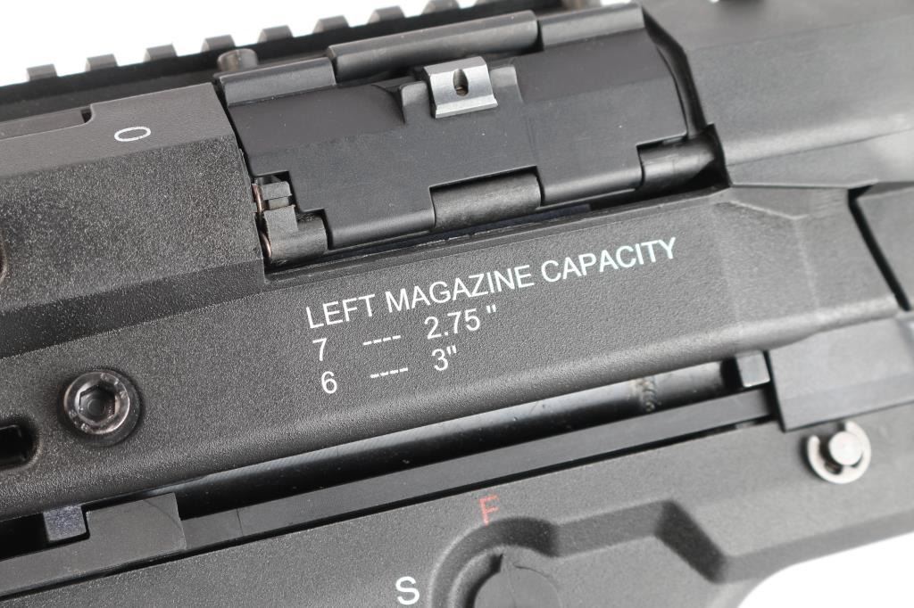 ‘Out-of-Production’ High capacity bullpup designed slide action shotgun chambered for 2 3/4" or 3" 12 gauge shells. Manufactured in Des Plaines, IL by UTAS-USA. Features a black fiber reinforced injection molded polymer body with 19” optics rail on the top, 18.5" barrel, extended screw-in cylinder choke tube, twin 7 round tube magazines with snap open loading ports, three-position magazine selector lever on the top, two-position safety selector on the left side, smooth curved steel trigger, magnetized ejection port cover on the right side, QD sling swivels and rubber recoil pad. Includes the original factory box with tool, set of aluminum sights adjustable for elevation & windage, breacher choke tube, 7.5” barrel extension and light/laser combo unit that mounts in the gun below the barrel & is activated by a three-position selector lever that mount on the right side forward of the trigger. Also includes a factory carry case. Shotgun exhibits little to no visible wear. The action is smooth/sound, the bore is excellent, and polymer is excellent.