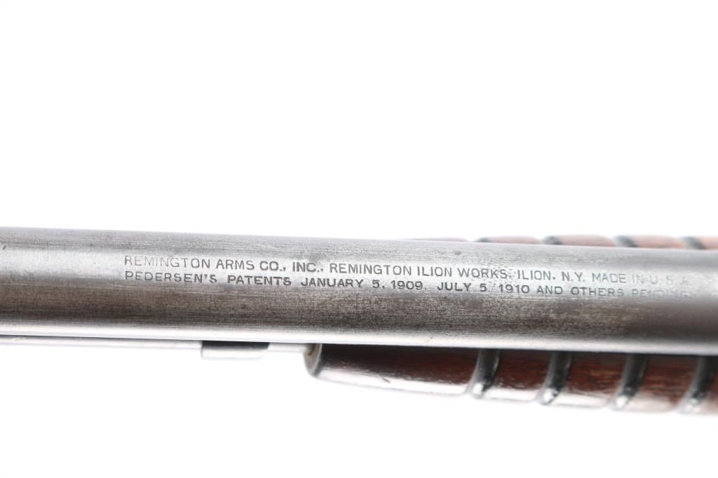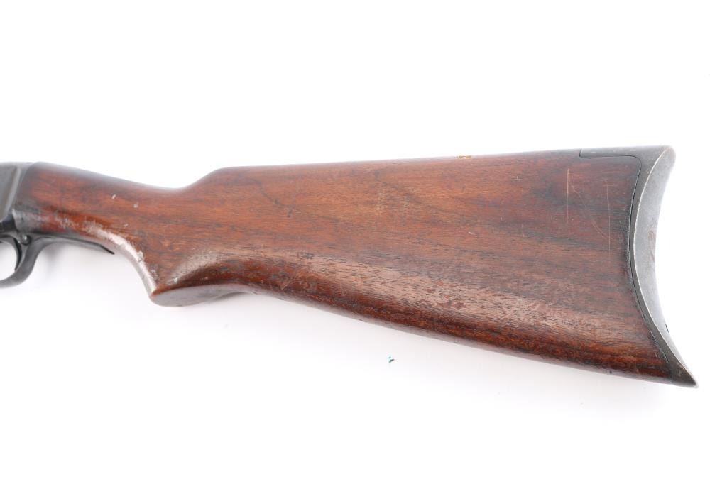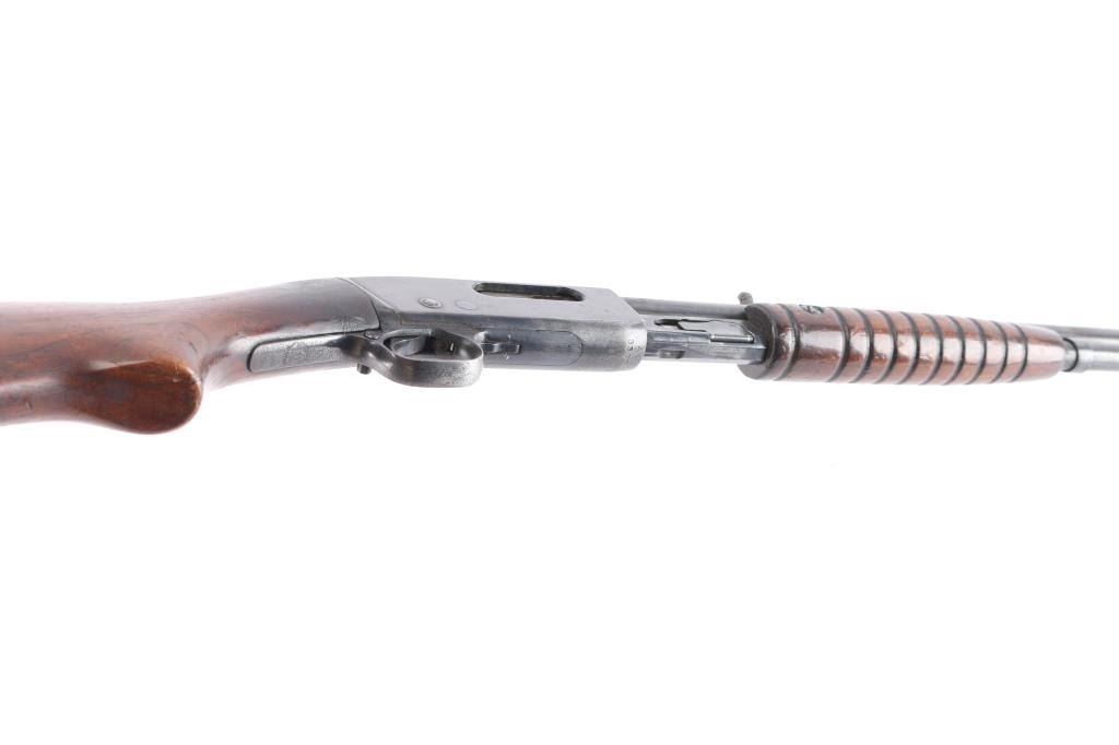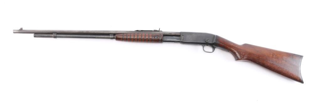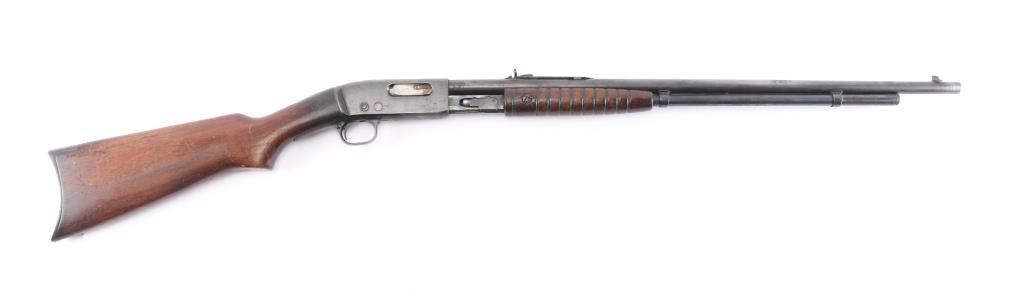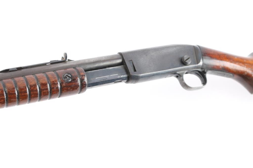 Vintage take down pump action rifle manufactured circa 1923. (1923-35) First year of manufacture. Features blued finish, grooved walnut pump handle, smooth walnut shoulder stock with curved wrist & factory steel crescent buttplate, 24" barrel, magazine tube under barrel, dovetailed blade front sight with beaded top, sporting rear sight, push button manual safety, takedown screw on left side of receiver. Bore is dark/rough. Retains about 60% finish overall, with handling/friction loss, scratches, light scattered pitting, mostly on the receiver. Wood is good, varnish appears to be added after it left the factory. Action is smooth.