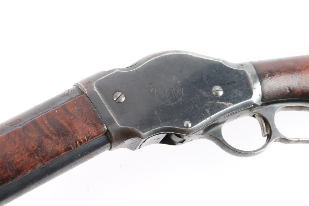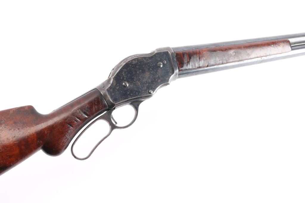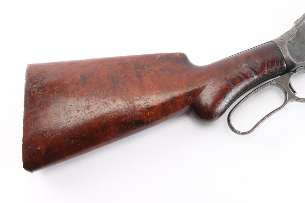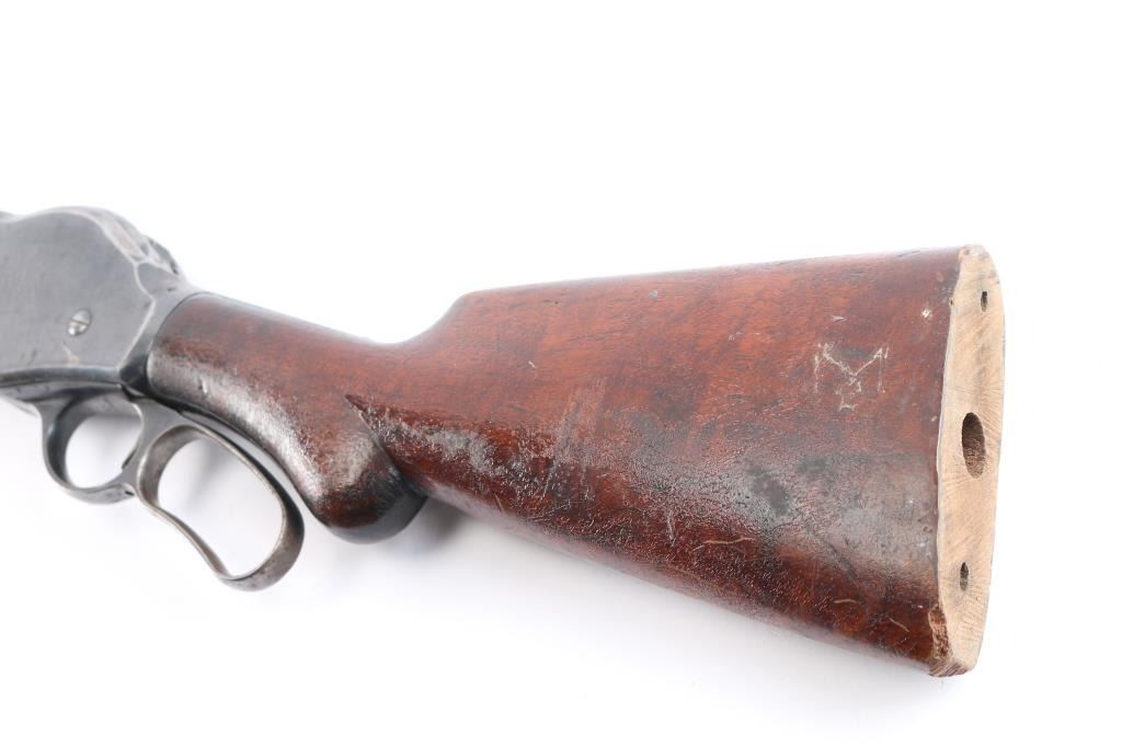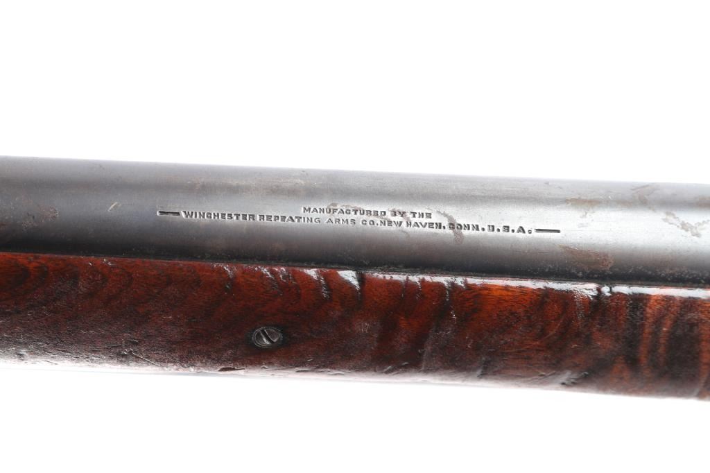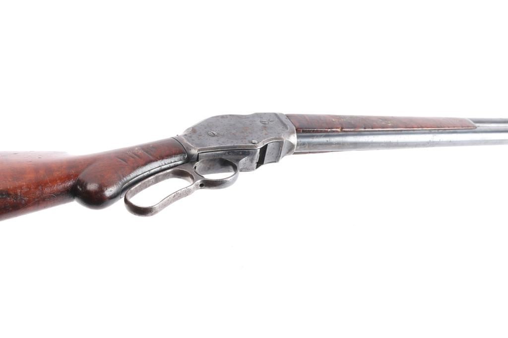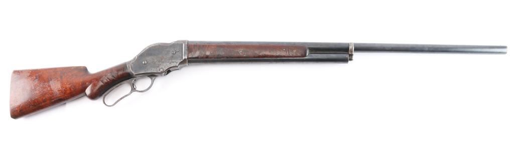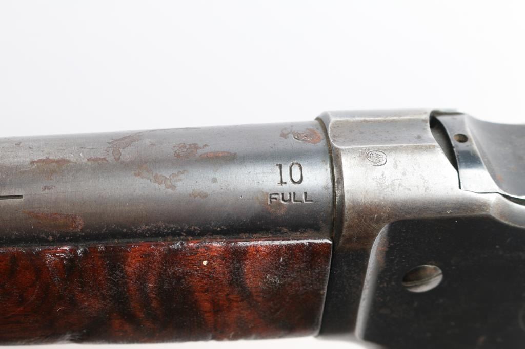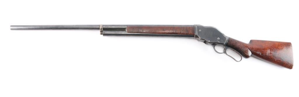 Antique lever action repeating shotgun chambered for black powder 10 gauge shells, manufactured circa 1889. Features a blued refinish, 32" plain barrel, steel bead front sight, 'u' notched rear indexing point, 5 round tube magazine, smooth trigger, exposed hammer with knurled spur, curved finger lever, steel receiver with an intertwined WRA Co monogram, smooth two-piece walnut forend scales, and semi-pistol grip shoulder stock, missing buttplate. 12" LOP. Bore is good/bright, needs cleaning. Metal surfaces retain about 655 original blue somewhat faded with age, showing edge/handling wear, the receiver and lever have scattered patches of pitting. Winchester Markings are clear, readable. Wood is good solid condition with varnish refinish, many small dents, scuffs in finish & scratches. Lever action is smooth. The right grip has four large cut into it, period done. Used by, Various Law enforcement agencies and Stagecoach companies.