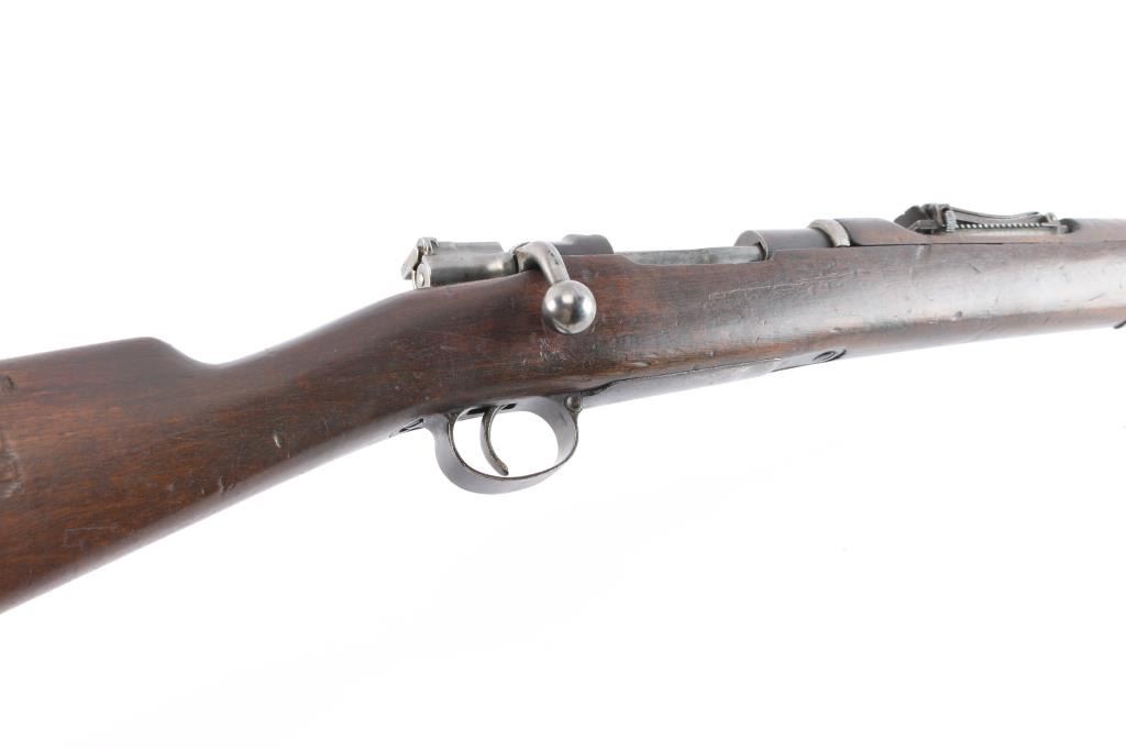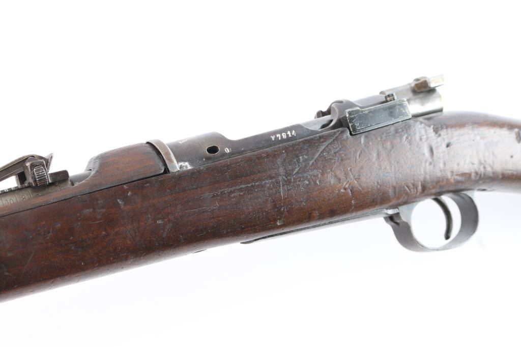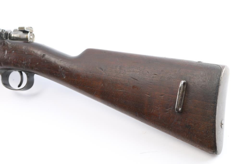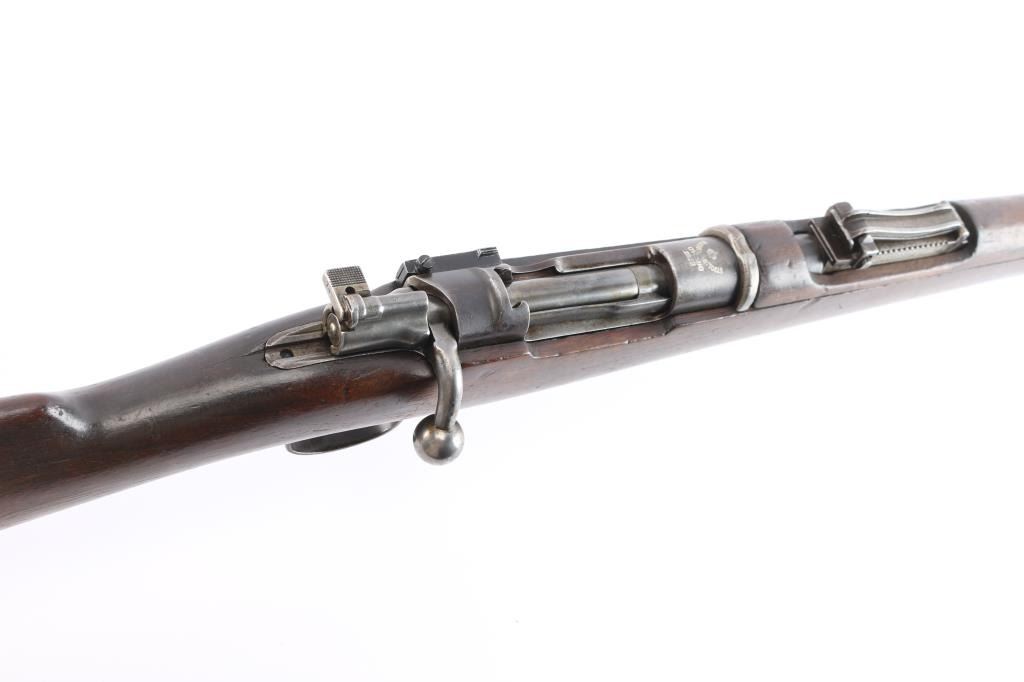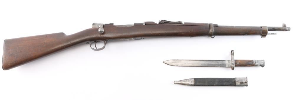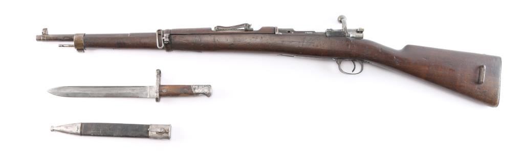 Spanish military bolt action "short" rifle dated 1922. No import marks observed. First pattern, with "Lange Vizier" or "roller coaster" rear sight, uncommon as most were later replaced with the flat tangent sight. Features 22" barrel, dovetailed front sight, bayonet lug, cleaning rod, manual safety, hinged floor plate. Bore has strong rifling with dark grooves. Blued finish has faded to brown, with bare metal on high spots. Wood is fair to good condition, with dings and dents, handguard is loose. Includes proper bayonet with leather scabbard, in fair to good condition.