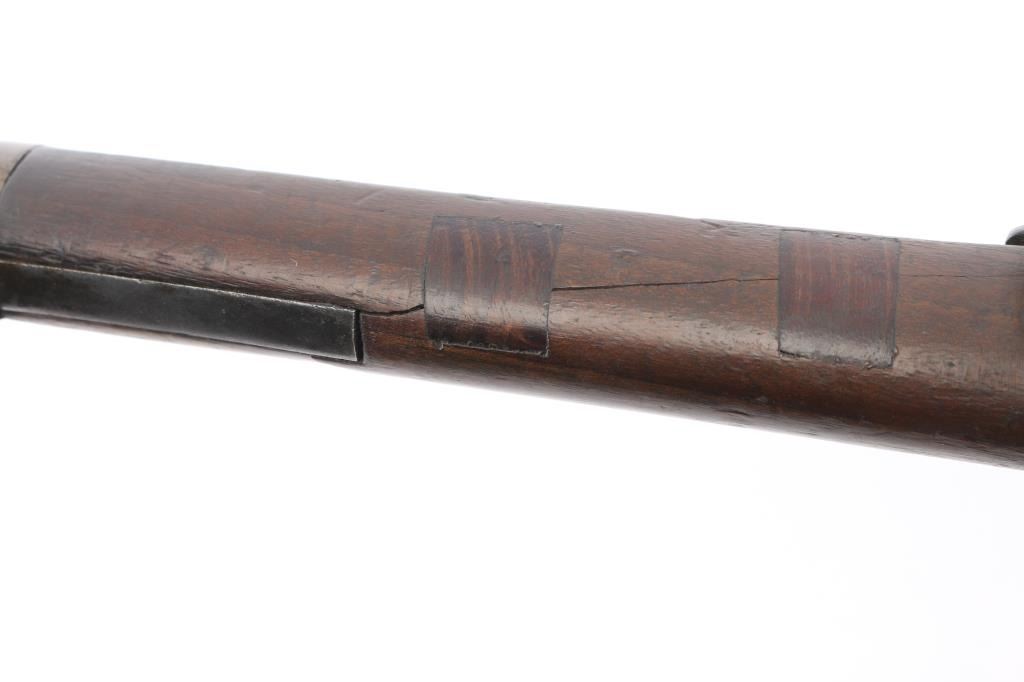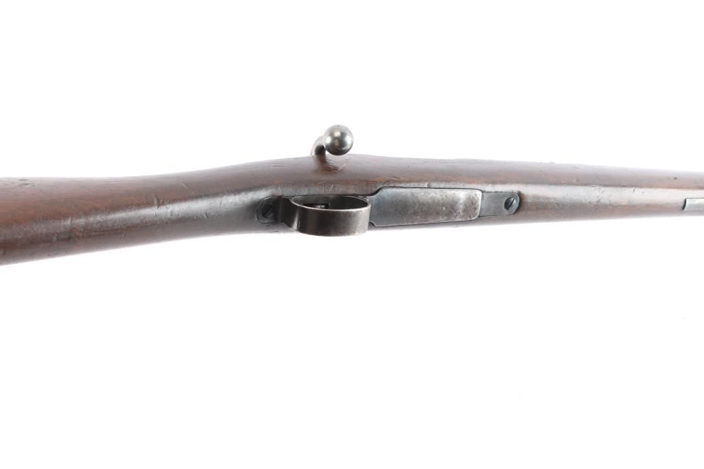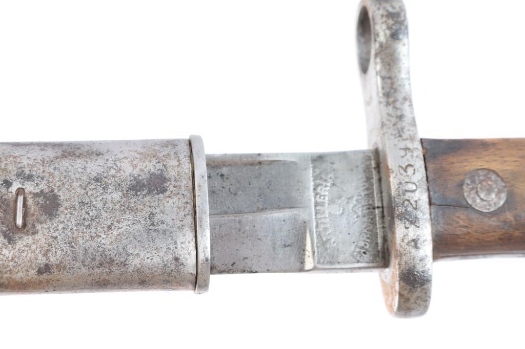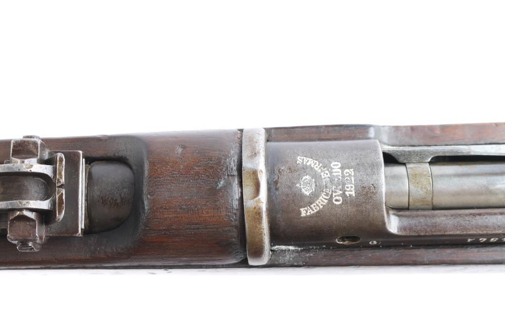 Spanish military bolt action "short" rifle dated 1922. No import marks observed. First pattern, with "Lange Vizier" or "roller coaster" rear sight, uncommon as most were later replaced with the flat tangent sight. Features 22" barrel, dovetailed front sight, bayonet lug, cleaning rod, manual safety, hinged floor plate. Bore has strong rifling with dark grooves. Blued finish has faded to brown, with bare metal on high spots. Wood is fair to good condition, with dings and dents, handguard is loose. Includes proper bayonet with leather scabbard, in fair to good condition.