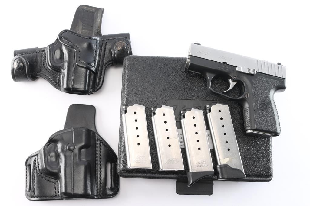 Striker fired double-action-only semi-automatic sub-compact pistol chambered in 9x19mm. Manufactured in Worcester, MA circa 2003 and subsequently upgraded by Cylinder & Slide of Fremont, NE with their Package 2 series of upgrades. Features a satin finished stainless steel slide with engraved Clyinder & Slide insignia, Lothar Walther 3.1” barrel with polygonal rifling & 11 degree crown, dovetailed XS Big Dot tritium front sight with high contrast white dot, dovetailed XS combat rear sight with tritium bar, polished curved trigger, beveled slide stop, serrated push button magazine release, factory 6 round magazine and black polymer frame with textured grip & modification to let magazines drop freely. Includes the original factory hard case with documents, spent case, OEM sights, three spare 6 round OEM magazines, and a 7 round magazine with extended baseplate. Also includes two Bulman Gunleather smooth black leather OWB holsters. Pistol exhibits contact wear on the barrel hood with no other wear observed. The action is mechanically sound with an improved trigger pull, the bore is excellent, the tritium sights appear to have no luminescence, and the polymer is excellent.