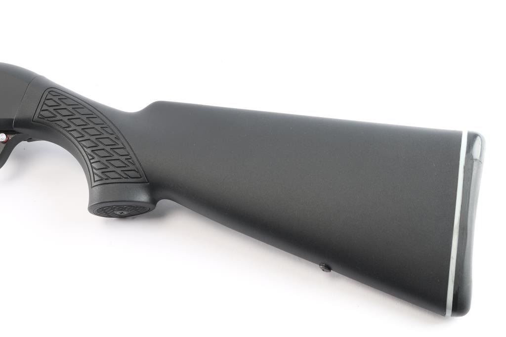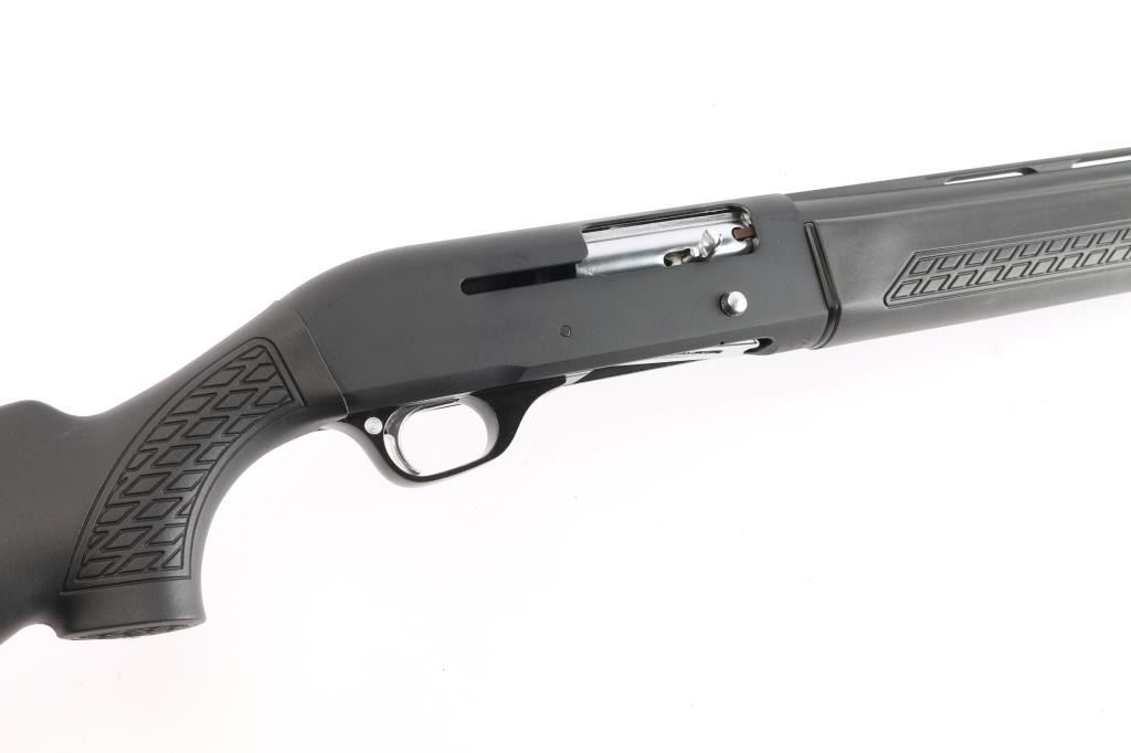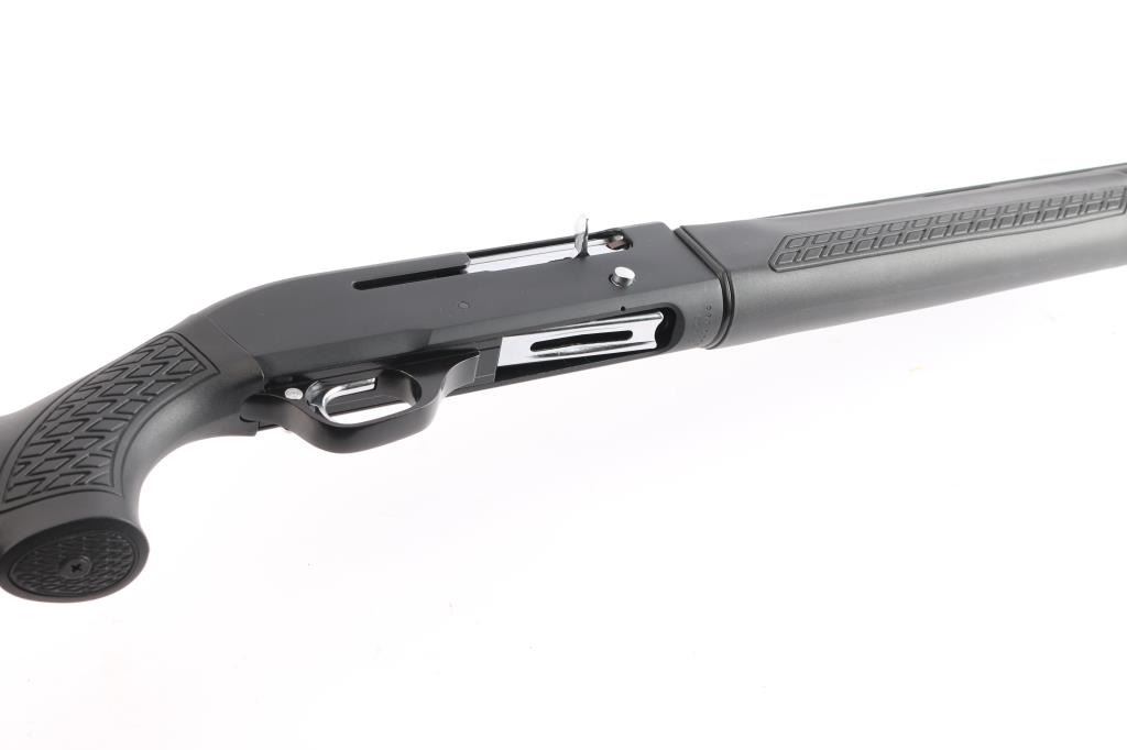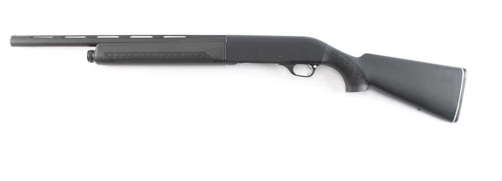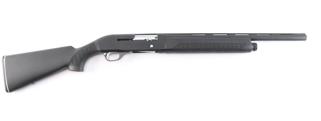 Gas operated semi-automatic shotgun chambered in 12 gauge, accepts 3" shells, light weight alloy receiver, matte black finish, 20" vent rib barrel, brass sighting bead, accepts screw in chokes with Modified installed, 3/4 length tube magazine, push button safety, black polymer stock and forearm with diamond shaped checkered panels, black buttplate with white spacer. Lop-14 1/2". Bore is pristine, shotgun is like new condition.
