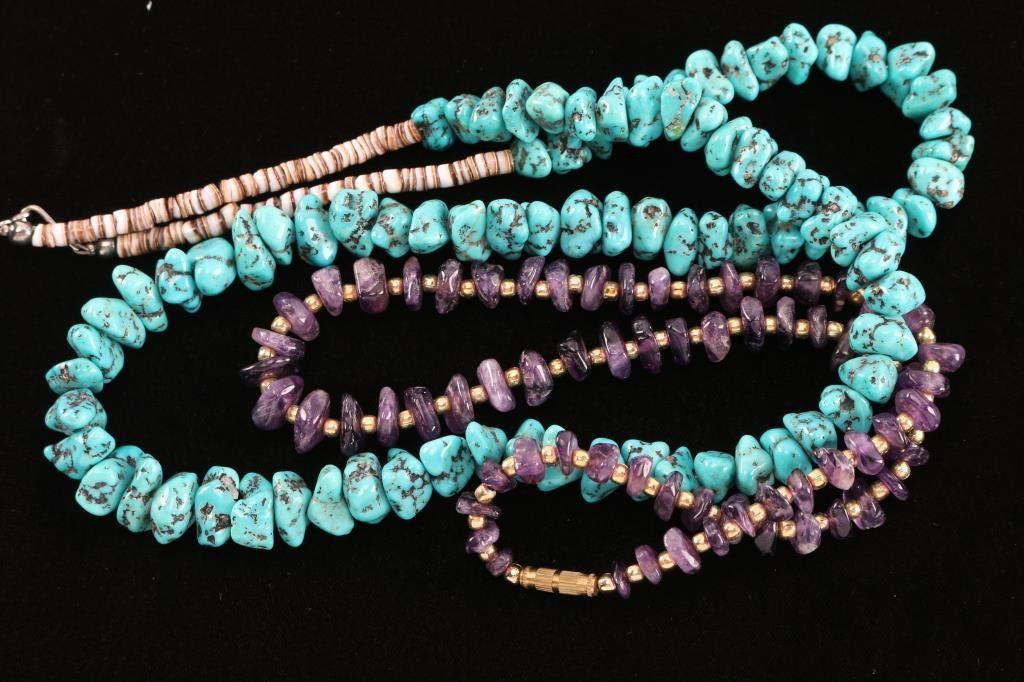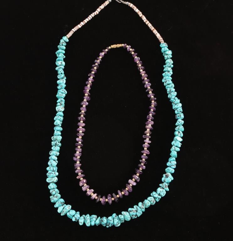 Long strand of turquoise nuggets with heishi at top, measures 13 1/2" from drop. Also, amethyst nugget necklace with gold tone beads in between, measures 8 1/2" from drop.