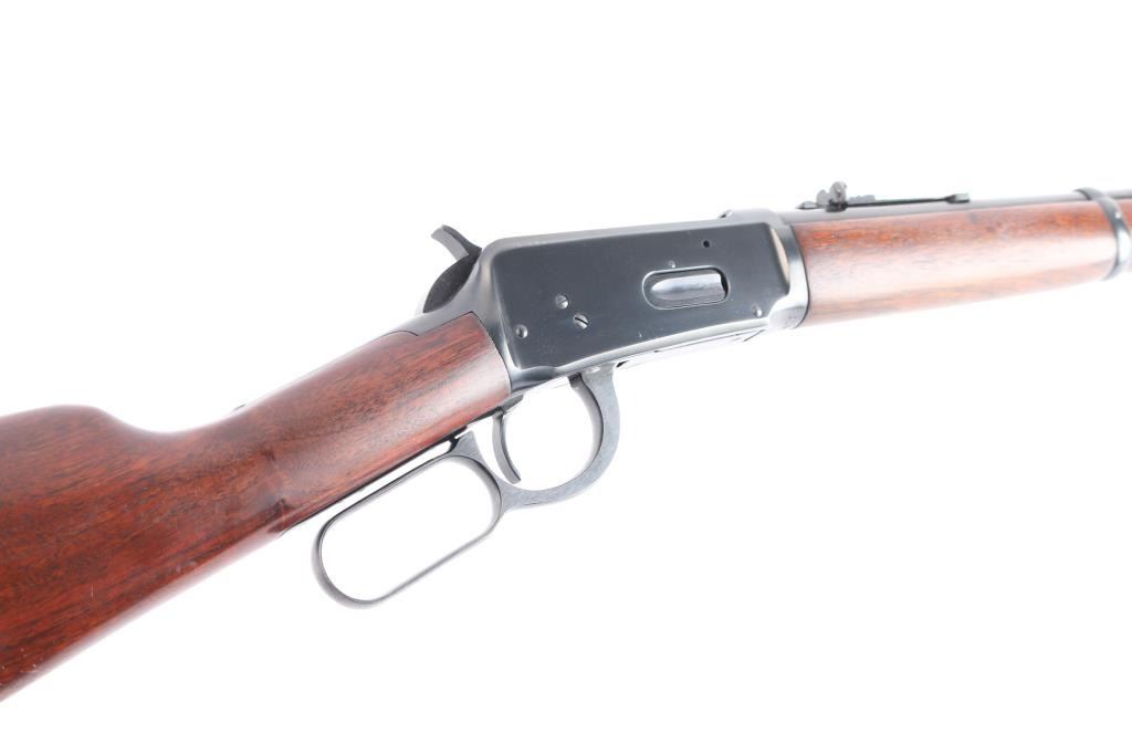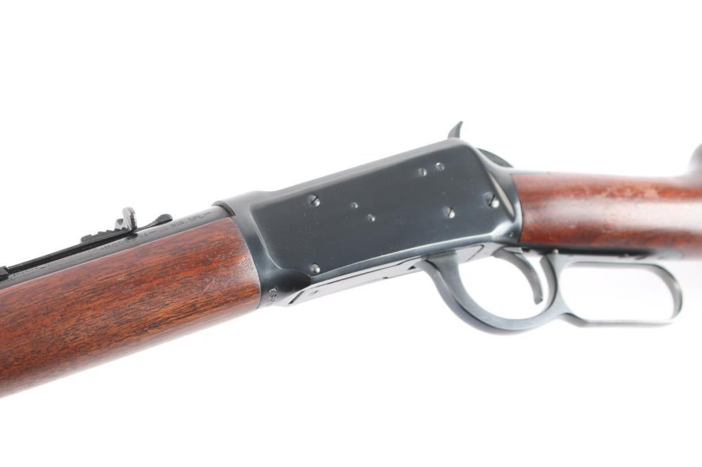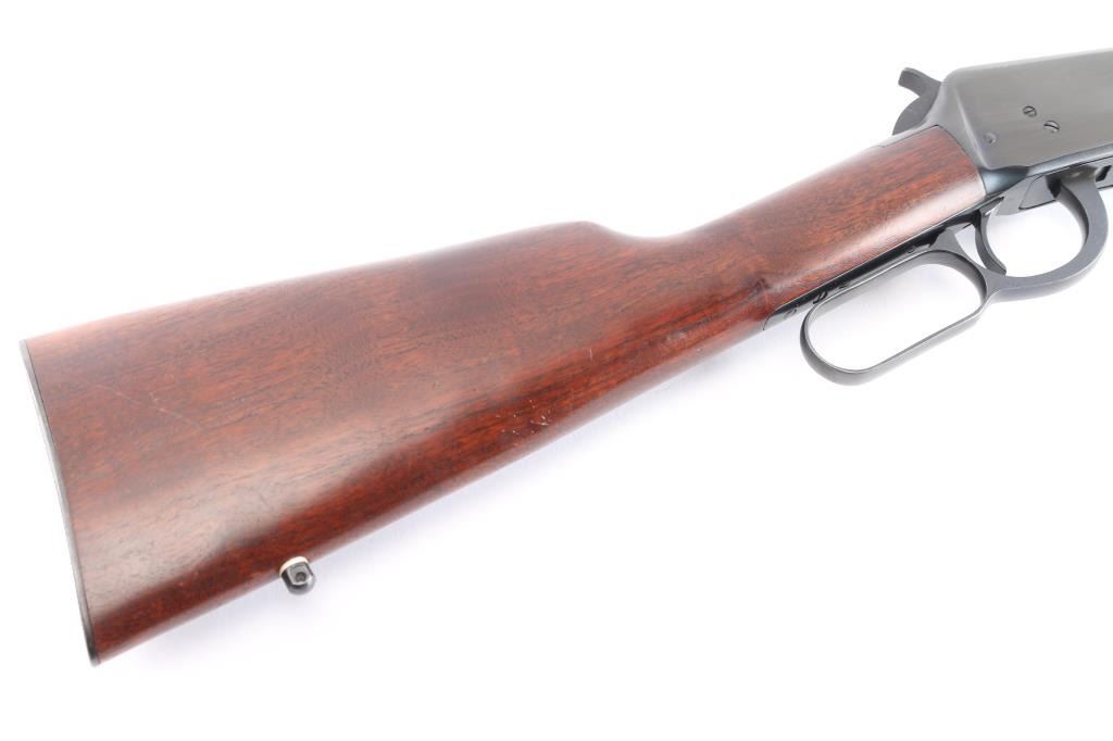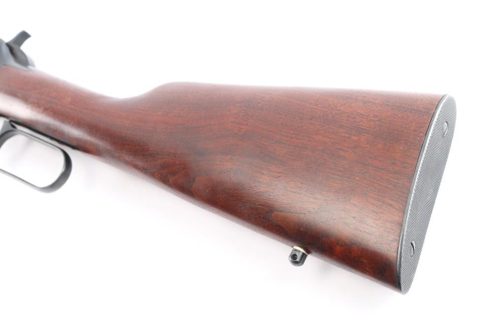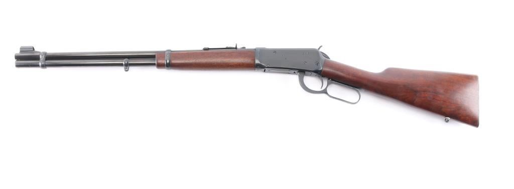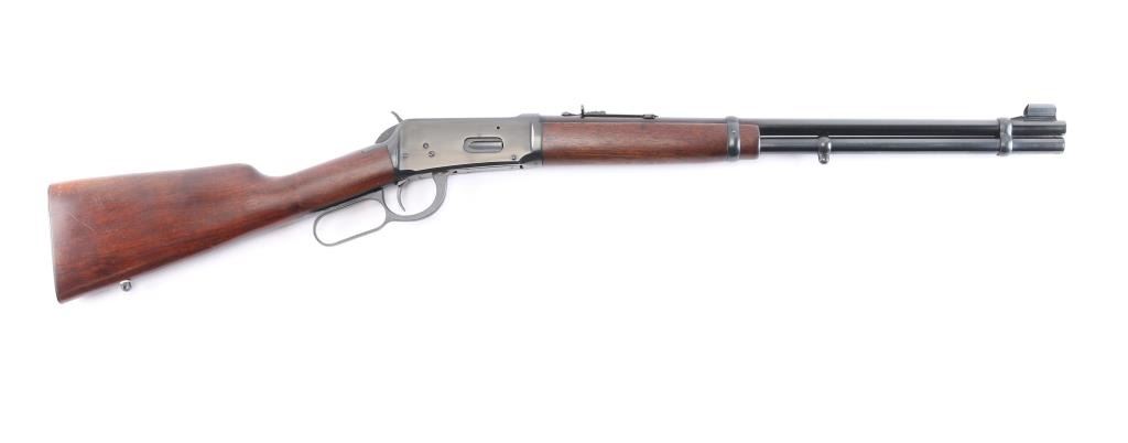 ''Pre-64 Eastern Carbine' Lever action repeating rifle manufactured in New Haven, CT circa 1955. Features a blued finish, 20" tapered barrel, full-length tube magazine, dovetailed raised, hooded blade/bead front sight, semi-buckhorn rear sporting sight, smooth trigger, knurled hammer spur, two barrel bands, lever safety, sling swivel studs, smooth walnut forend and straight grip shoulder stock with carbine steel checkered buttplate. Bore is excellent, bright, strong rifling. Retains about 98% blue finish with some very minor , scratches Wood is near excellent/sound with minor scratches. Action is smooth. Winchester markings are crisp/sharp.
