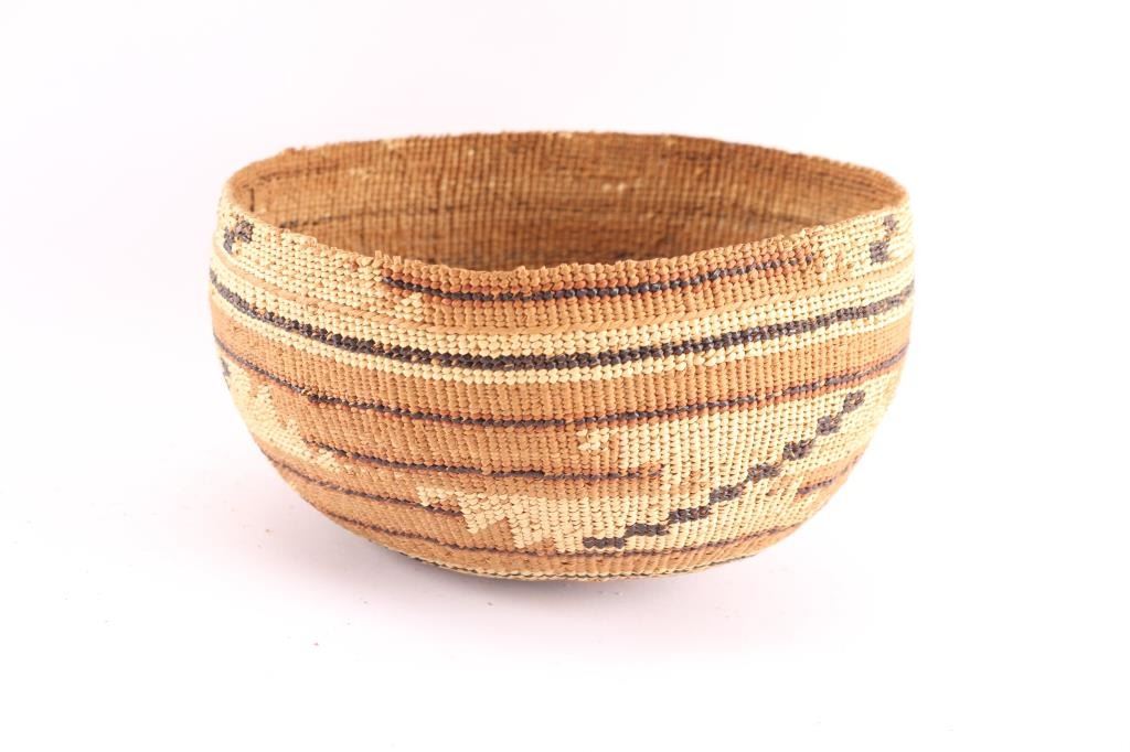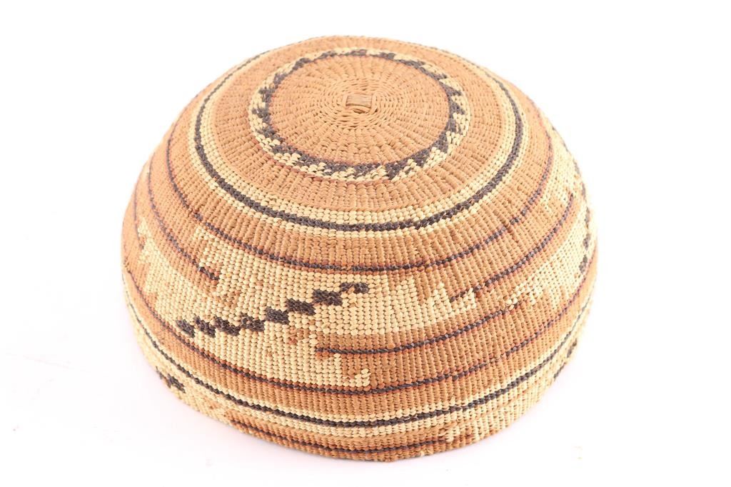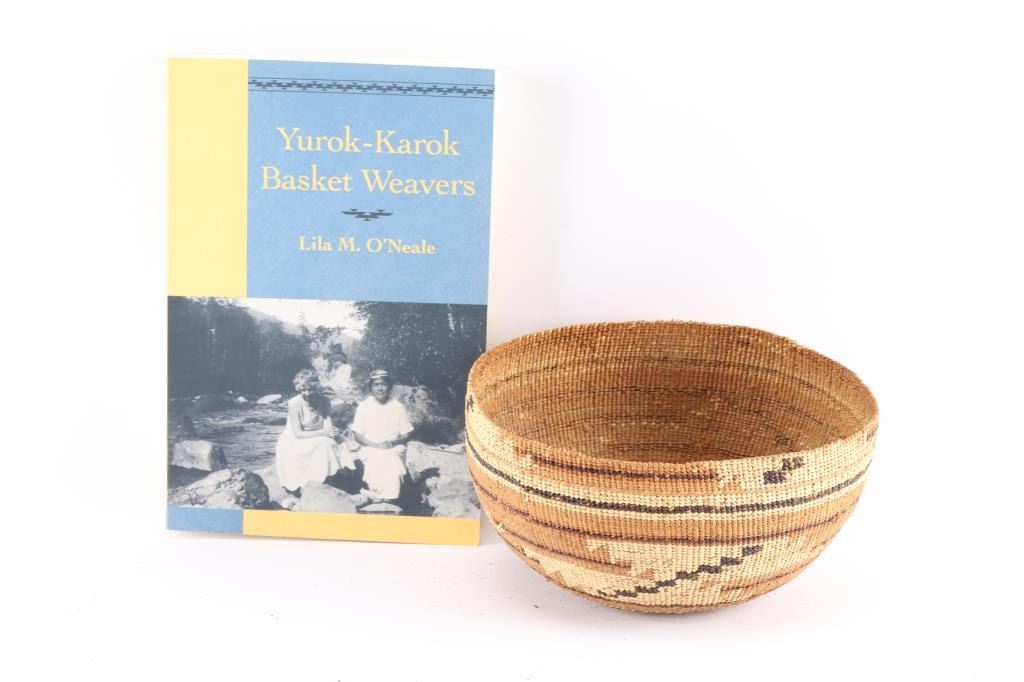 By the Yurokic Indians, circa 1910. Measures 7" diameter and 4" tall. With a geometrical step design. Includes a book on the Yurok-Karok Basket Weavers by Lila M. O'Neale, published 1995 in Berkley, CA.