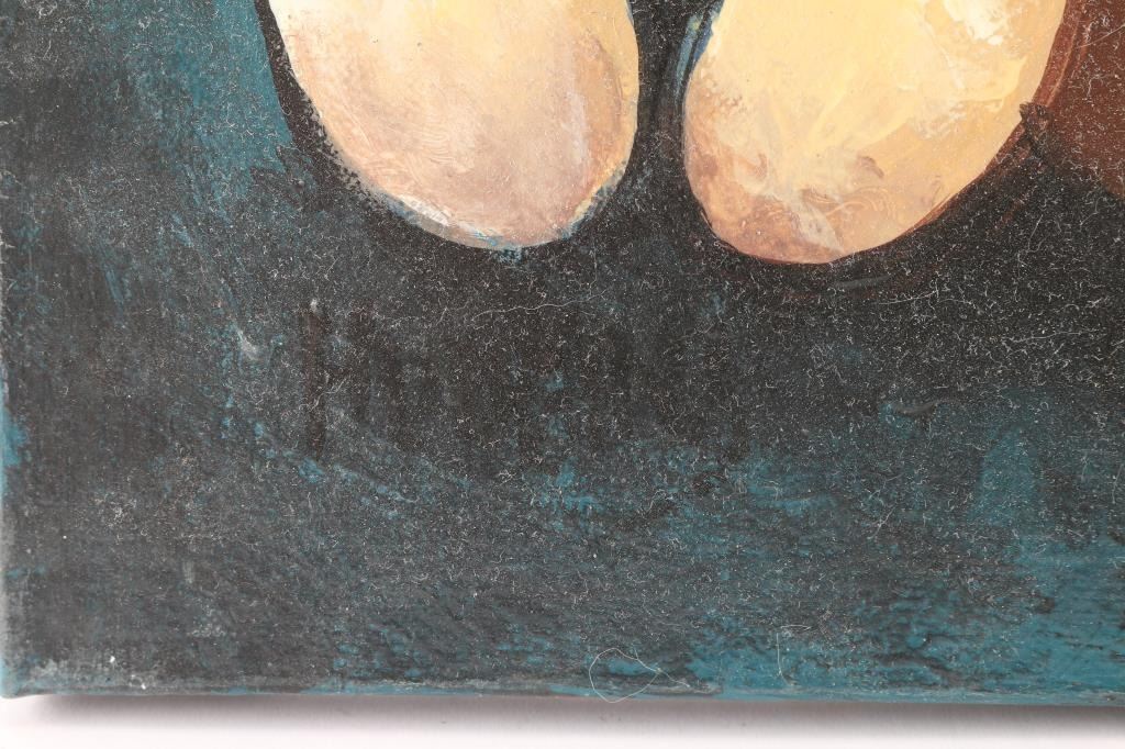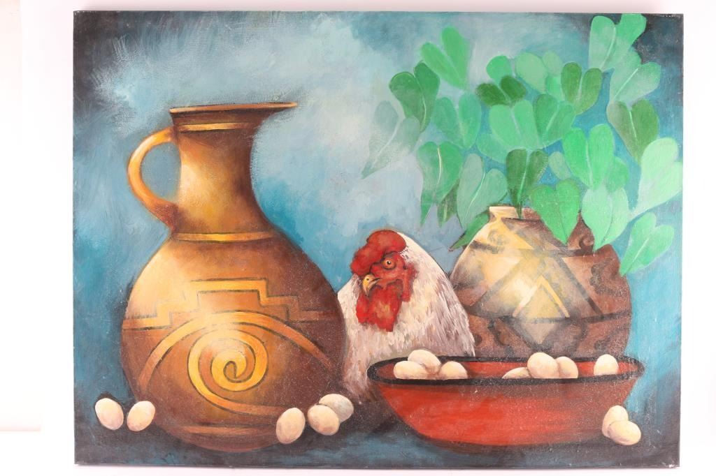 Titled "What Came First", by Native American artist Mary Margaret Hudgins. Signed lower left corner. Measures 30" by 40".