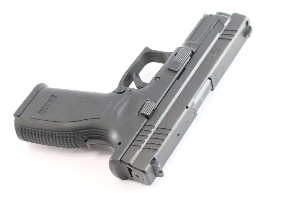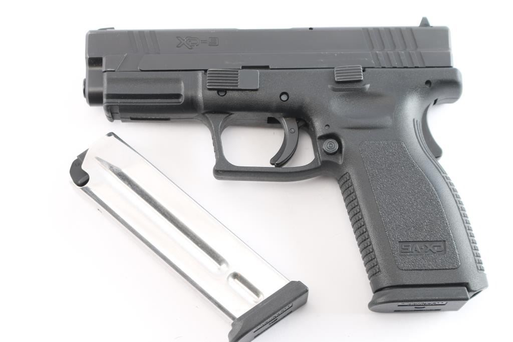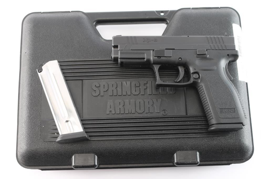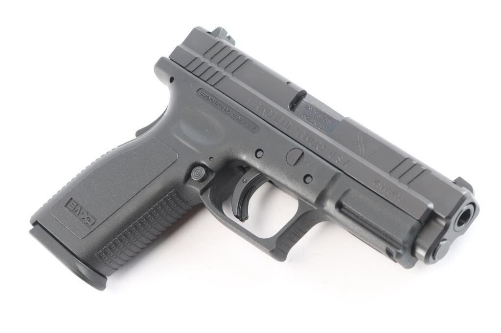 'X-treme Duty' Striker fired semi-automatic pistol chambered in 9x19mm. Manufactured in Croatia by HS Produkt and imported/marketed by Springfield Inc. of Geneseo, IL. Features a satin black Melonite finished slide with fore/aft cocking serrations, 4" hammer forged barrel, captive recoil spring, dovetailed three-dot steel sights, loaded chamber indicator on the top of the slide, cocked indicator on the rear, integrated trigger safety, grip safety, ambidextrous push button magazine release, factory 10 round magazine, and black polymer frame with integral accessory rail & textured grip. Includes a factory hard case with brush, test target, and spare magazine. Pistol exhibits approximately 96% of its original finish showing minor edge wear, contact wear on the barrel hood, and a few superficial scratches. The action is mechanically sound, the bore is excellent, and the polymer frame is excellent.