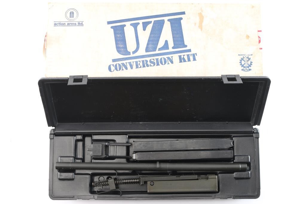 IMI Action Arms UZI 9mm to .45 ACP. conversion kit. Complete, includes a new barrel, magazine adapter, bolt with recoil spring, two IMI 16-rd magazines and manual. Like new condition, bore is pristine. Comes in original factory hard case with cardboard sleeve.