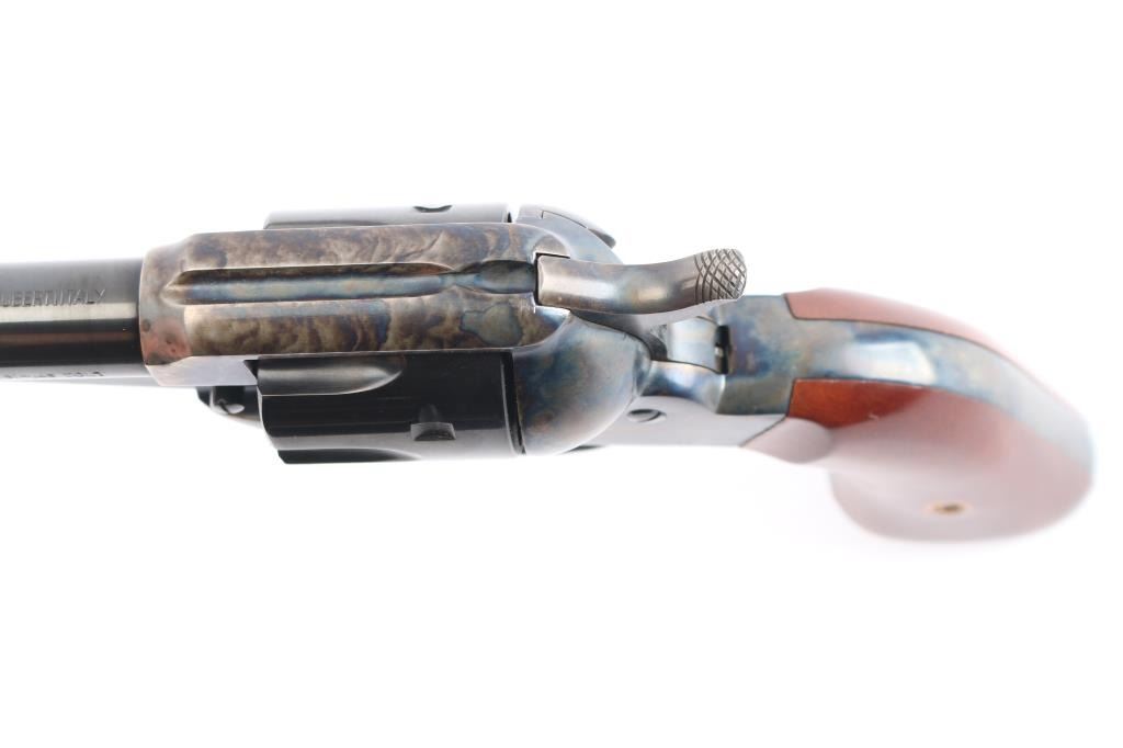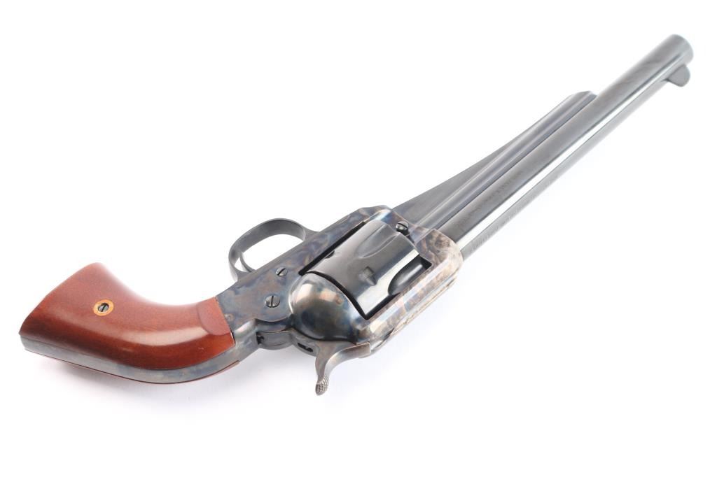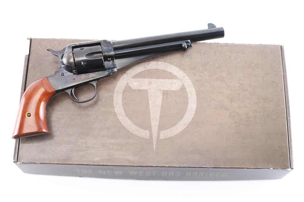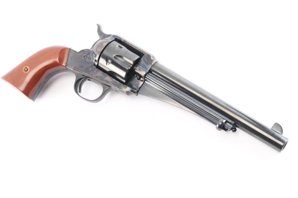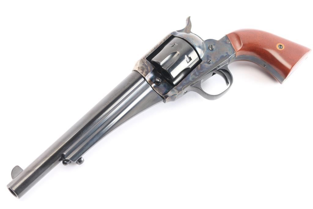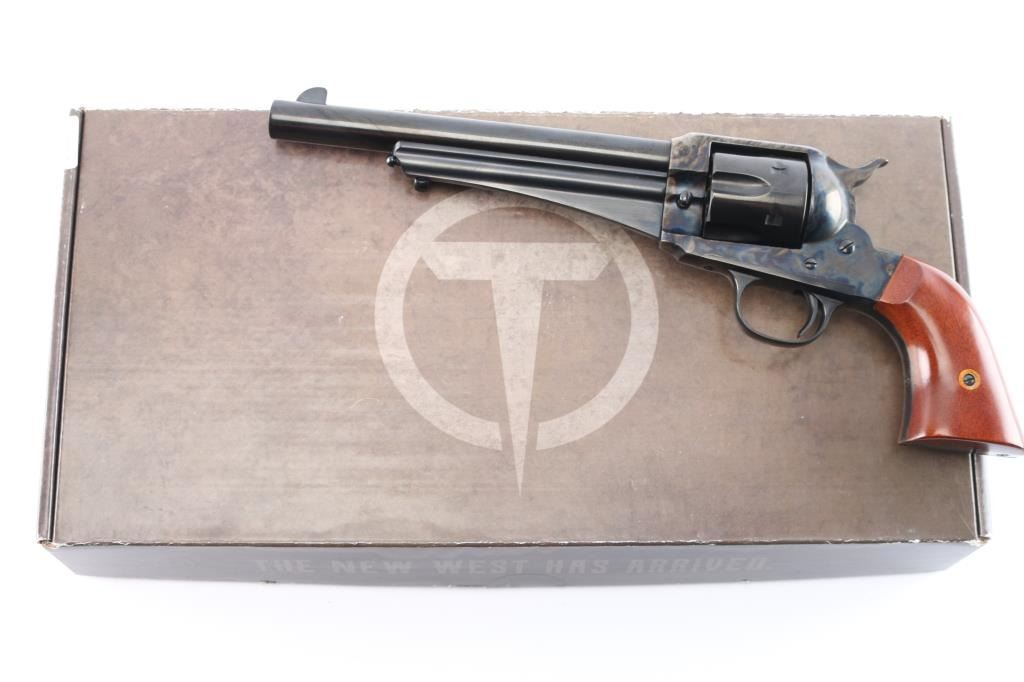 Reproduction of the Remington 1875 Single Action Army revolver, chambered in .45 Colt and manufactured in Italy by Uberti. Imported by Taylor's &. Co. of Winchester, VA with the import information incorporated into a 'barrel address' type marking. Features a blued & case hardened finish, 7 1/2" barrel, blade front sight, square notched rear sight, smooth wide trigger, knurled hammer spur, fluted six-shot cylinder, ejector rod with webbed housing, and two-piece vanished smooth wood grips. Revolver exhibits approximately 99% of it's original blued finish. Action is smooth with very good lock-up, the bore is pristine and the wood grips are near fine. Comes in a non-matching box with cable lock and black nylon soft case.