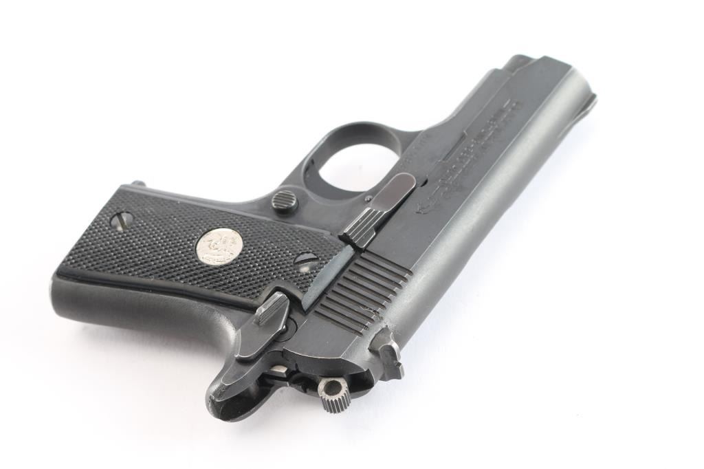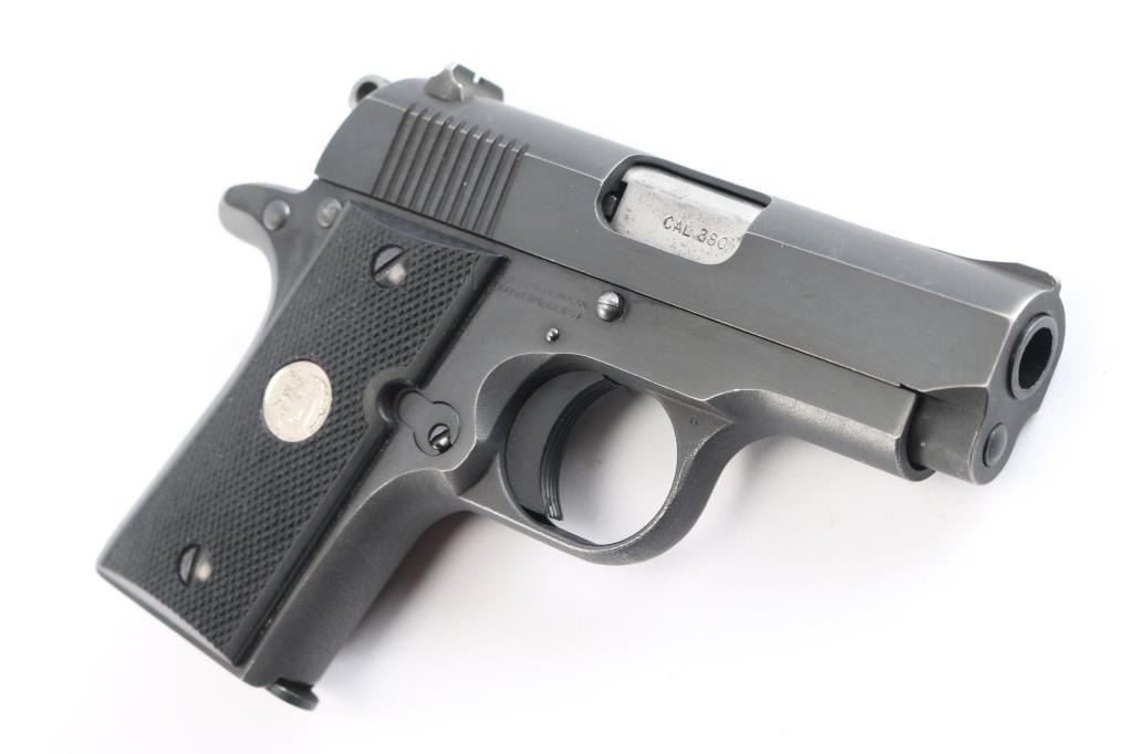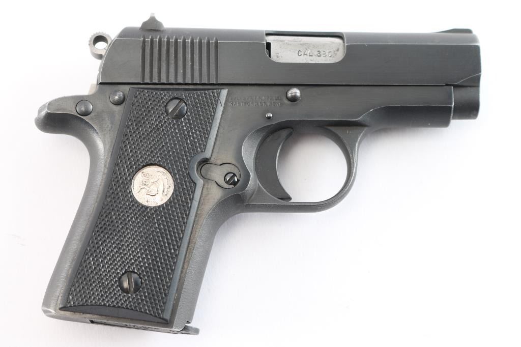 'MK IV/Series'80' Semi-automatic pocket pistol chambered in .380 Automatic. Manufactured 1986 in Hartford, CT. Features a blued finish, 2 3/4" barrel, fixed front sight, dovetailed rear window sight, serrated trigger, push button magazine release, factory 6-rd magazine, thumb safety, serrated round hammer spur and two piece Colt medallion checkered black plastic grips. Pistol exhibits slight edge wear Approximately 95% of the finish is intact overall. Action is crisp, bore is excellent/bright and grips are excellent. Comes with spare factory 6-rd magazine. (2) Total.