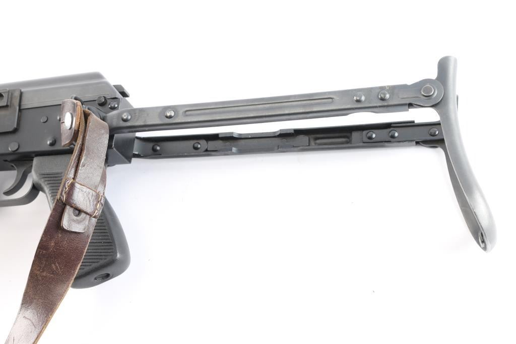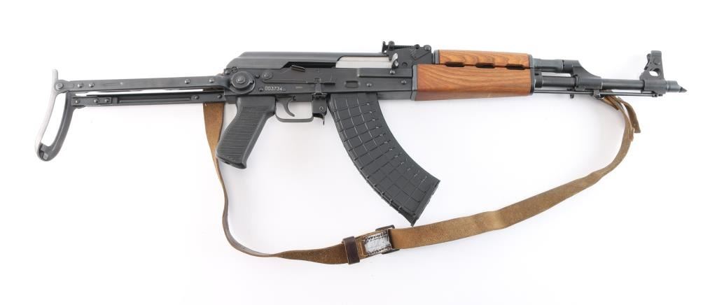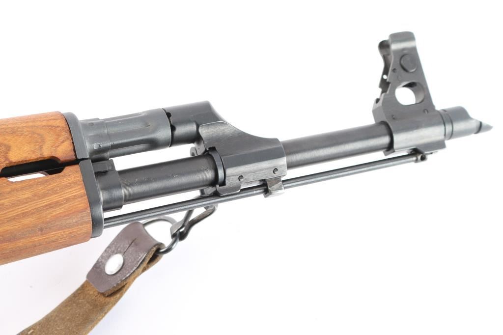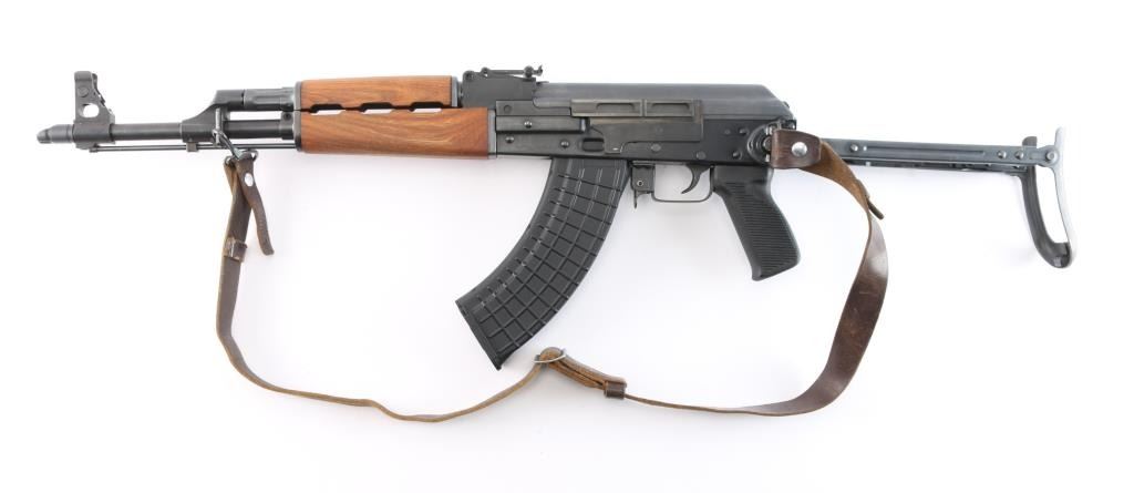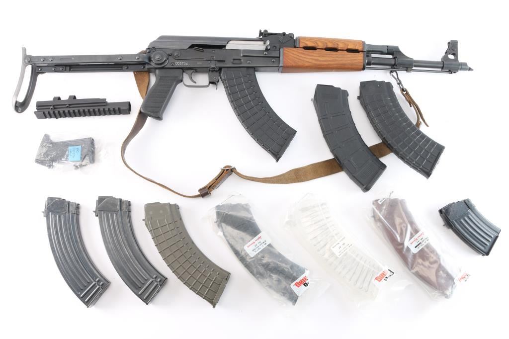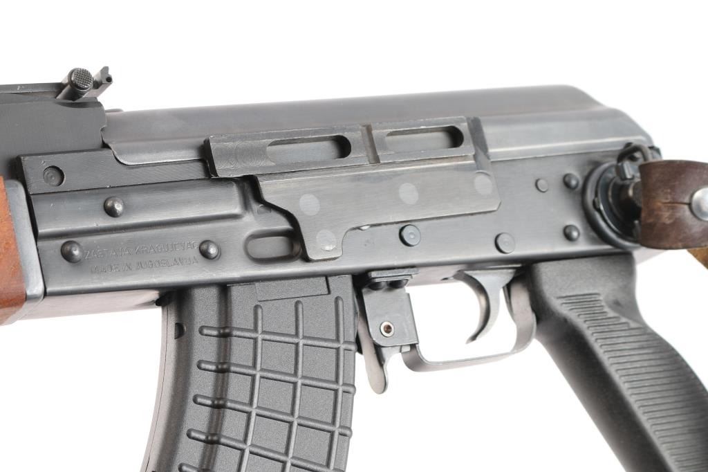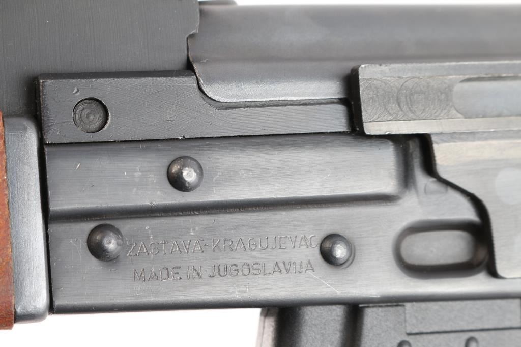 Pre-ban. ZASTAVA KRAGUJEVAC M-90-Yugoslavian copy of the AK-47 rifle chambered in 7.62x39mm. Very few of these rifles were imported to the United States.Semi automatic gas operated system with Adjustable Gas Block. Double stack bolt The original model designation scratched out with hand etched "M-90" over top. Features a blued finish, 16" chrome lined barrel, threaded with slant muzzle break, shrouded adjustable post front sight, adjustable tangent rear graduated sight, cleaning rod, steel under folding shoulder stock, sling points, safety selector switch, smooth trigger, grooved black polymer pistol grip and hardwood forearm, vented handguard. Rifle retains 98% matte blued finish with little wear. Action is smooth, bore is excellent/bright, the wood stocks are fine. Correct brown leather sling attached. One black polymer 30-rd magazine. Also included are six polymer 30-rd magazines, (Pro-Mag, PMAG) two steel 30-rd magazines, one steel 10-rd magazine. (10) Total. Magpul black textured pistol grip with screw and a Ultimak 7 1/2" optics mount, complete.