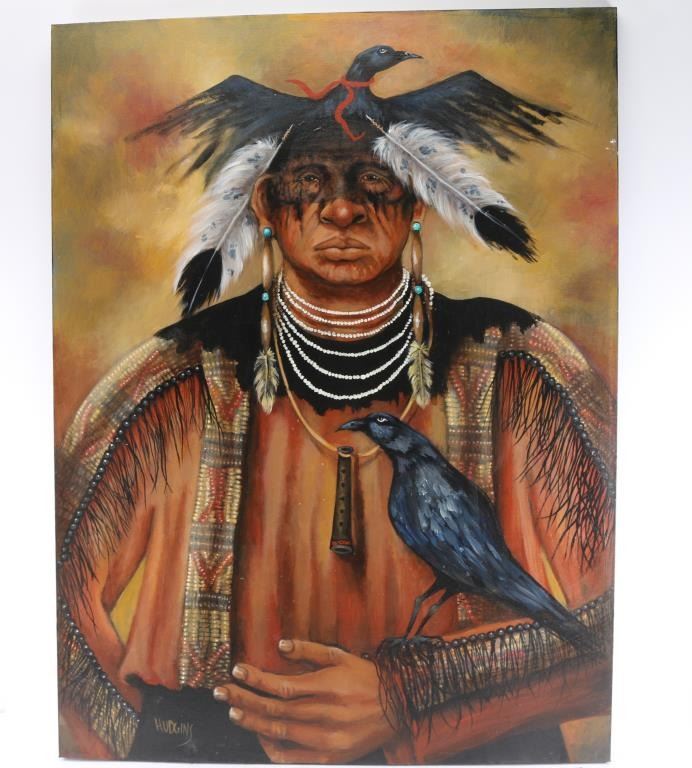Titled "Old Crow", by Native American artist Mary Margaret Hudgins. Signed lower left corner. Measures 4' by 3'.