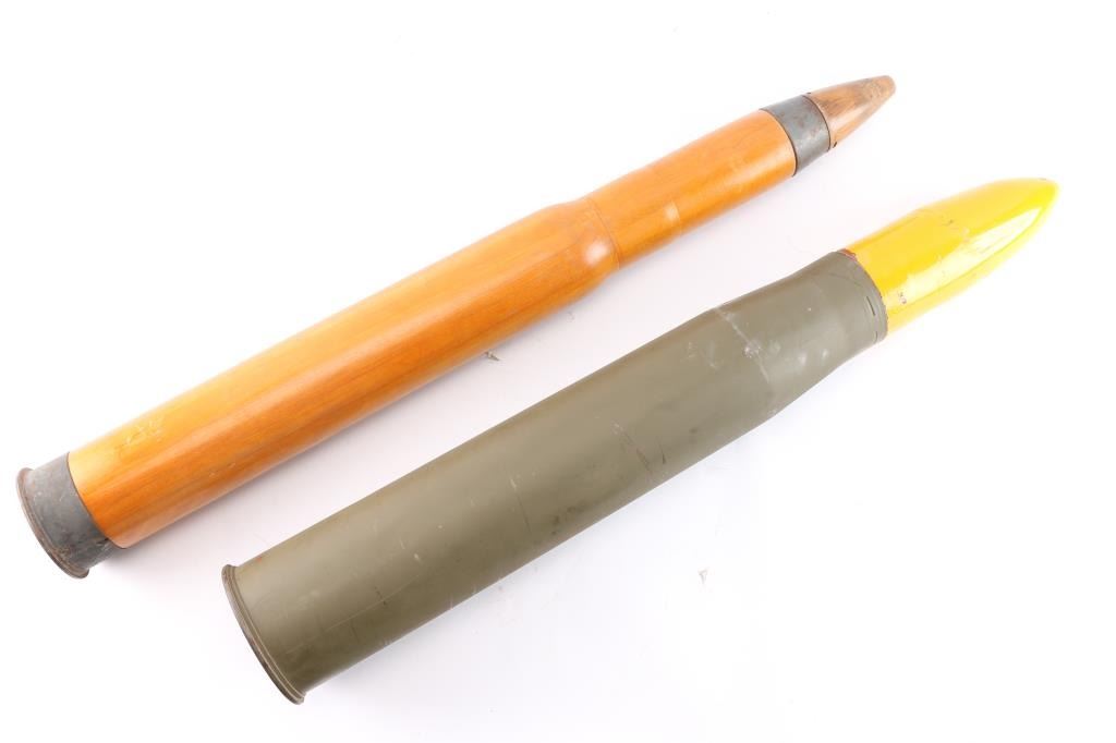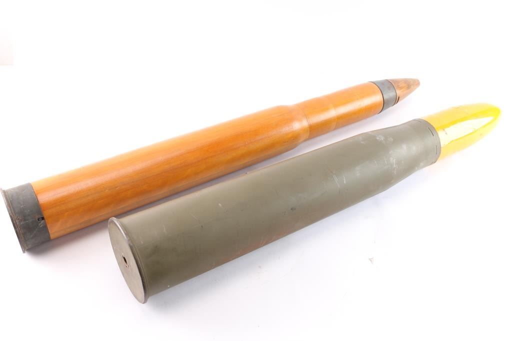 ***INERT*** 1) Wooden practice artillery round used in 3" cannon/50 Cal. Shell case head stamped, "329486 GFJ V.M.C. 1944 3" DUMMY CARTIDGE MK6 50CAL". These dummy cartridges were primarily used for training on the 3-inch/50 caliber gun. These guns were a common type of naval gun found on US Navy warships, especially during World War II. The dummy rounds were used to practice loading, handling, and firing procedures without using live ammunition, very good condition. 2) 90MM Display Round. Shell case head stamped, "90MM T24B1 LOT - FA - 16 - 4 1957. Projectile and shell case appear to be repainted. Good condition.
