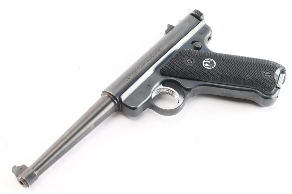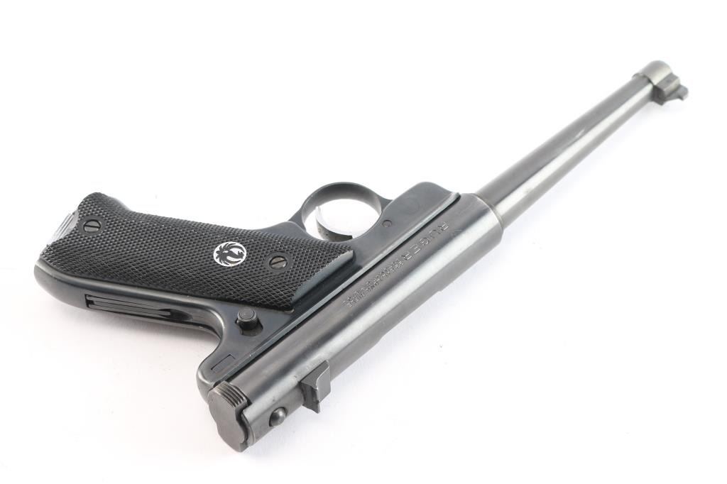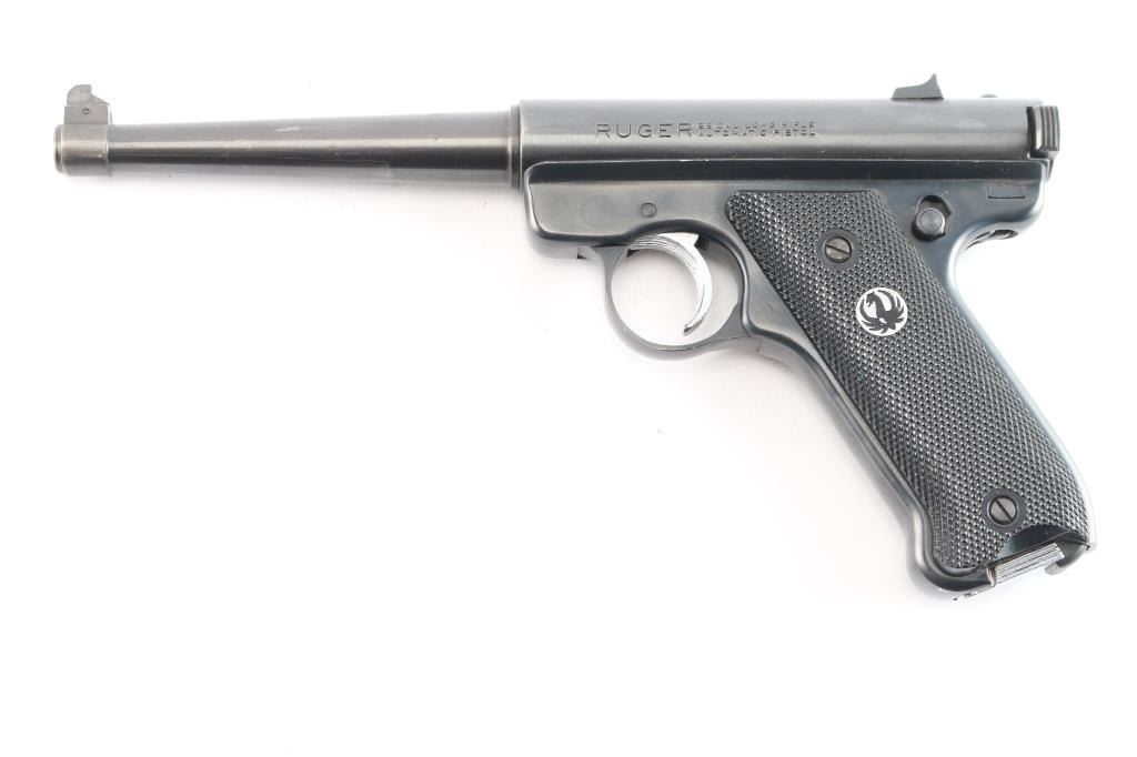 American made semi-auto blued pistol chambered for .22 long rifle ammunition, manufactured circa 1969. It has 6" tapered barrel, partridge front sight, dovetailed rear notch sight, silver tone serrated trigger, checkered black plastic grips with black/silver Ruger medallion on left panel, manual safety (also serves as manual bolt hold open), heel mag release. Bore is excellent/bright. Retains about 95% blued finish with minor scratches. Grips are excellent. Includes one magazine.