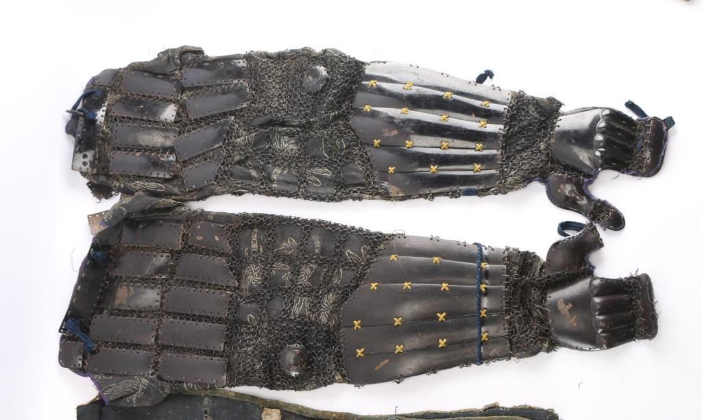 Japanese/samurai black lacquer armor chest. Measures 24 1/2"-L, 15 3/4"-W and 13 3/4"-H. brown lacquered interior with paper tag inside thl with Japanese writing in red. Contains a pair of Haidate (Thigh Guards) Edo period. Floral design white borders, black woven material. lacquered metal plates held in place by chain mail stitched to the material. Intact with some damage to the material. A pair of Japanese Samurai Armor Edo period Kote Iron Arm/hand Guards consisting of 24 small lacquered vertical metal plates attached to chain mail sewn to black mesh green silk material, five long plates on the forearm and metal handguards. Overall good/intact with Deterioration to the silk. A pair of Edo period similar to the above attached to black material with white toned floral designs. Missing the left handguard, and a pair of chain mail Kote with Paulownia (kiri) leaf crests on upper sleeves and handguards, also known as the Kiri-mon Crest, holds deep significance in Japanese culture, particularly for samurai families and those associated with leadership, nobility and high status. Historically, the Paulownia Seal was initially the private symbol of the Japanese Imperial Family, it was viewed as the second noblest crest after the Chrysanthemum Seal, Emperors granted the Paulownia Crest to samurai and other powerful individuals as a mark of honor and distinction, symbolizing their loyalty and noble lineage. Also Samurai clans adopted the paulownia crest as part of their family emblems (kamon). The paulownia crest is particularly associated with Toyotomi Hideyoshi, one of Japan's most prominent unifiers, who adopted it as his family crest. Kote also has 10 metal symbols including the Hoshi (Star), three Tomoe, etc. Hinged top plate, green silk backing with floral designs. Overall very good condition.