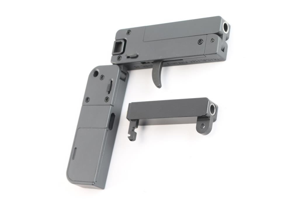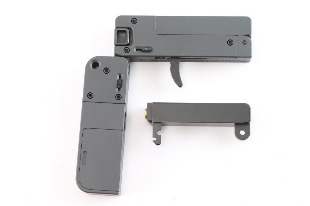 Unique & discreet single action single-shot pistol chambered in .22 Magnum and folds to the size of a stack of credit cards. Features steel & aluminum construction with a Sniper Grey finish, 2 ½” tip-up barrel with full-length grooved sight, linear hammer with cocking tabs on the rear, curved trigger, and smooth grip with 3 round storage compartment & lanyard loop. Includes the original factory cardboard box with outer sleeve, documents, lock, and spent case. Also includes a black finished .22 Long Rifle conversion barrel with tin case. Pistol retains nearly all of its original finish and shows no signs of use. The action is mechanically sound and the bore is excellent.