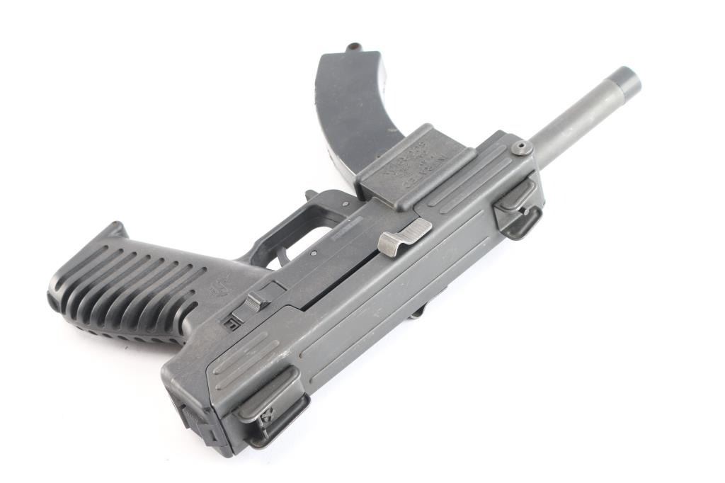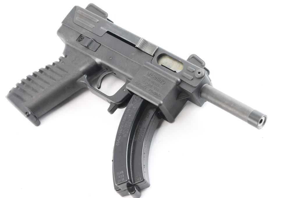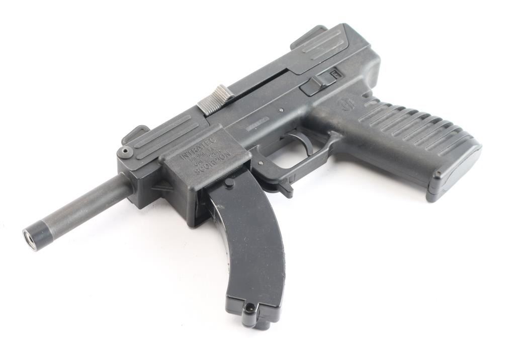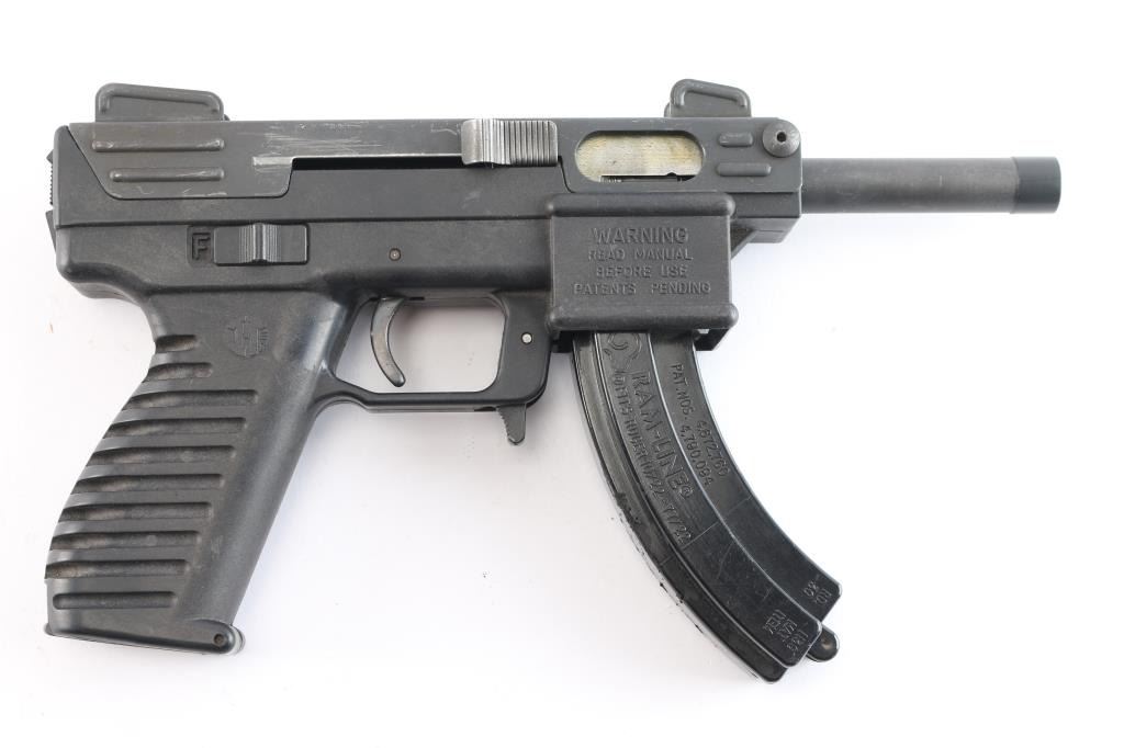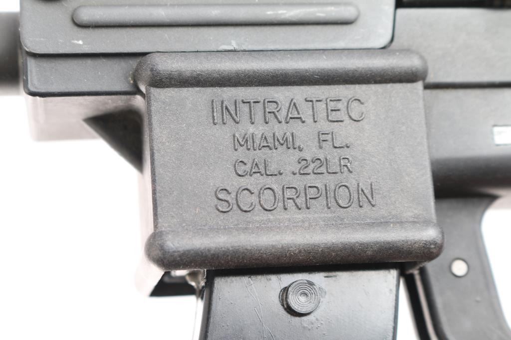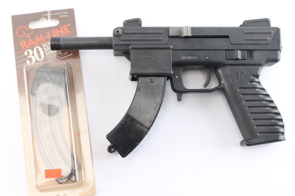Semi-automatic RF pistol. TEC- 22 blowback-operated pistol that takes 10/22 magazines. Ambidextrous safety, and charging handles. Single piece frame is molded ABS plastic. Stamped steel receiver cover with open iron adjustable sights. Storage compartment in grip. 4" barrel with universal suppressor cut threaded muzzle with cap. Matte black finish. Bore is excellent/bright. Metal finish has some minor scratches/rubs. Action is crisp/tight. Comes with a plastic Ram-Line 30-rd double magazine and a second 30-rd Ramline magazine still in packaging. Manufactured 1988. (1988-94 production).