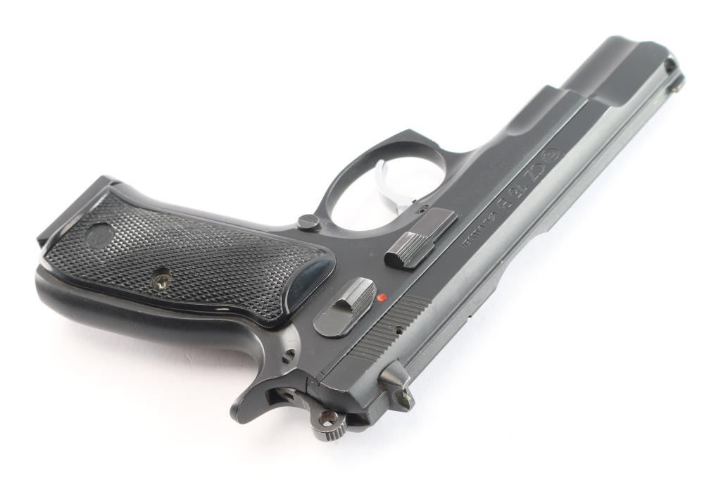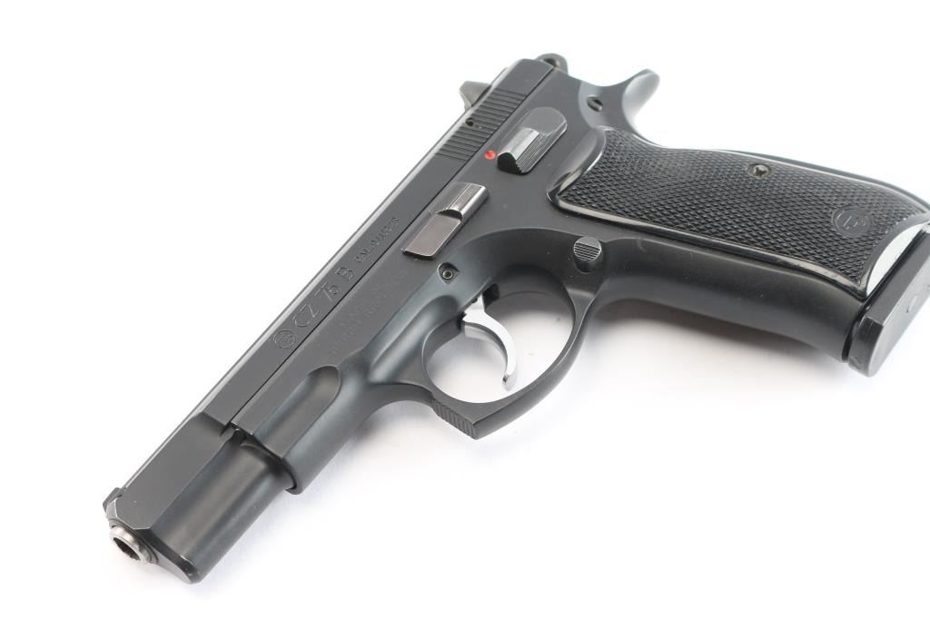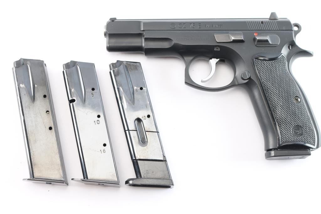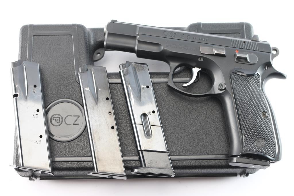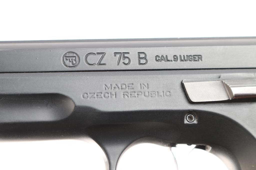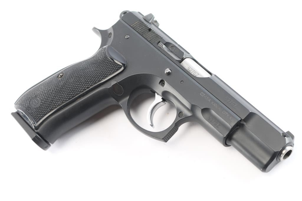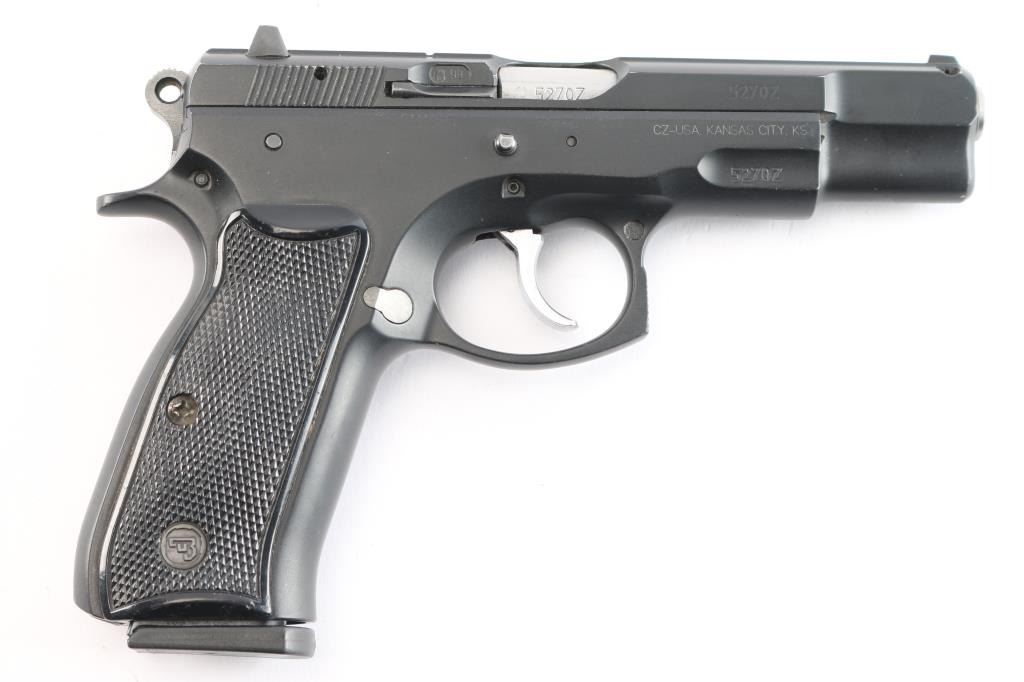 Czech made DA/SA semi-automatic pistol chambered in 9x19mm. Imported by CZ-USA of Kansas City, K.S. with import marks on the right side of the frame. Features a matte black Polycoat finish, 4.5" barrel, white dot front sight with drift adjustable rear sight, smooth silver tone trigger, serrated round hammer spur, frame mounted safety, steel frame, push button magazine release, two-piece checkered black rubber grips with CZ insignias. Bore is excellent/bright. Retains 98% finish, with minor handling marks. Grips are very good condition. One magazine, 15 rd capacity. Numbers match on frame, slide, barrel. Comes in factory hard case with three spare magazines, 4 total.