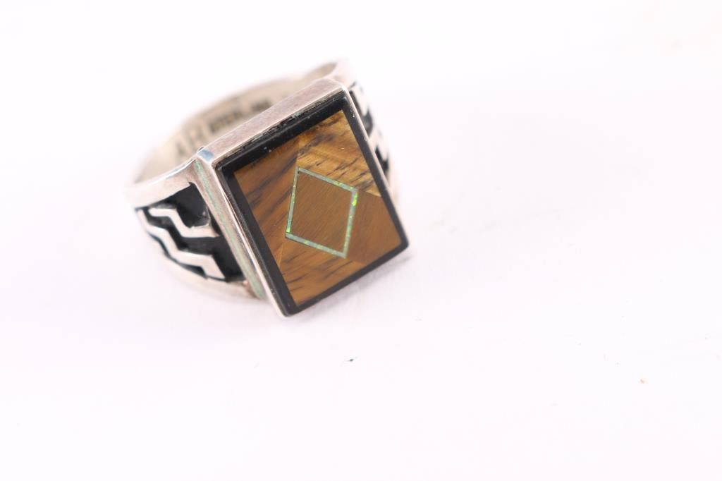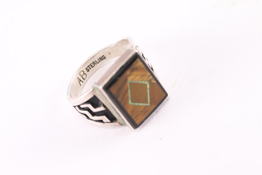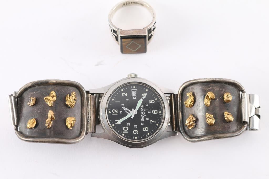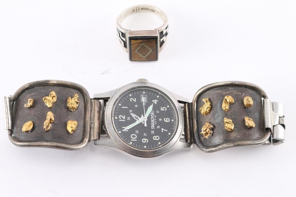 Ring is inlay tiger's eye in large square set in sterling silver with incised design on sides. Size 10 1/4". Watch is unmarked silver with 6 gold tone nuggets on each side of swarovski watch face. Flex band on watch.