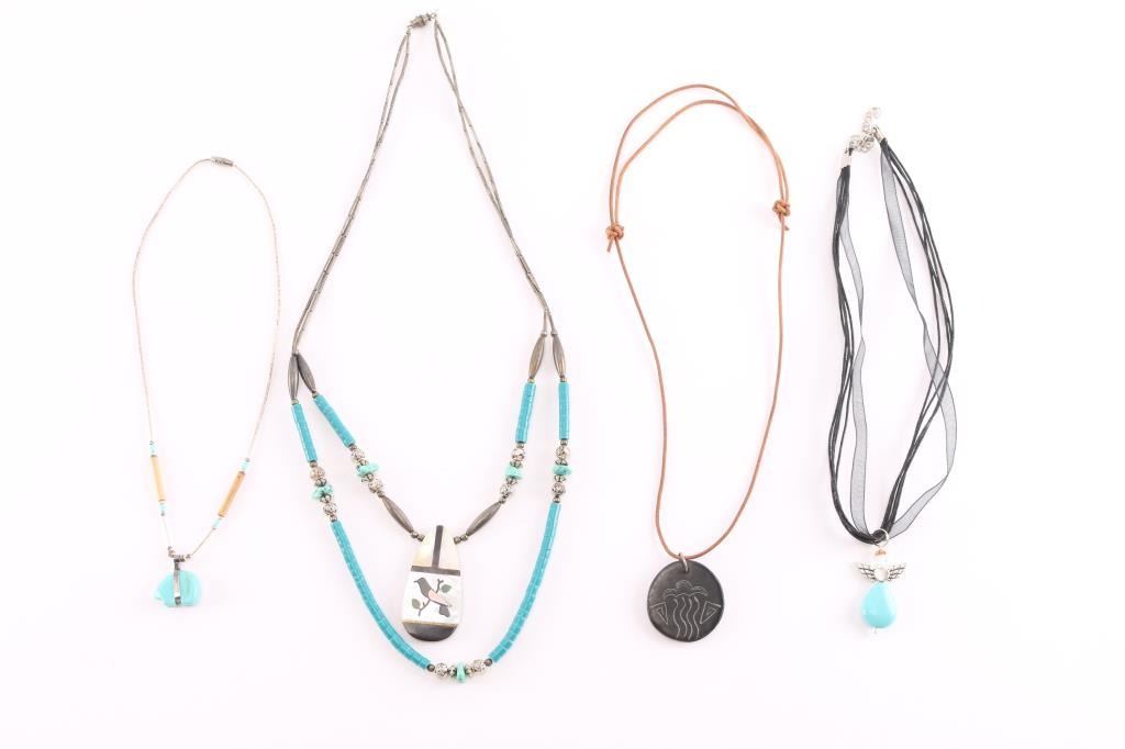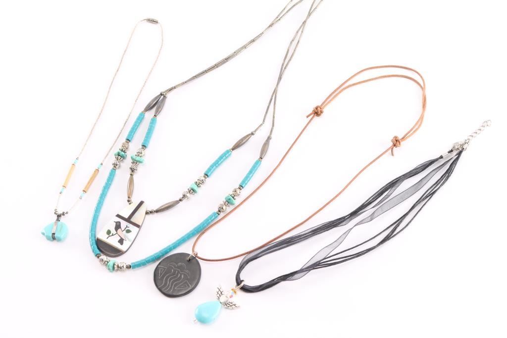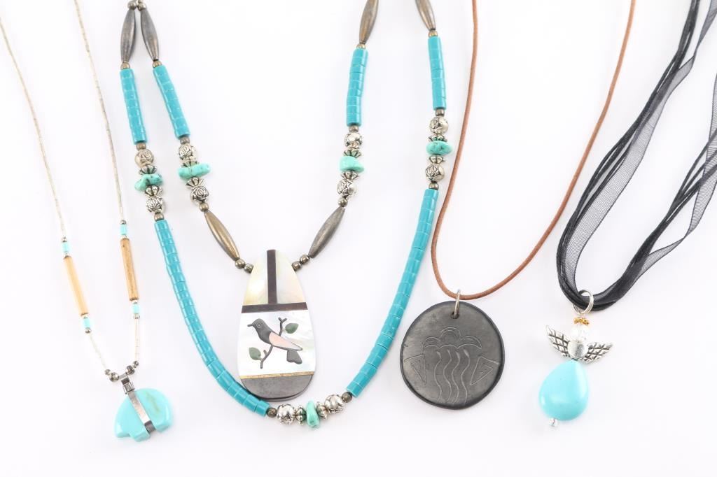 Measure 8", 9", 10" and 12" from drop. The longest has turquoise nuggets and beads and is sterling silver with inlay mother of pearl bird design.
