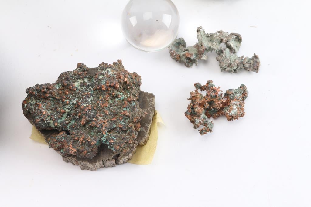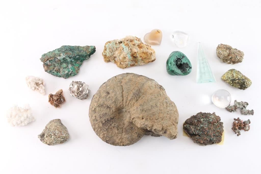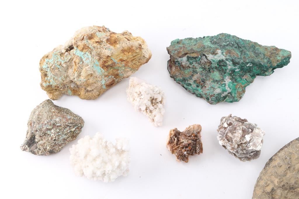 Malachite, Quartz, Royston Turquoise, Fools Gold, Native Copper from Bisbee AZ, Sea Snail Fossil, and others.