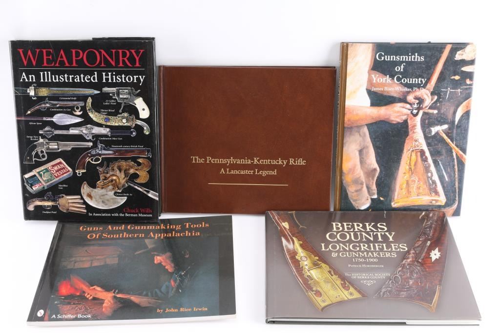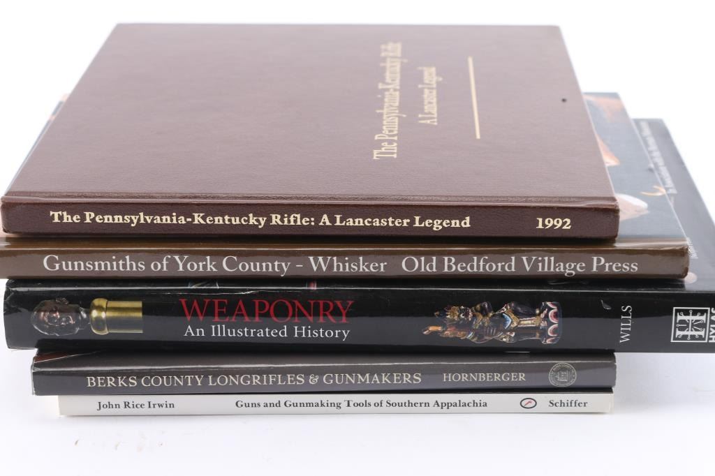 Includes: Berks County Longrifles & Gunmakers 1750-1900 (1st Ed.) by Patrick Hornberger; The Pennsylvania-Kentuck Rifle A Lancaster Legend Limited Ed. (No. #73 of 800 copies) by J. Wayne Heckert & Donald Vaughn; Weaponry An Illustrated History by Chuck Wills; Guns And Gunmaking Tools of Southern Appalachia by John Rice Irwin; Gunsmiths of York County by James Biser Whisker.