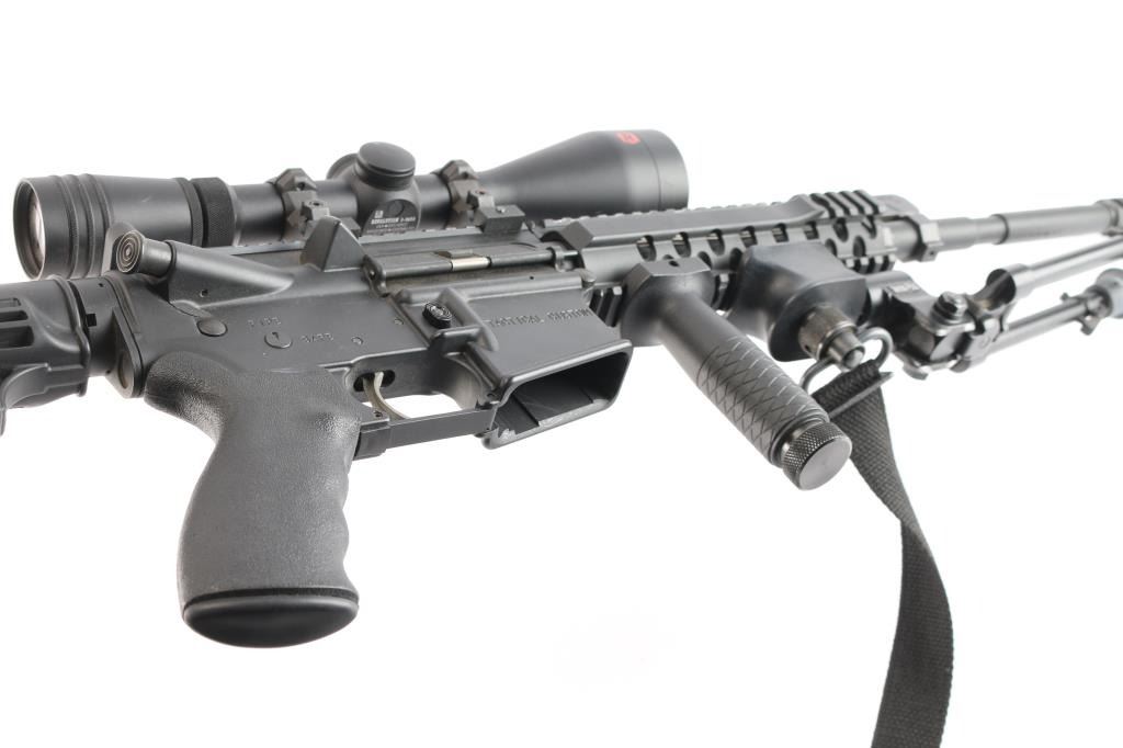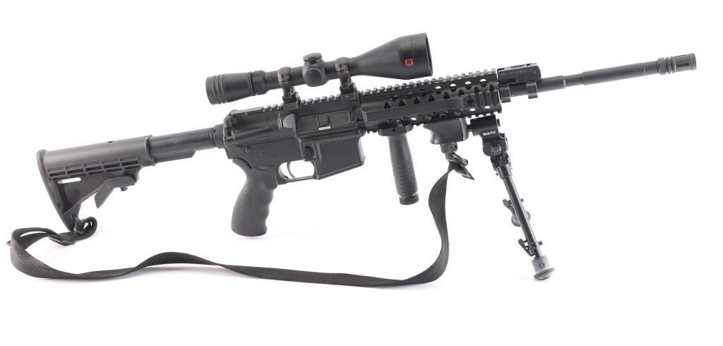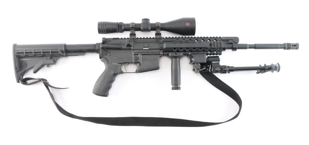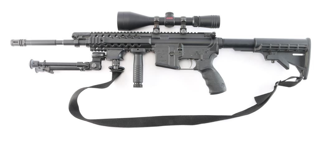 Gas operated semi-automatic AR15 platform modern sporting rifle chambered in 5.56x45mm NATO. Features a matte black finish, 16.25" 1/9 twist M4 profile barrel, Wilson Combat flash hider, carbine length gas system, Wilson Combat A2 flip front sight/gas block with bayonet lug, flat-top upper receiver with forward assist, shell defector & dust cover, push button magazine release, manual safety, black rubber textured ergonomic pistol grip, collapsible shoulder, Wilson Combat quad hand guards with 2 side shields, and 2 rails, forward sling swivel, Versa-Pod bipod and vertical grip installed lower rail, sling slot and QD swivel socket on butt. Black nylon sling attached. Mounted with a Redfield 9-9X50 scope, circle X reticle, clear optics. Bore is excellent/bright, action is smooth, overall condition is excellent.